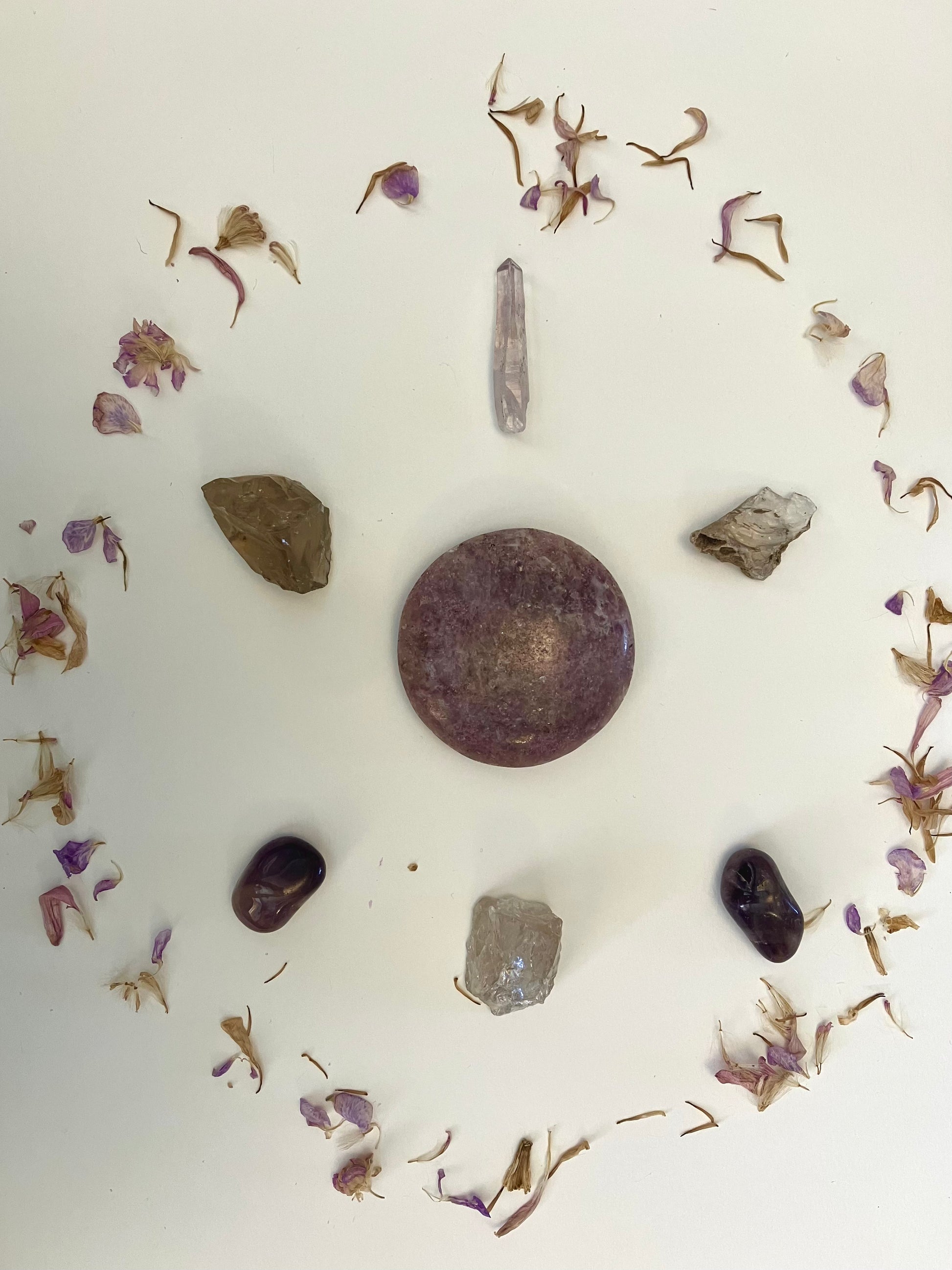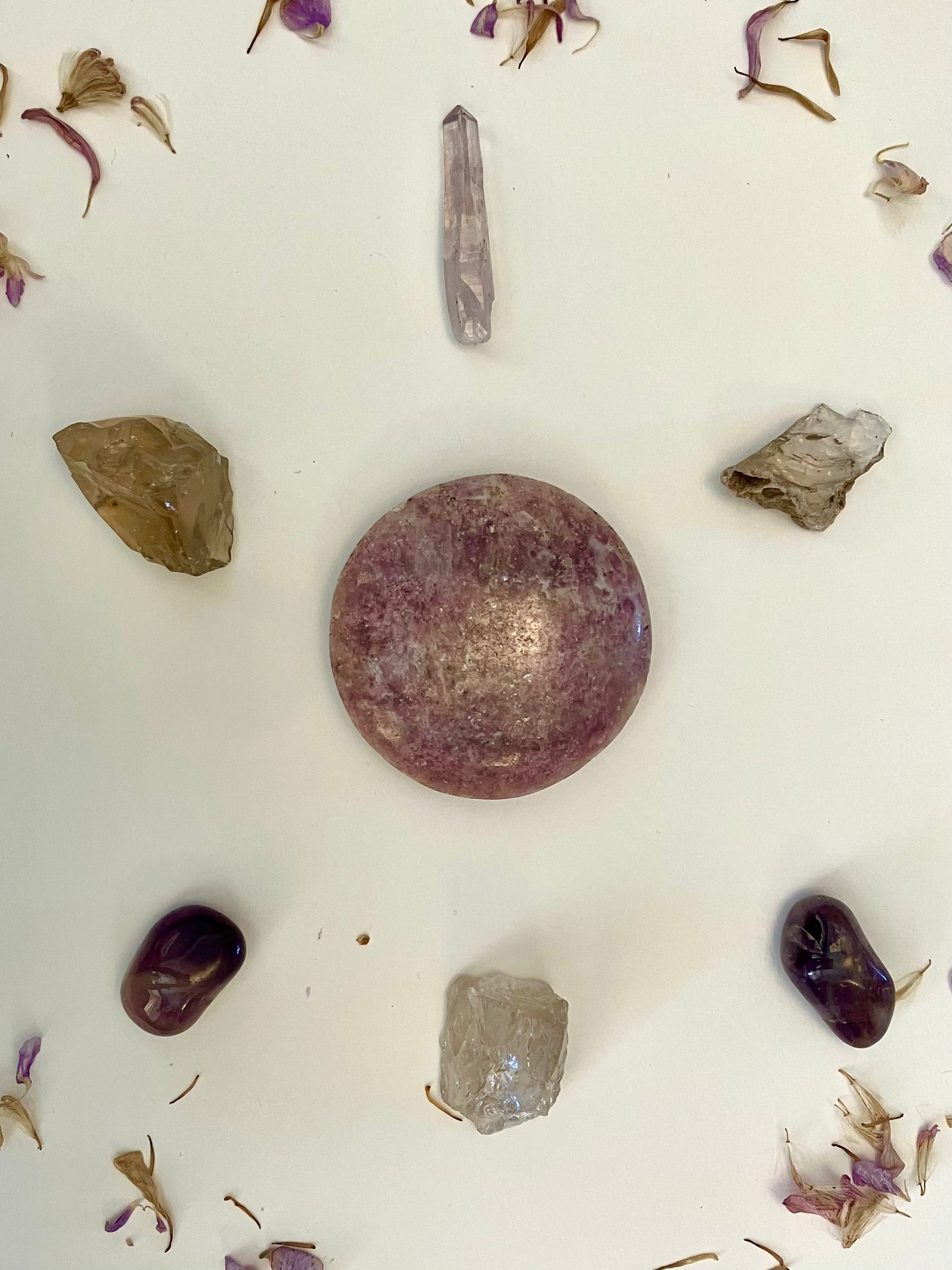 The keystone is a lepidolite palmstone sphere, and is a fair weight and size (which I will add) - it fits in the hand and is so beautifully calming. Lepidolite contains traces of lithium, which helps to bring the purplish pinkish hue. Lithium is something that has been harnessed in the pharmaceutical world in anti anxiety and depression medication, when being around it’s energy without ingesting it (alongside other harmful chemicals) we can still feel it’s relaxing effects and it will vibrate on a high frequency bringing perfect calm and gentle healing to your life.