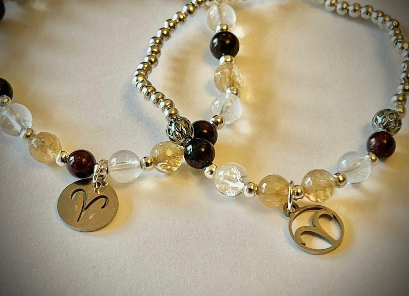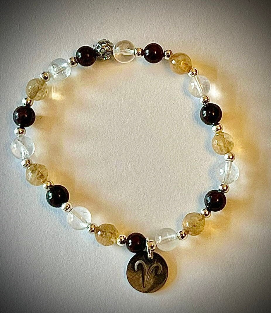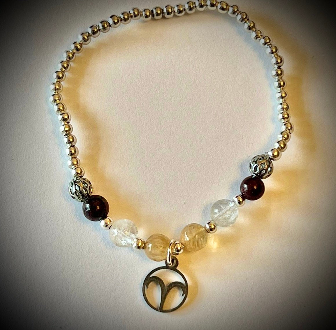 Aries charm birthstone bracelet. TWO OPTIONS. Citrine, clear quartz, garnet. Zodiac birthday gift. Self esteem, self confidence