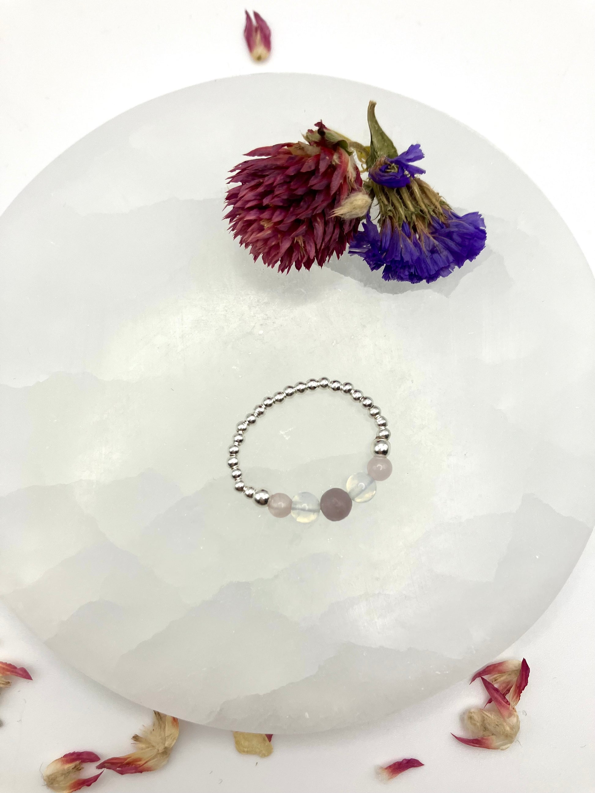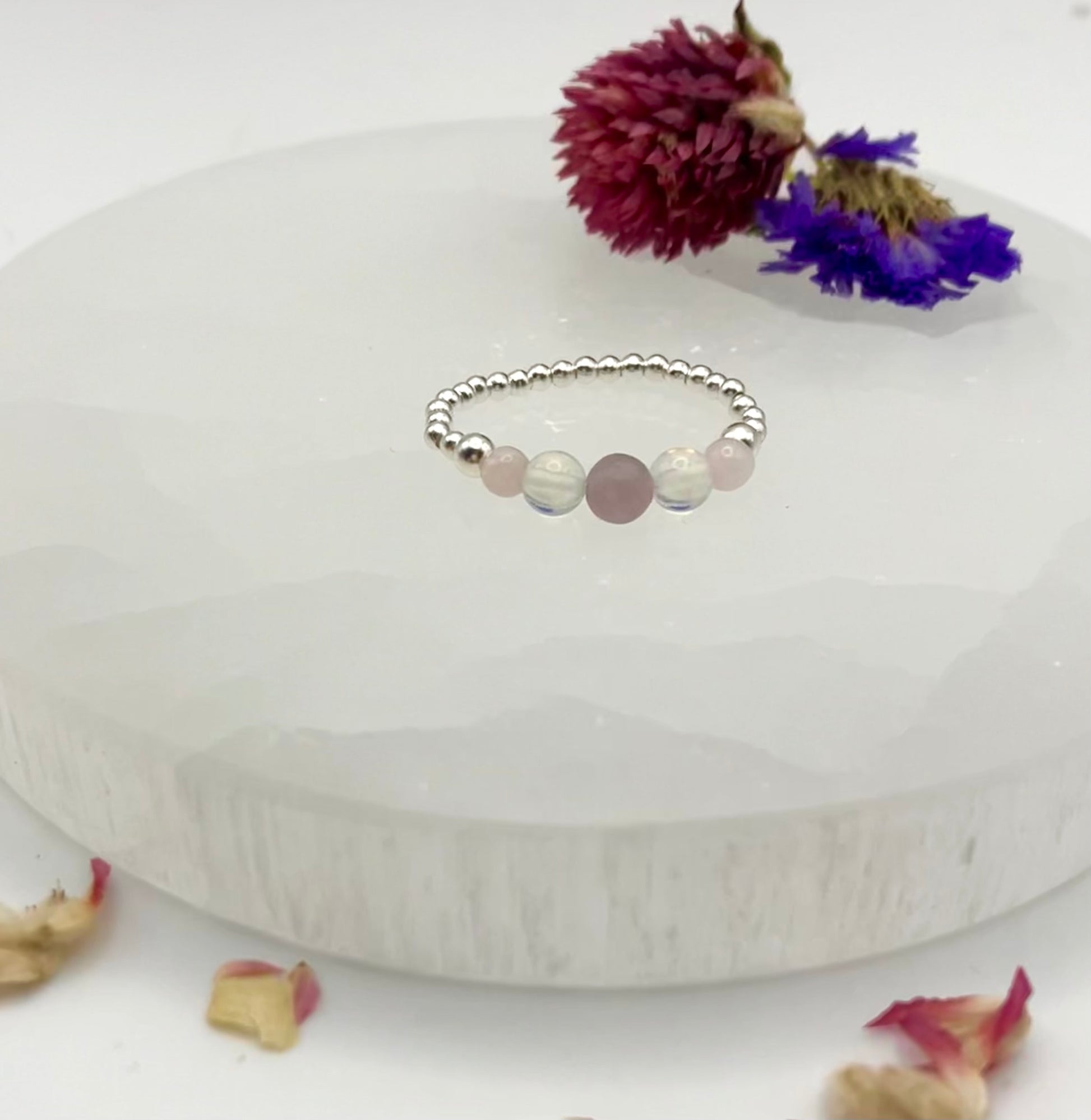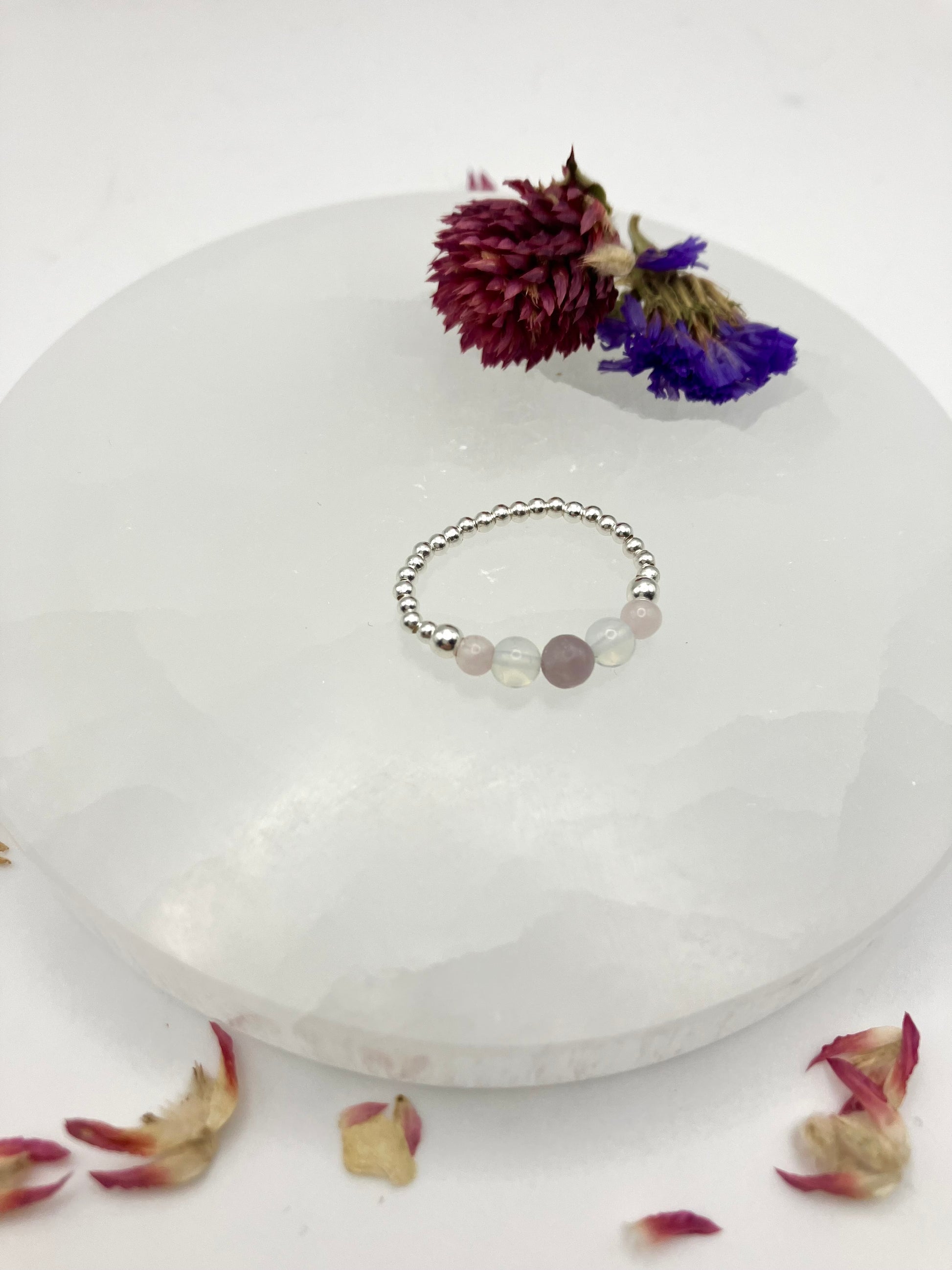 Love and self care - Lepidolite, Opalite and rose quartz. Sterling Silver handmade stretch stacking ring.