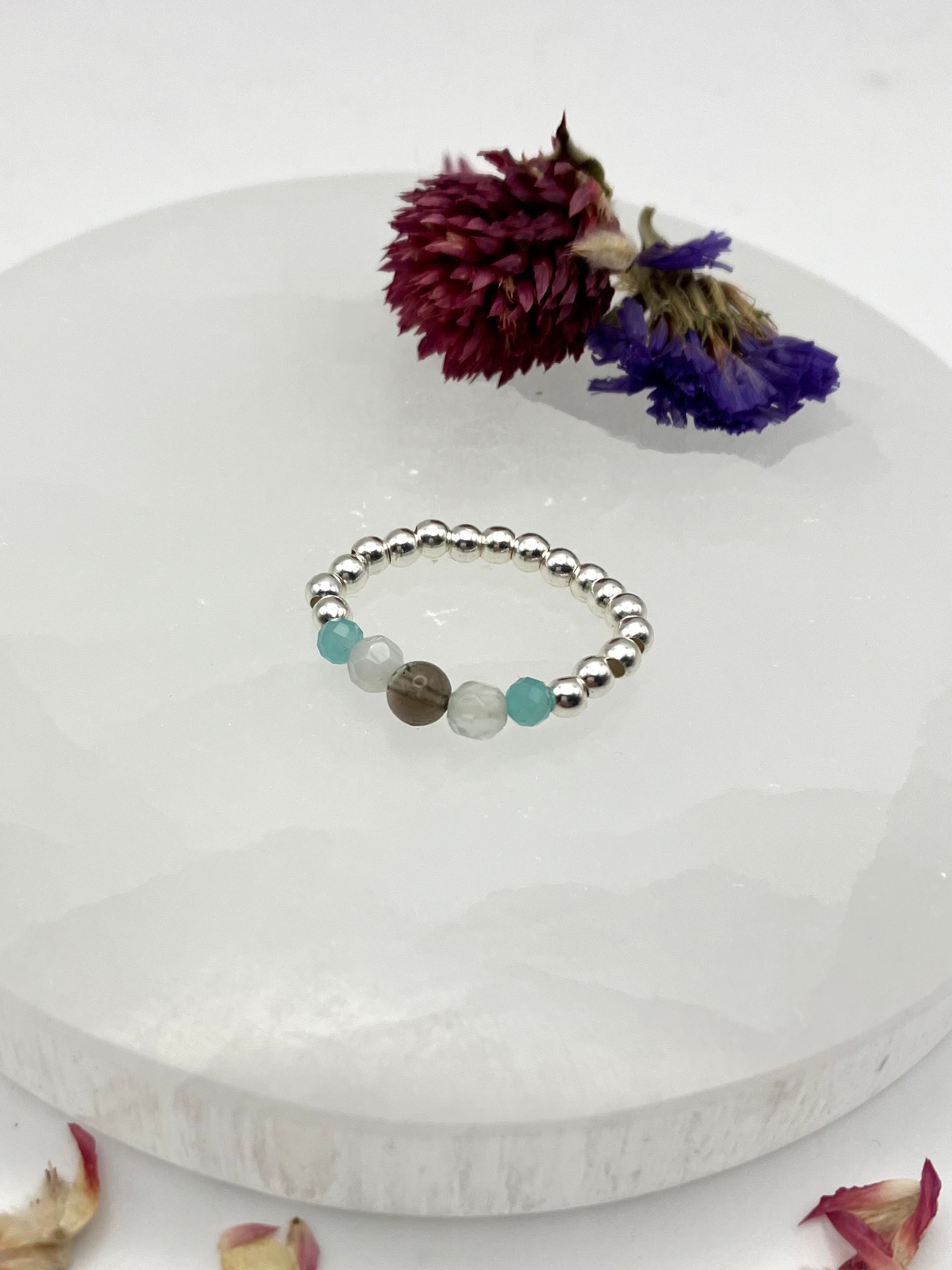 Smoky quartz and Amazonite. Sterling Silver handmade stretch stacking ring.