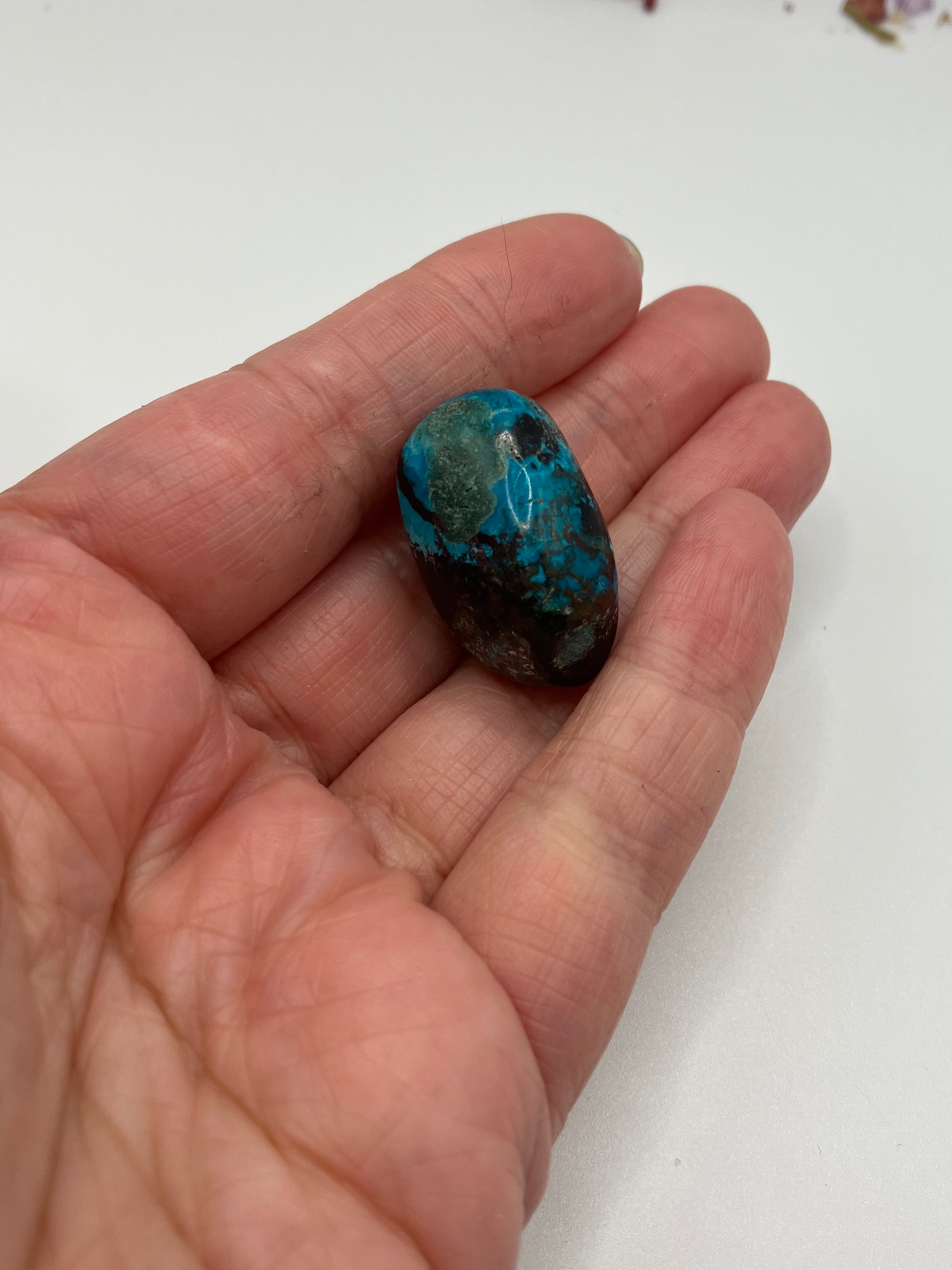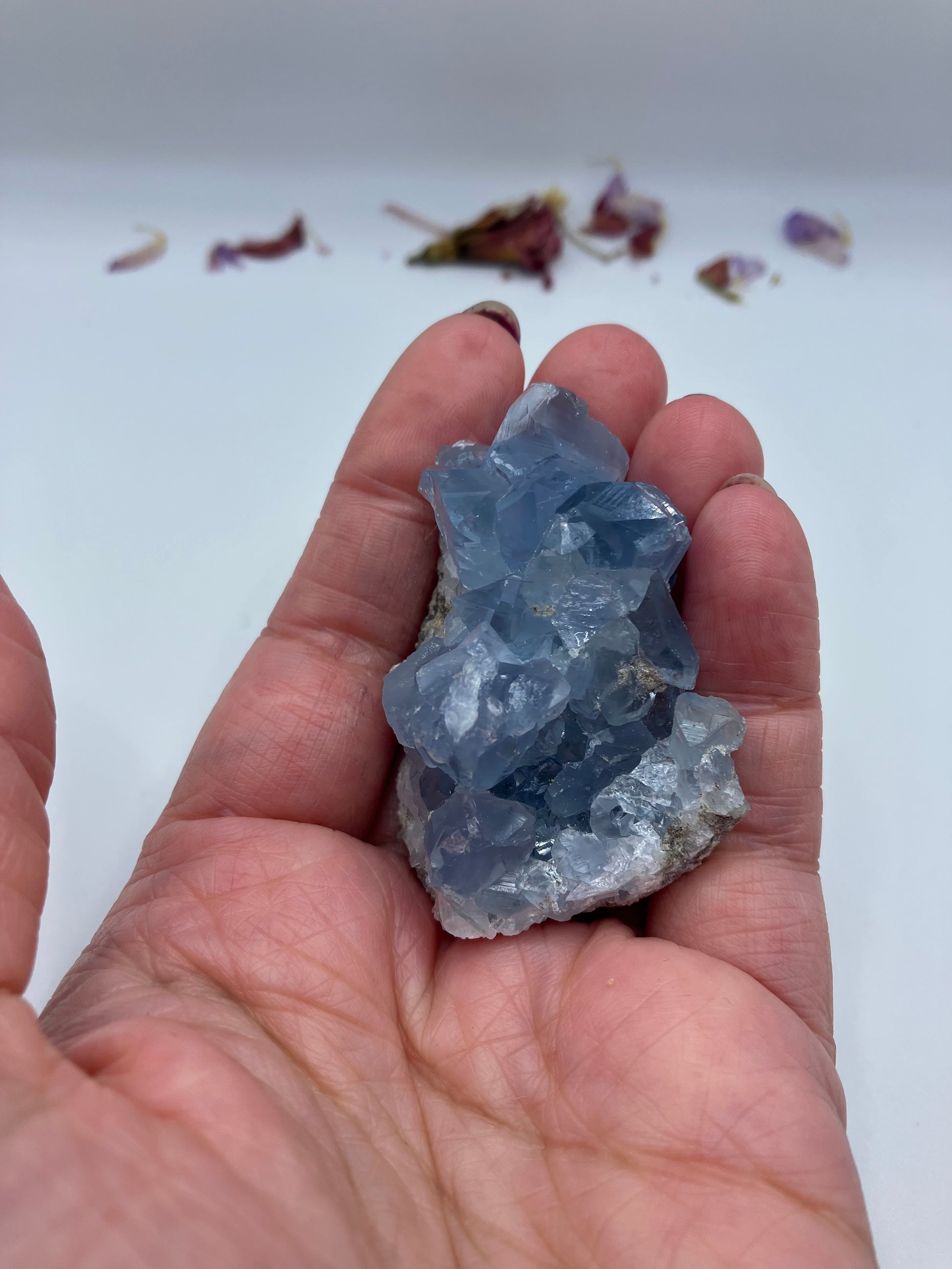 Chrysocolla, amazonite and labradorite tumble stones make up an downward trainable around the celestite. Labradorite works with the third eye to open up intuition but is also protective, reflecting negative energy away from you. Chrysocolla brings to us the Intuition of when to speak up, and when to stay silent, it will help you to discern which situations are worth sharing your truth, and which are not worth the energy. Amazonite is a stone of linking the heart and head, sometimes we present a version of ourselves that we think people expect to see, using Amazonite will help us to release this and start to think I’m a way that better aligns with our feelings.