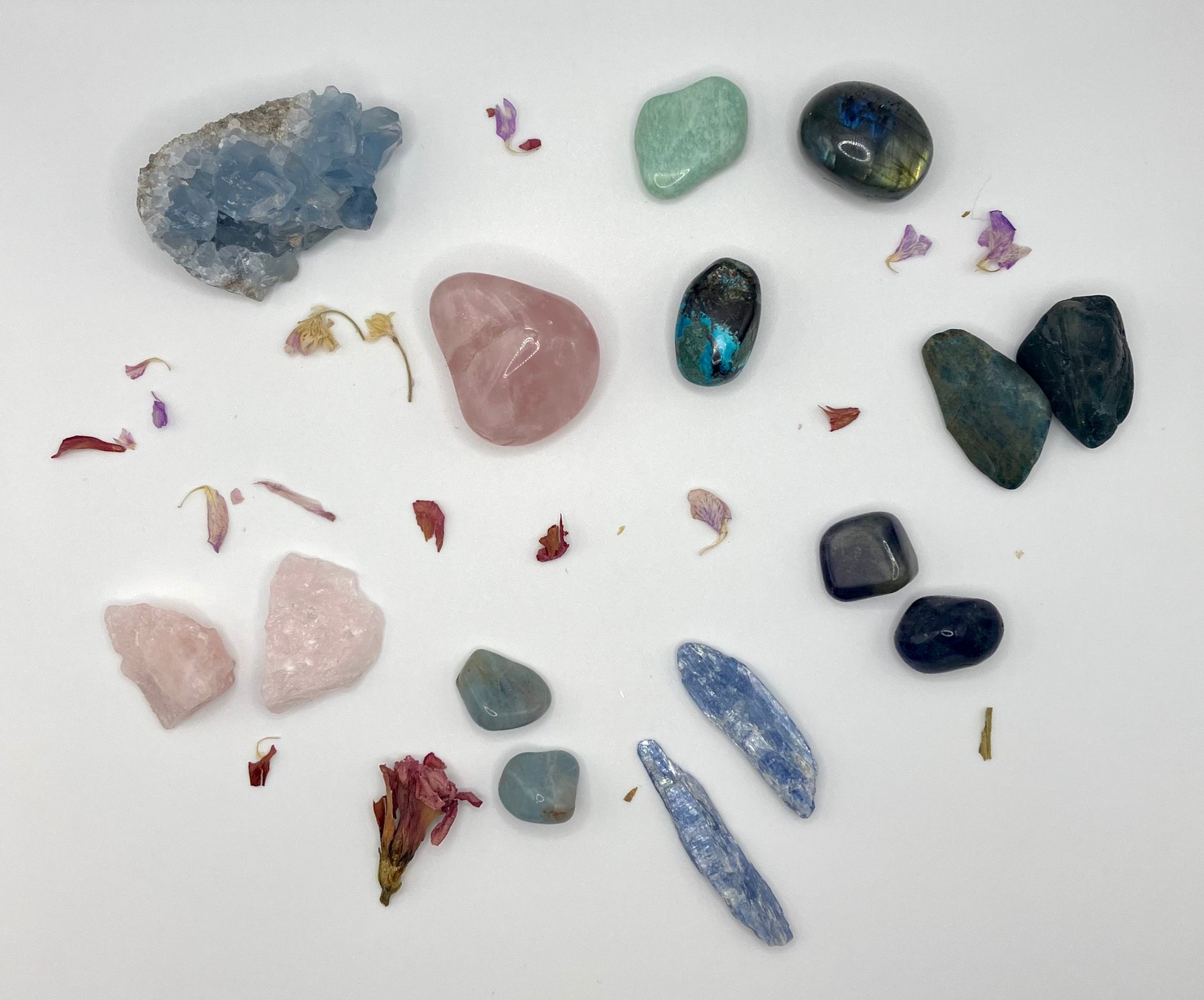 This crystal grid set is strongly related to the throat chakra, but also links the throat with the heart, higher heart (thymus) and third eye. I feel that this is for someone who is developing spiritually. Perhaps you have been working a lot on healing the lower chakras, and these are now balanced for the most part, but you are ready to begin working on the higher chakras. You feel like you are wanting to move forward but maybe aren’t quite sure where, and need to add a bit of confidence to keep going forward in your journey.