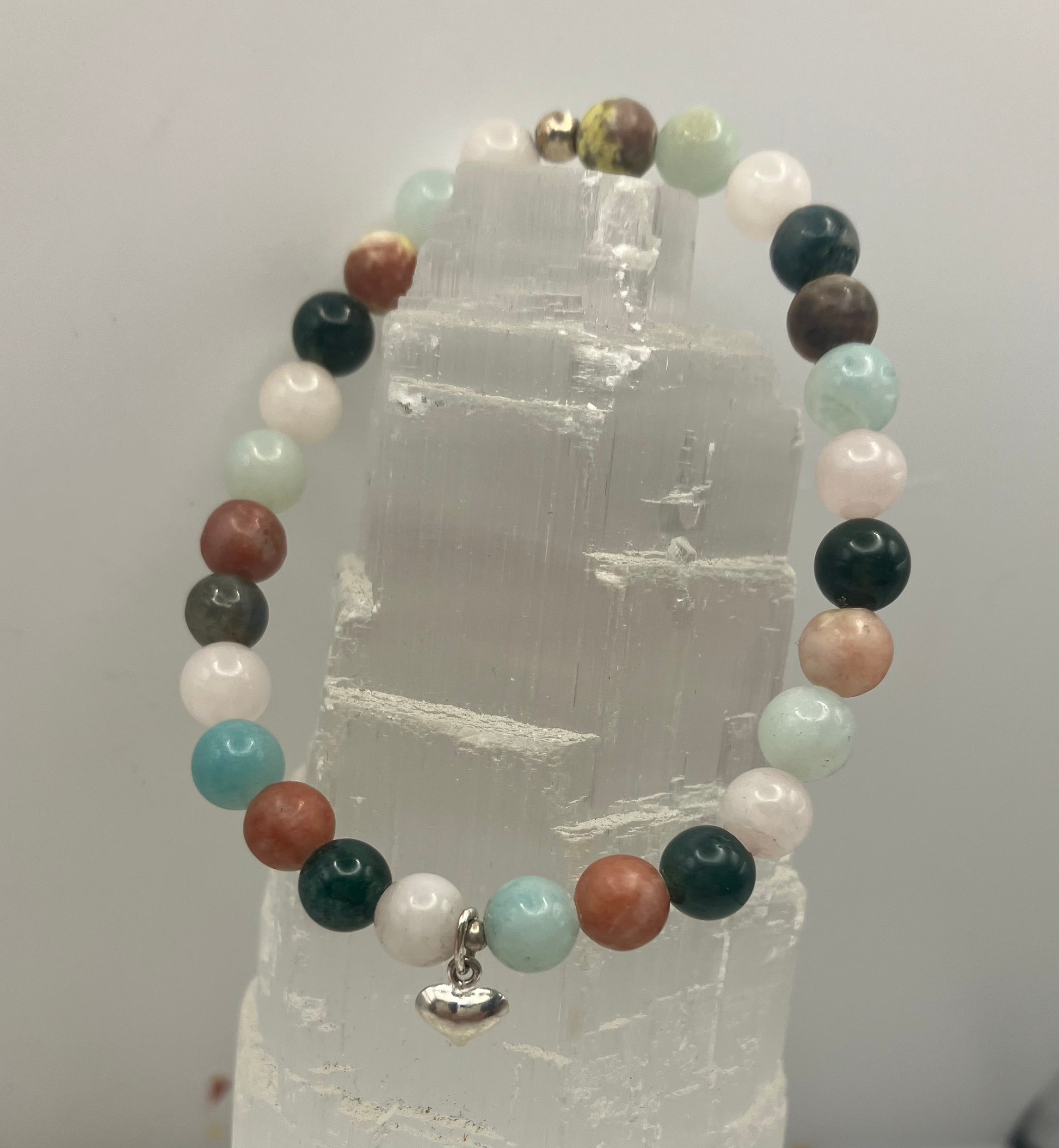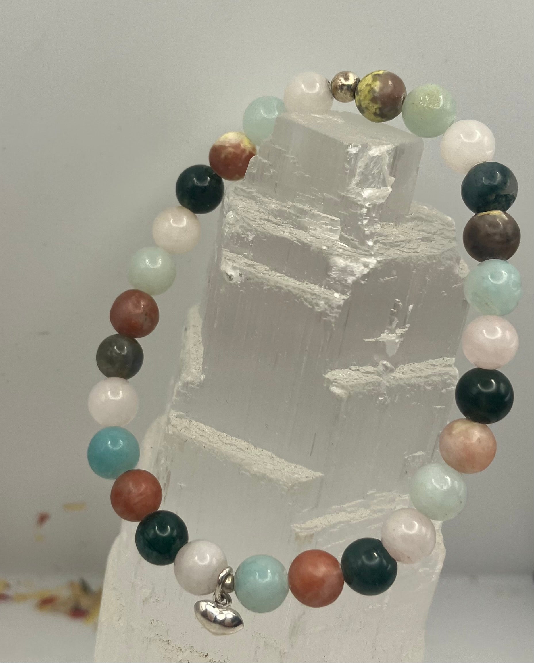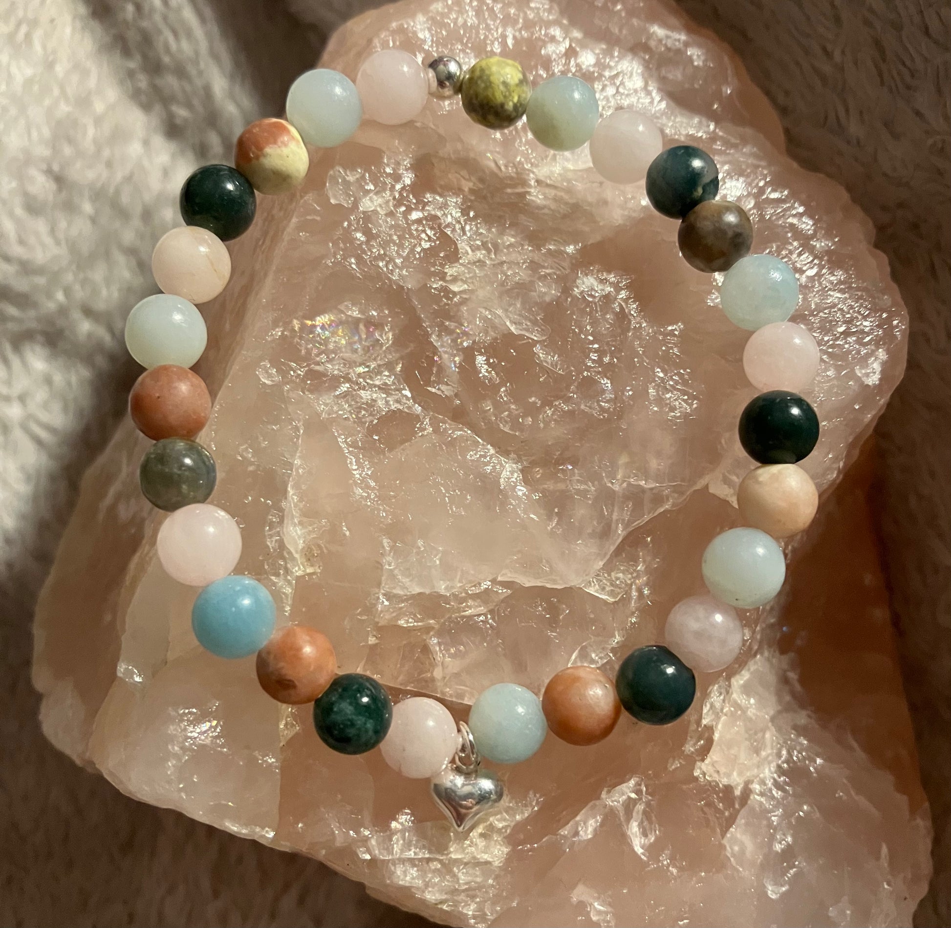 Crystal heart chakra healing bracelet. Amazonite, Moss Agate, Rose Quartz, Lepidolite 6mm. 925 sterling silver and real gemstone beads.