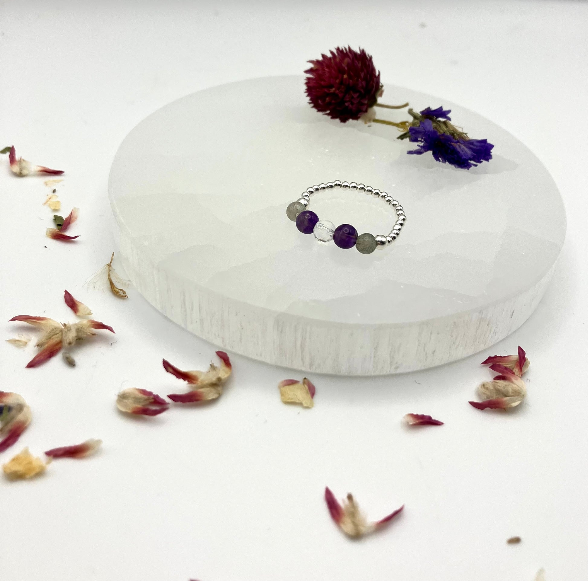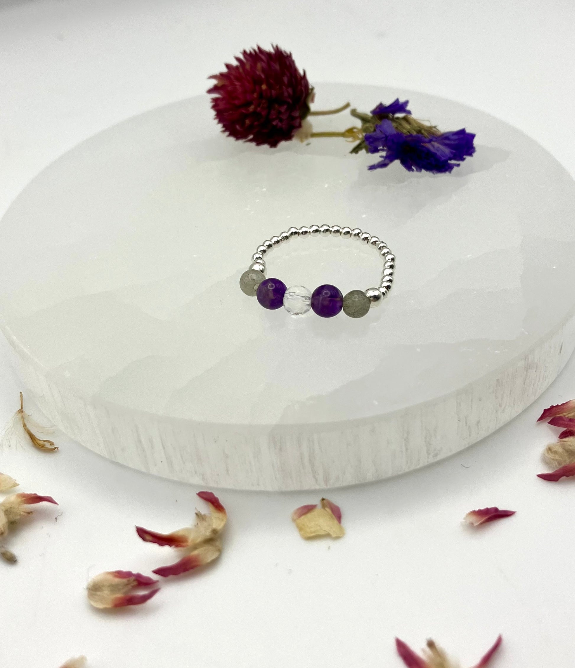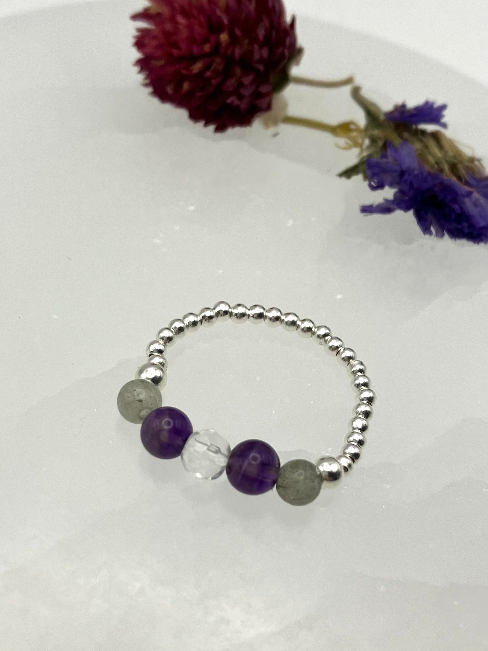 Crystal Dreams - Amethyst, Labradorite, Clear Quartz. Sterling Silver handmade stretch stacking ring.