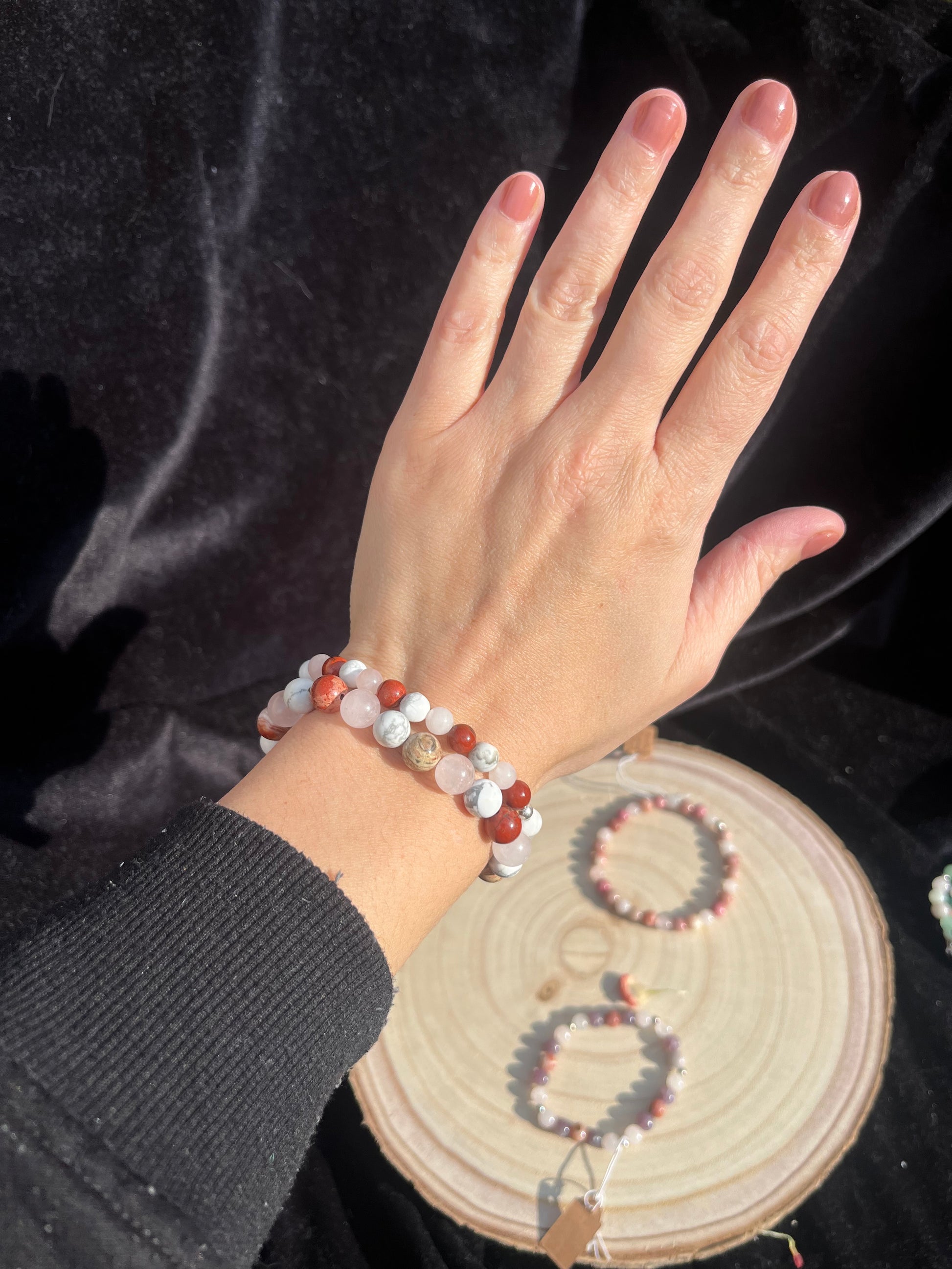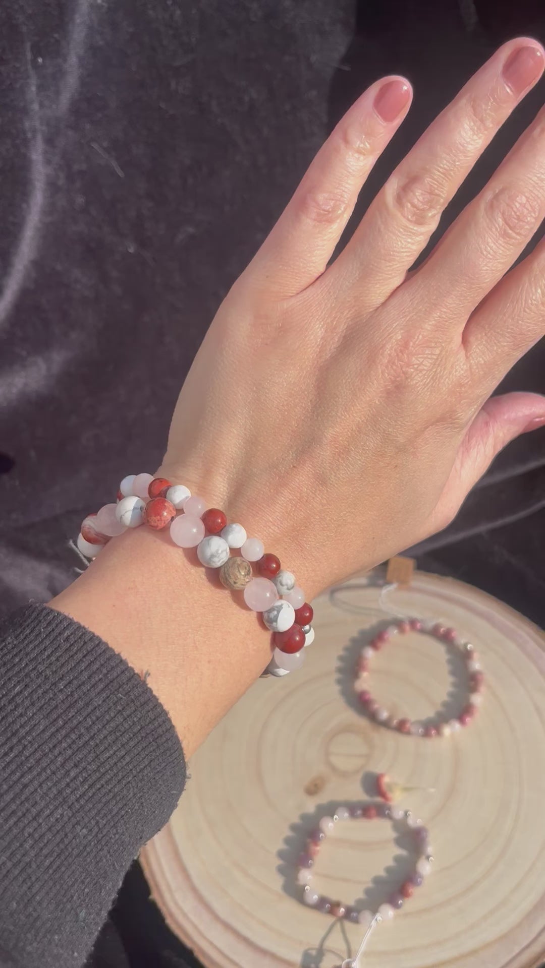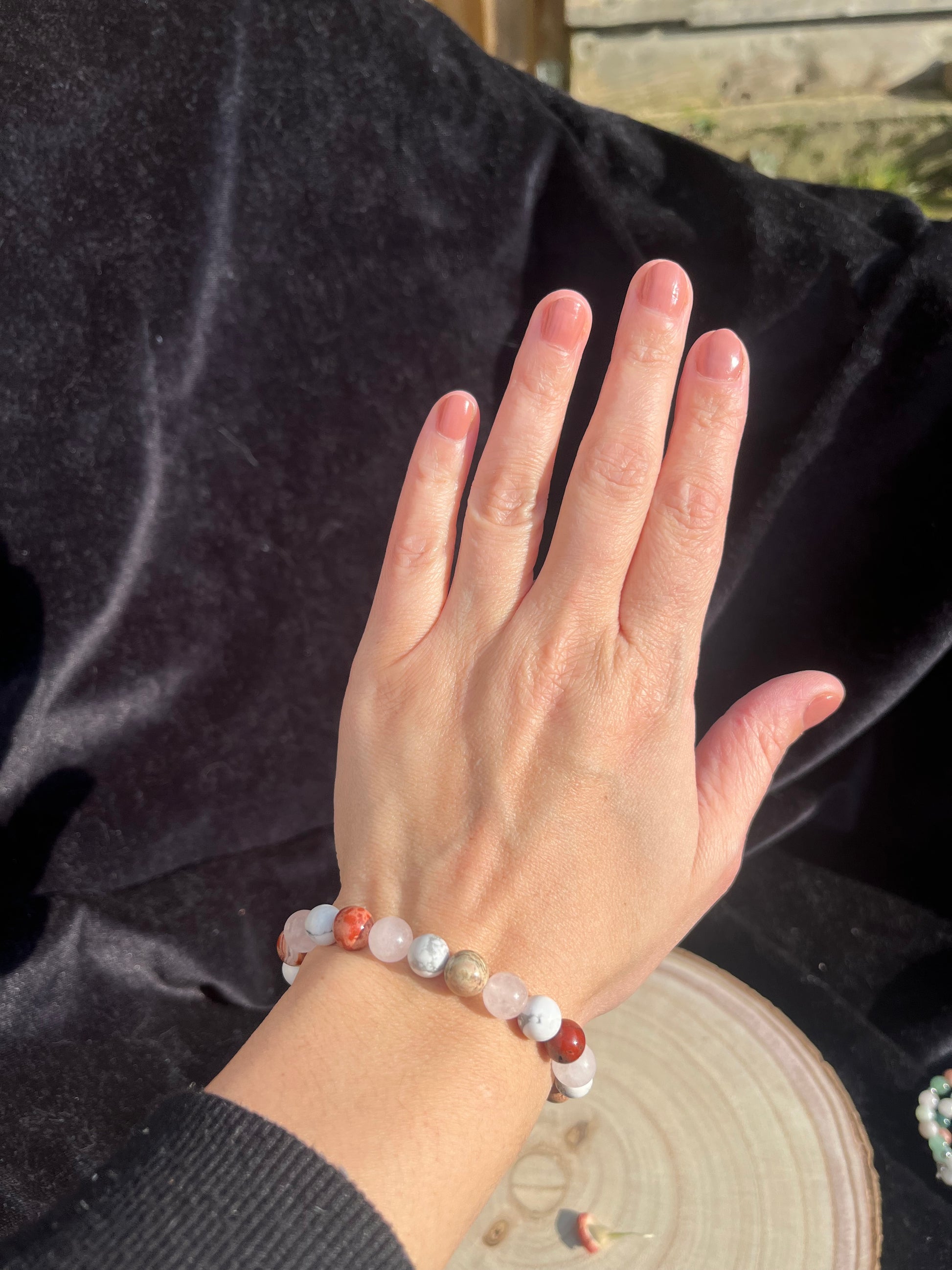 ‘For Love’ crystal healing bracelet 8mm Rose Quartz, Pink Red Jasper and Howlite. 925 sterling silver and real gemstone beads - Medium.