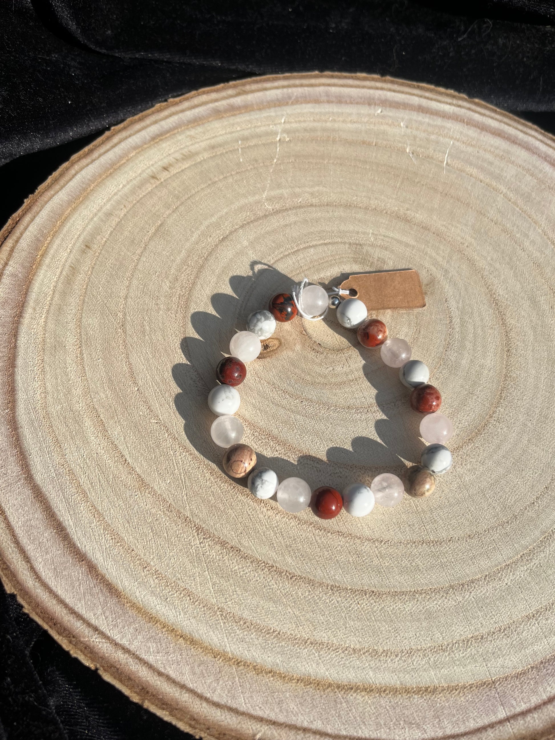 Lovely blend of crystals working with the crown (howlite), heart (rose quartz) and root (red jasper) chakras to balance the whole body ready for love. Will help to dissipate any anxiety around love and letting yourself go to find new love, being open and honest.