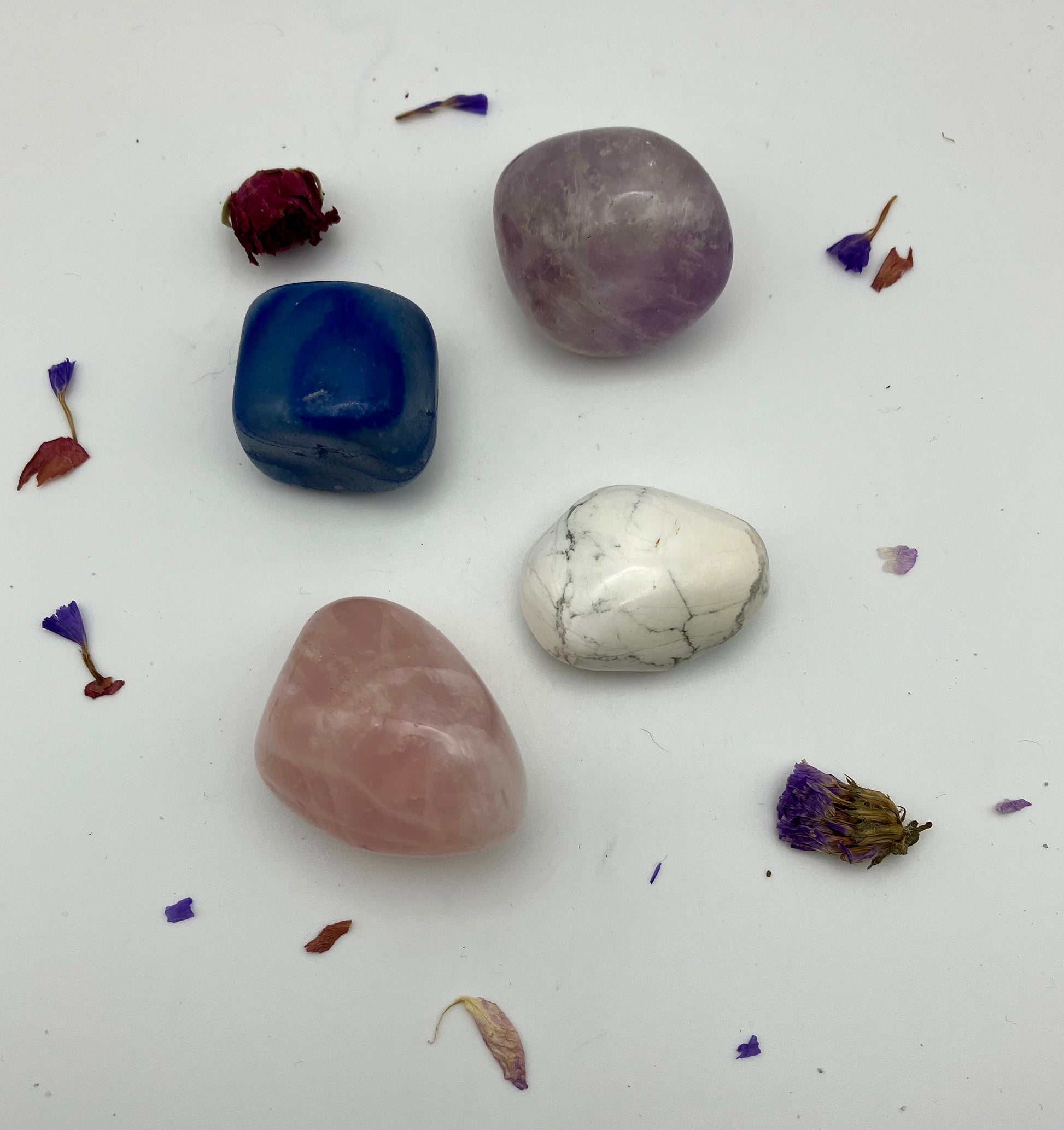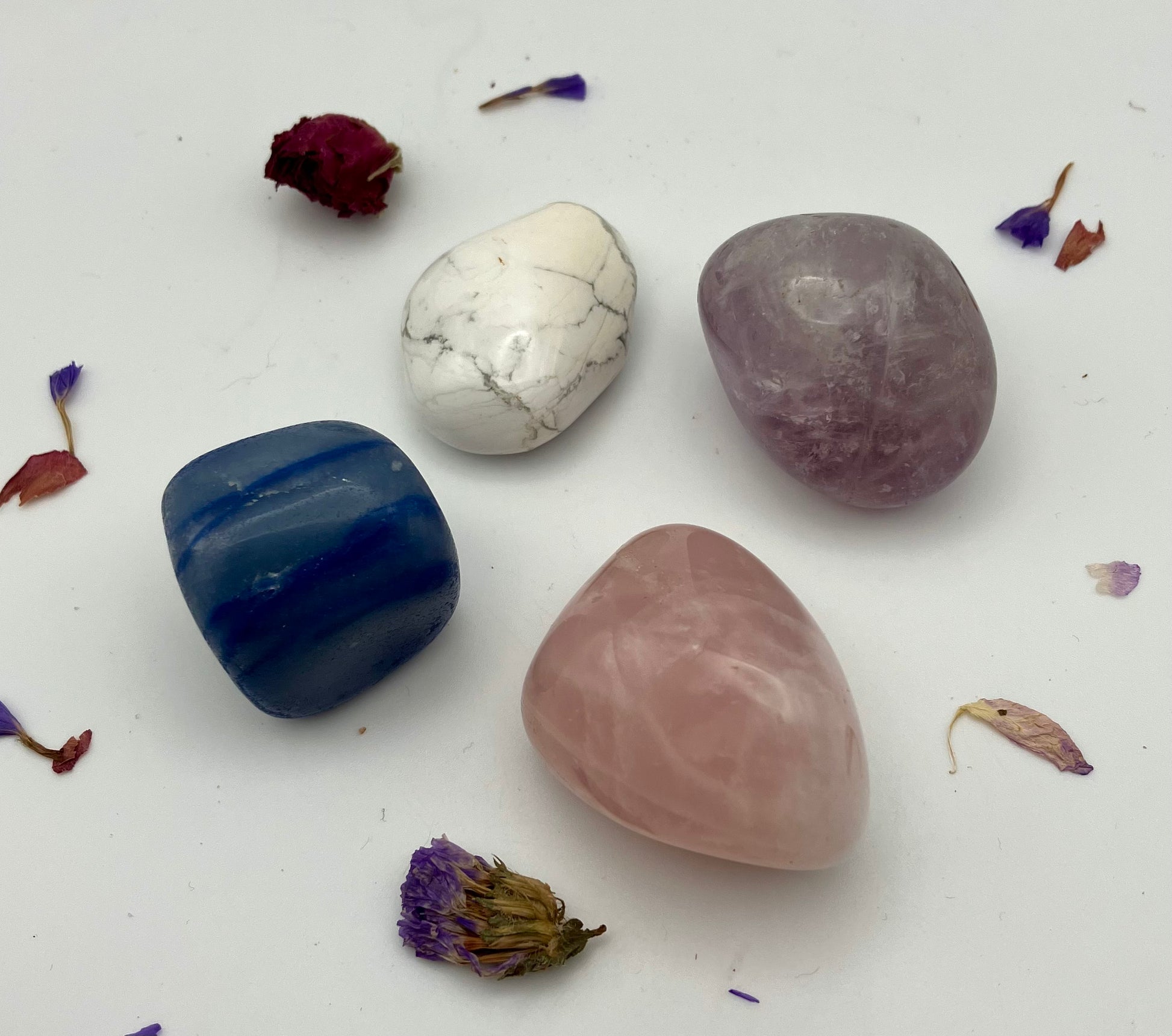 White howlite, blue Quartz, amethyst and rose Quartz all carry a gentle, calming vibration.