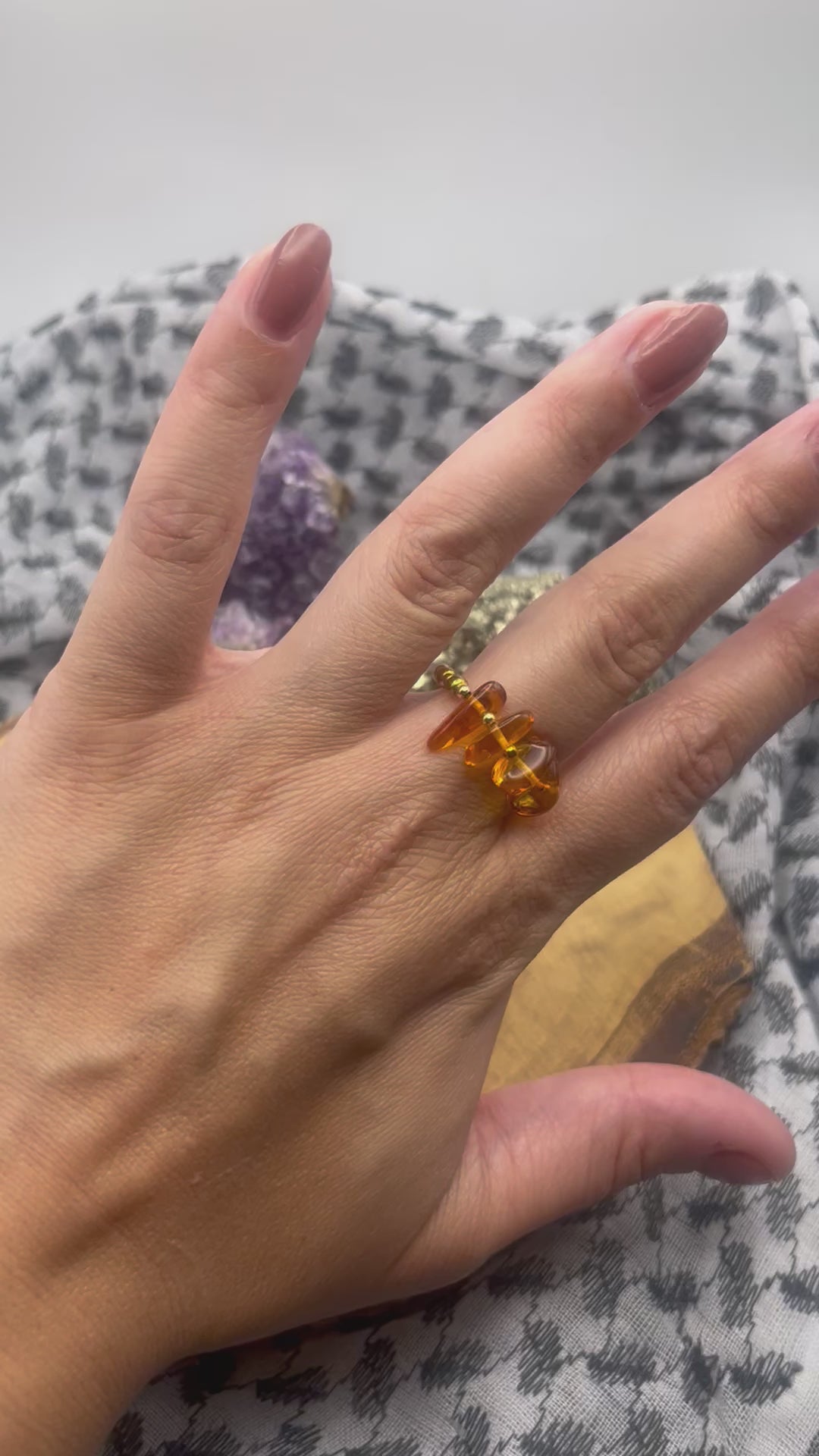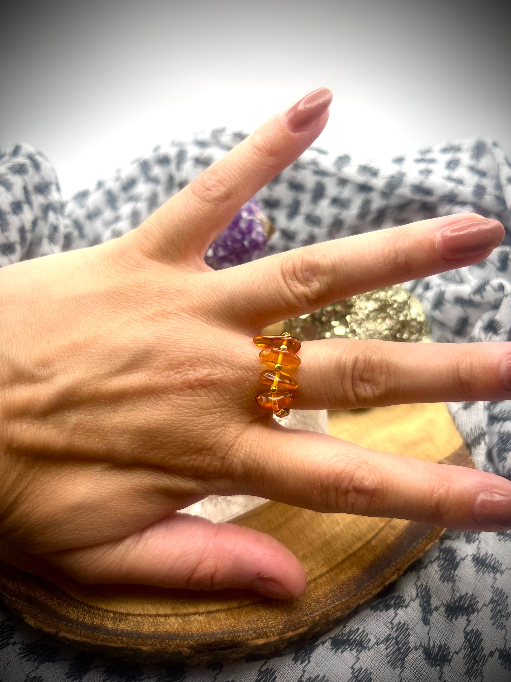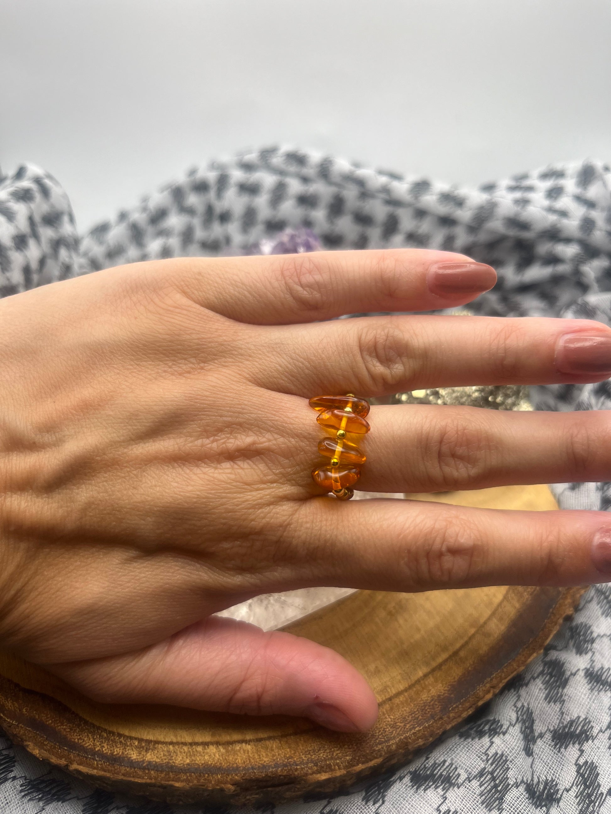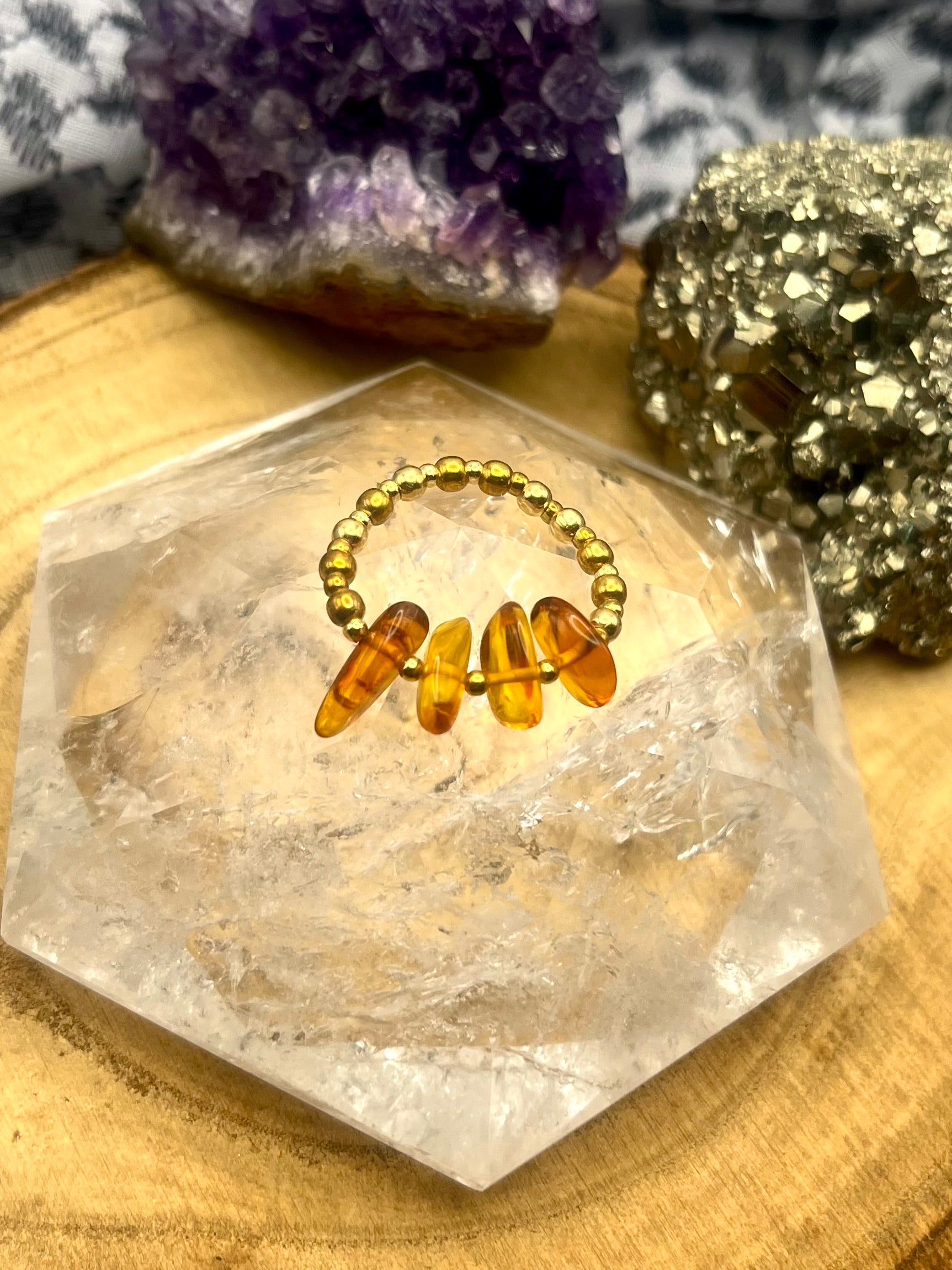 Genuine Amber with Gold Vermeil. One of a kind Stretch ring available in 3 sizes.