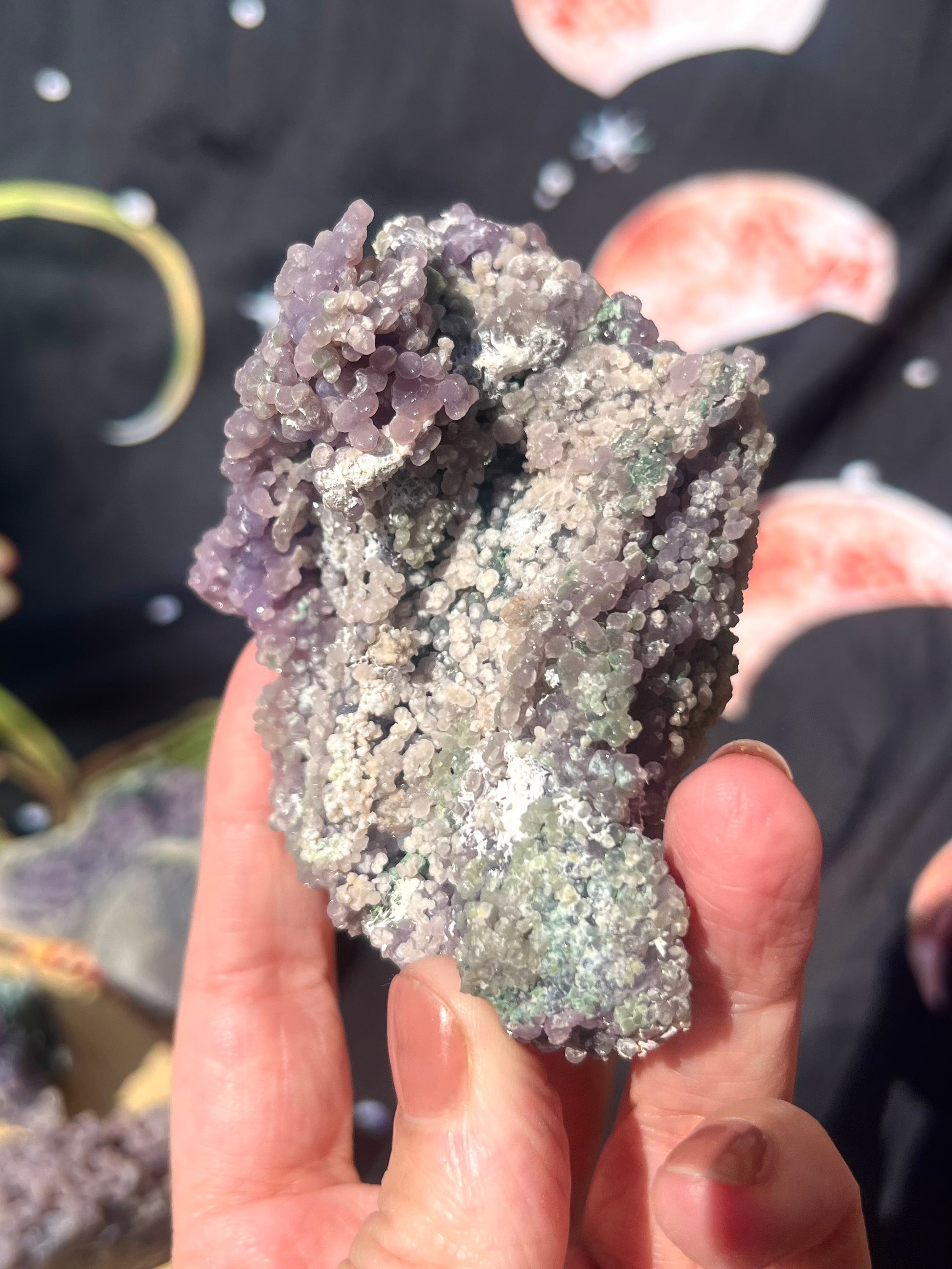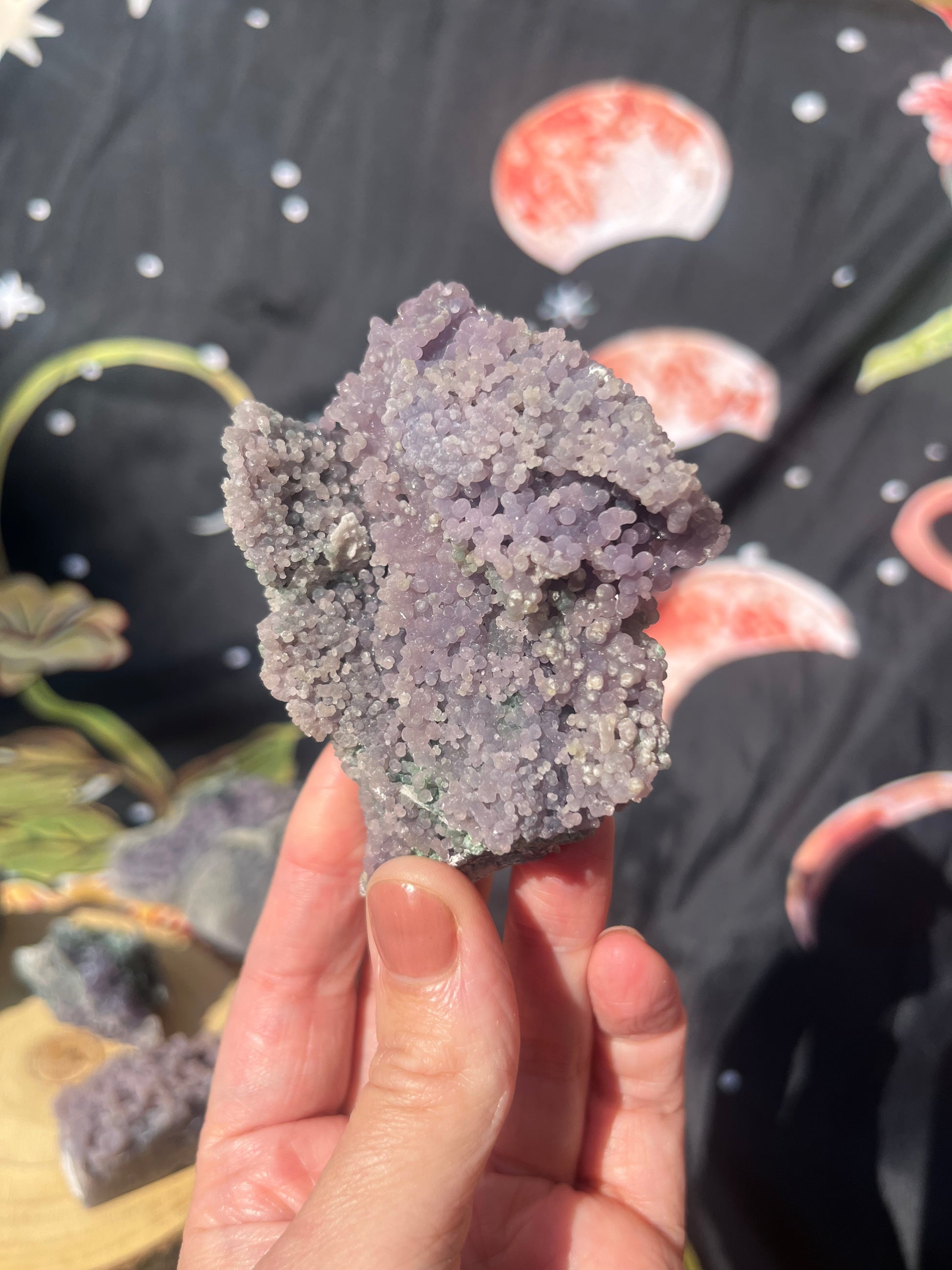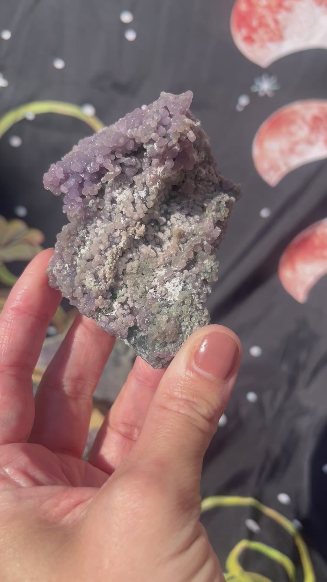 Grape agate or chalcedony is a rare, botryoidal (causing the little spheres or ‘grapes’) form of chalcedony. It is currently only found in one location in Indonesia and therefore is very unusual.