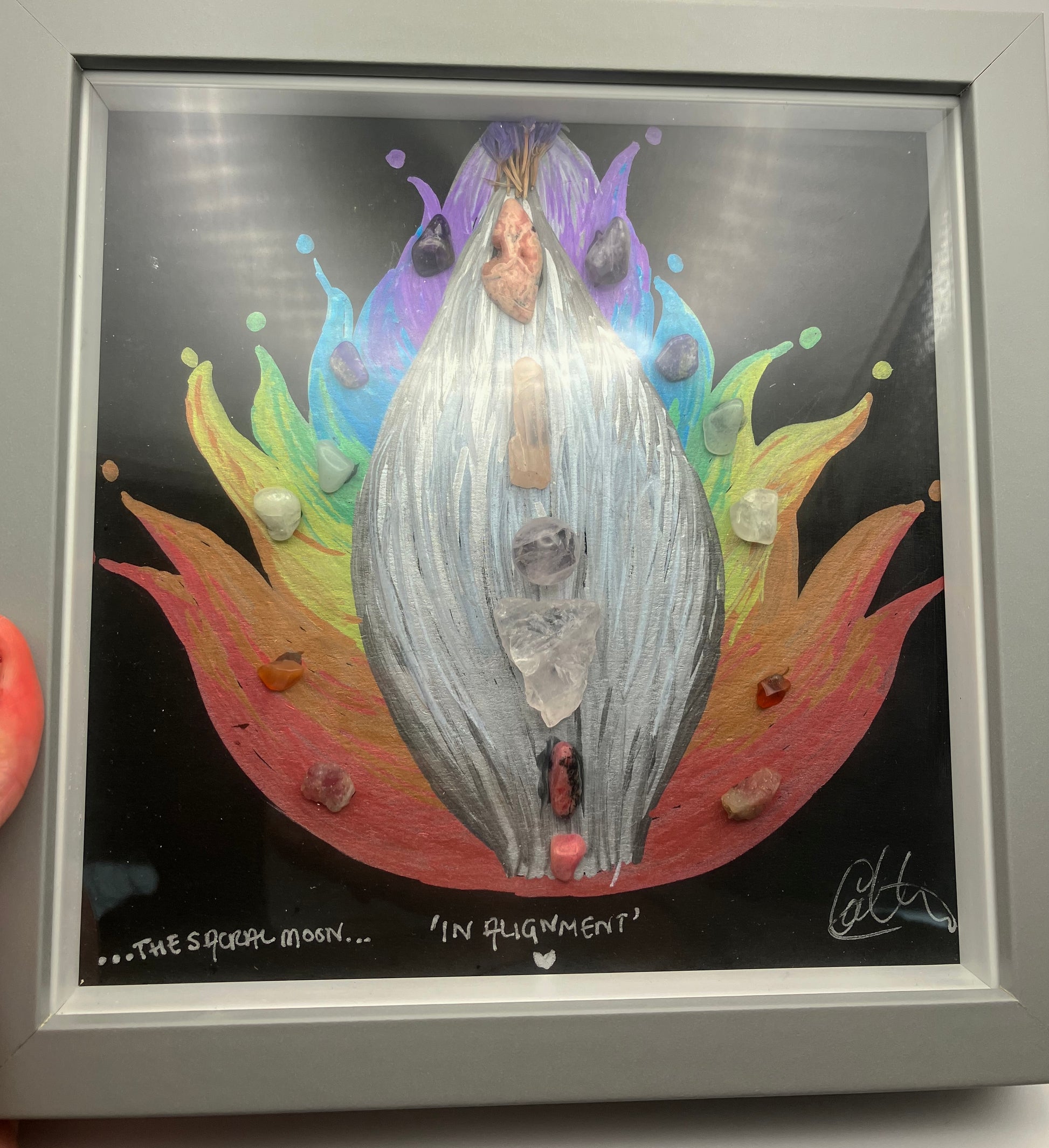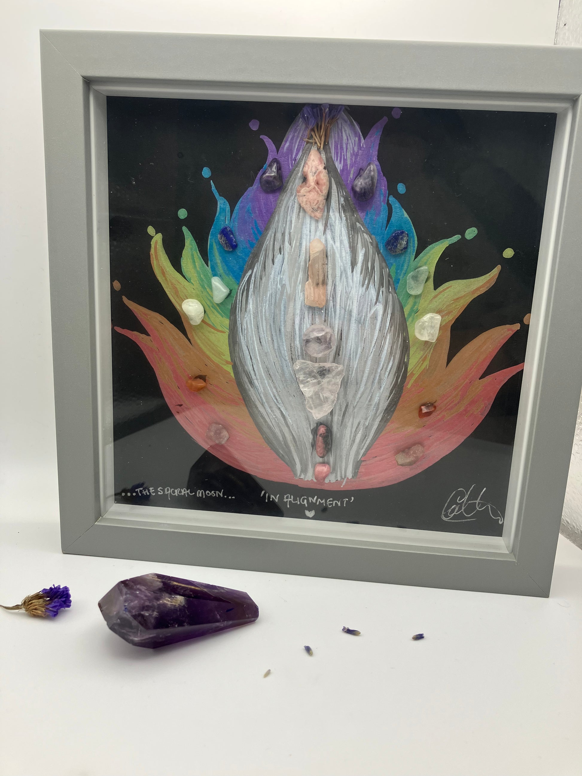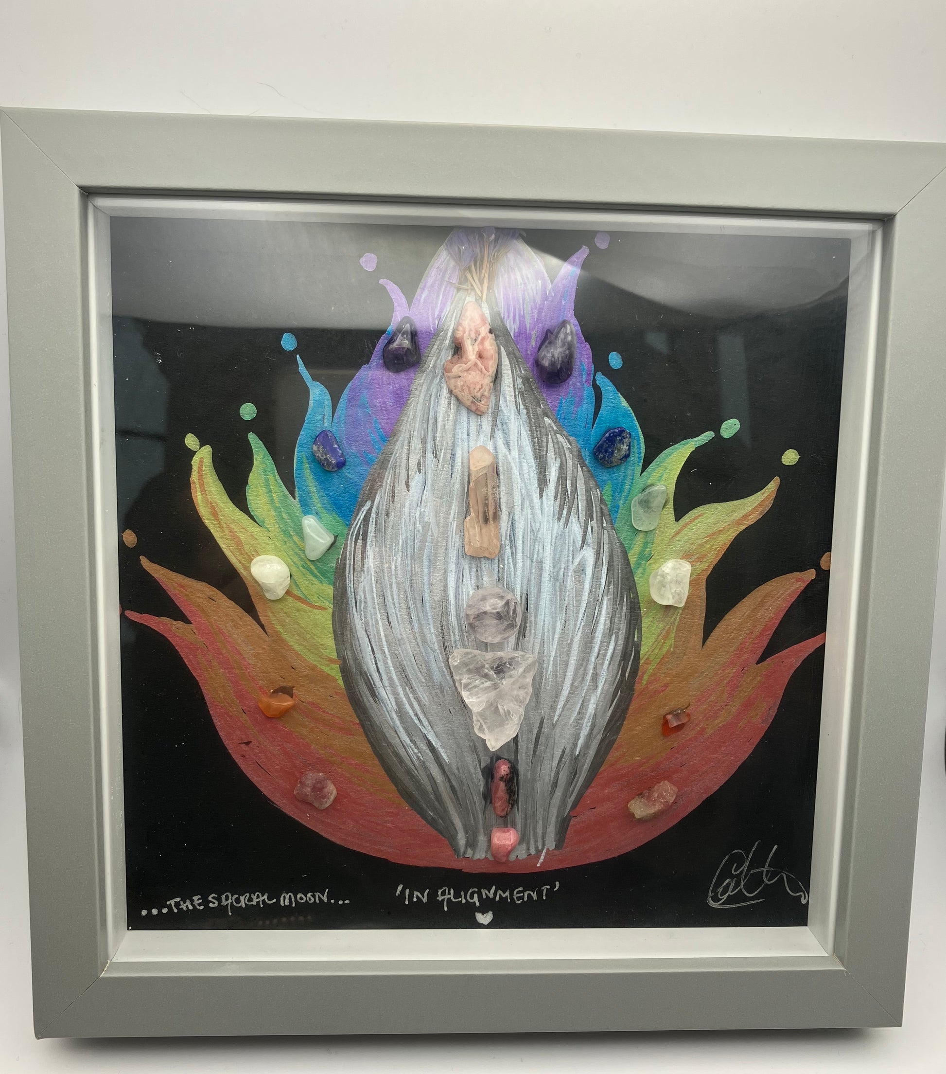 The centre of this piece represents the alignment of a self love journey. True love and acceptance of the self allows us to align our physical, spiritual and emotional bodies. The outer leaves represent each of the 7 main chakras.