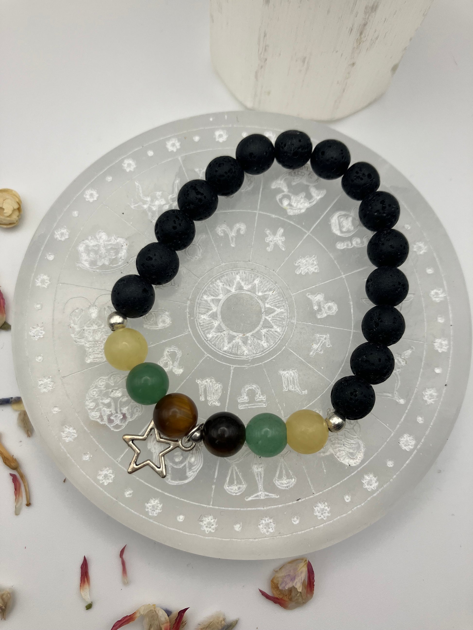 An energy balancing bracelet which helps to bring peace and harmony to the solar plexus chakra. Each crystal is carefully selected to work with the corresponding chakra. With charm and lava beads.