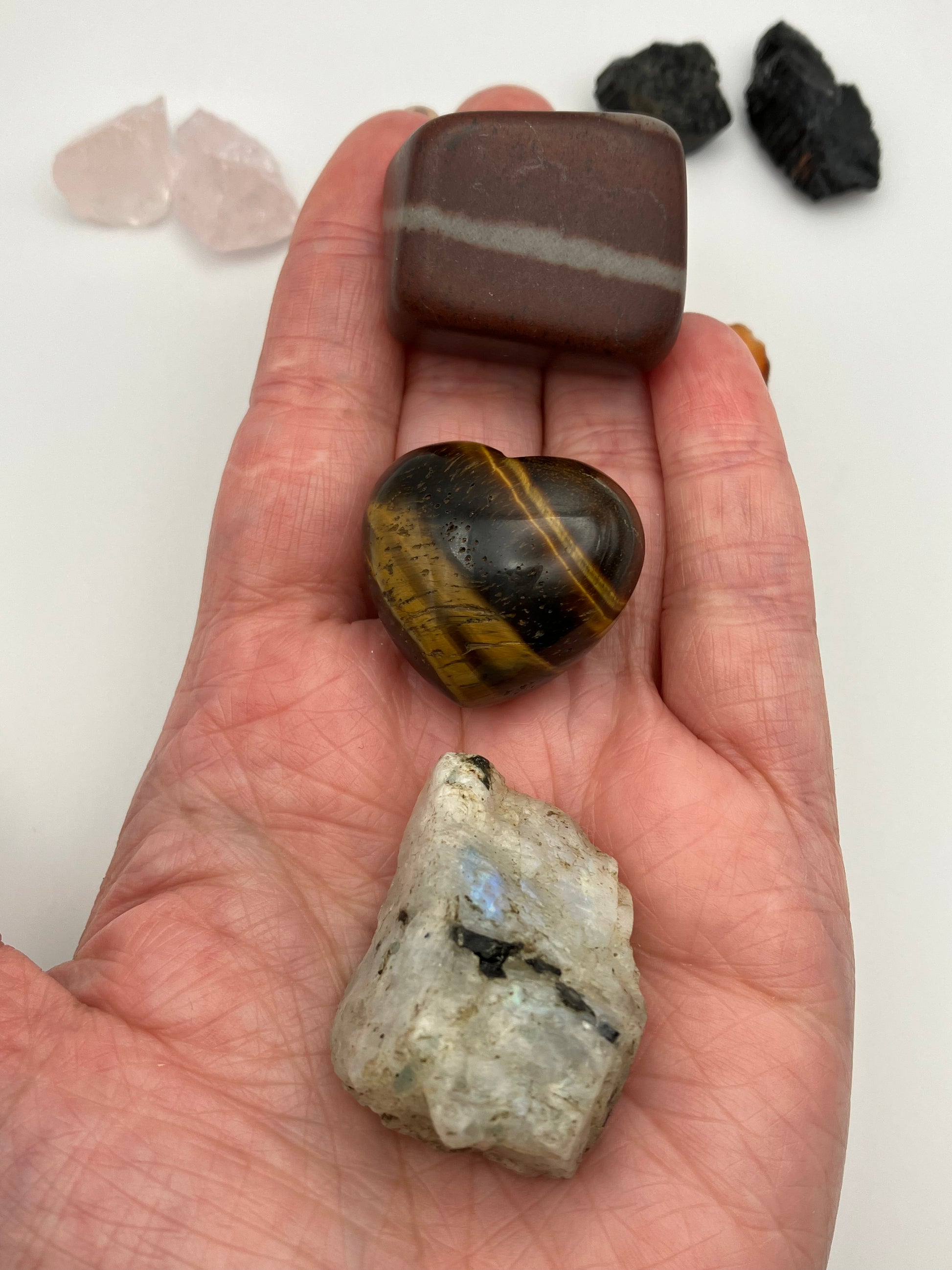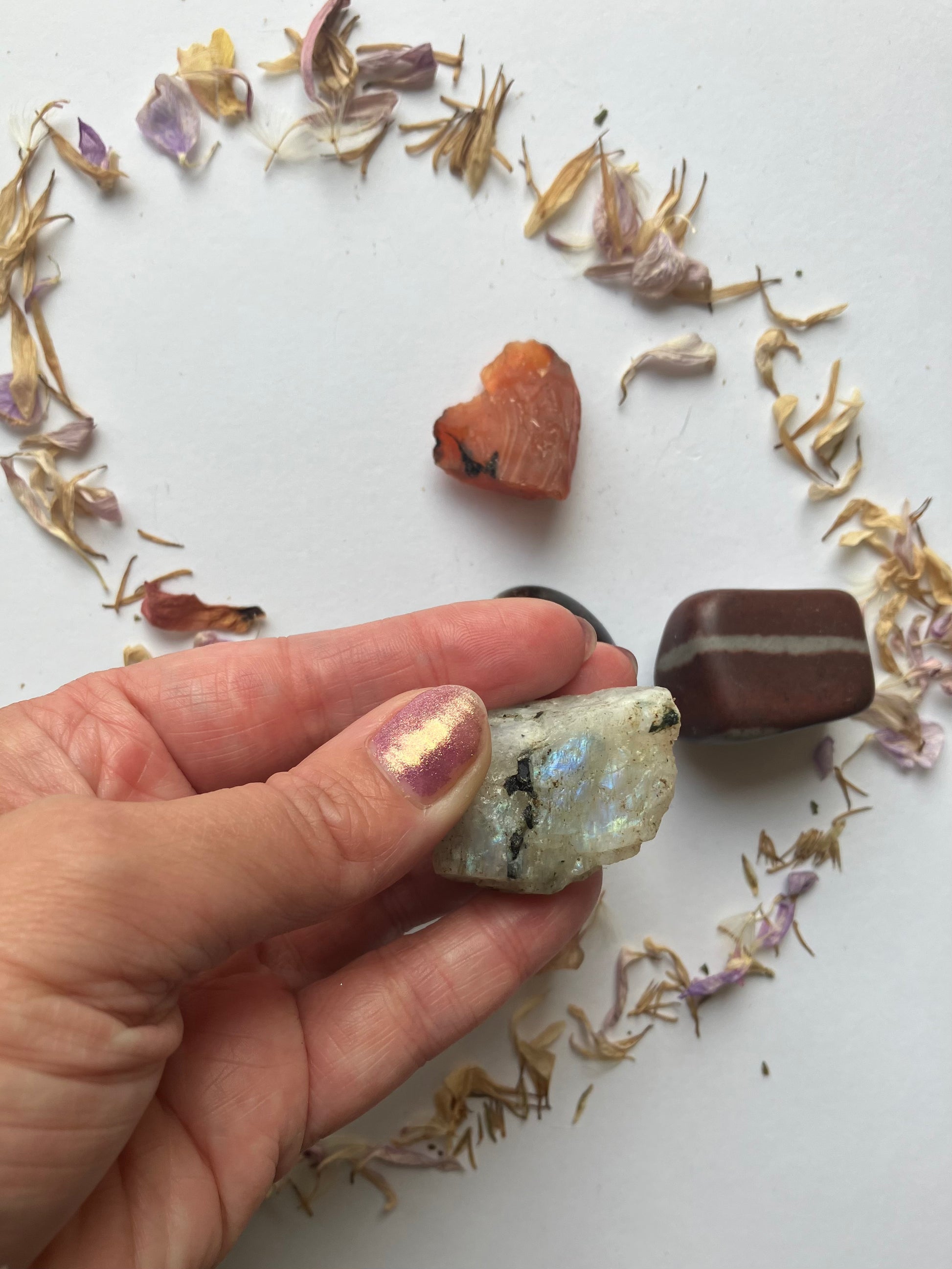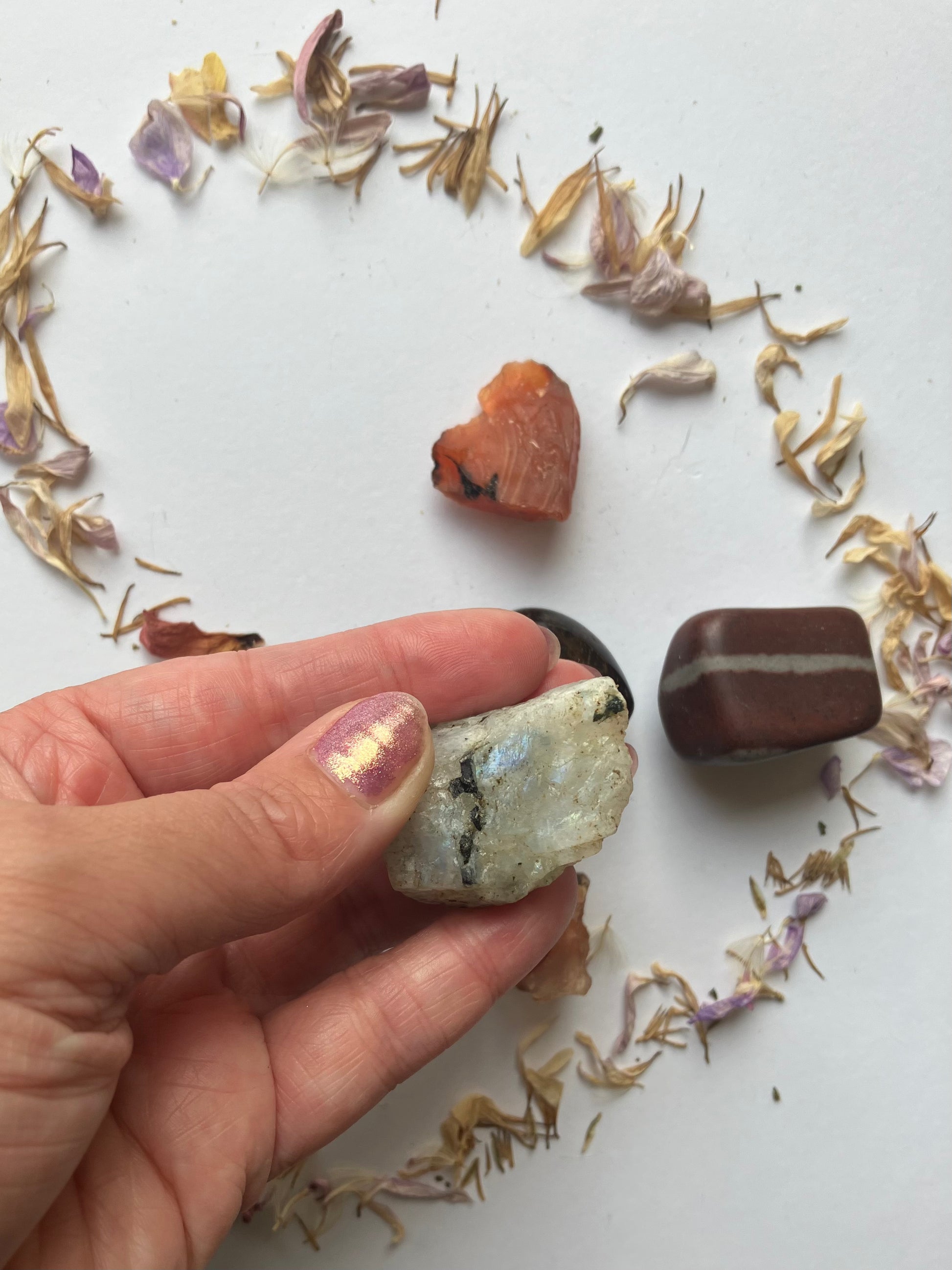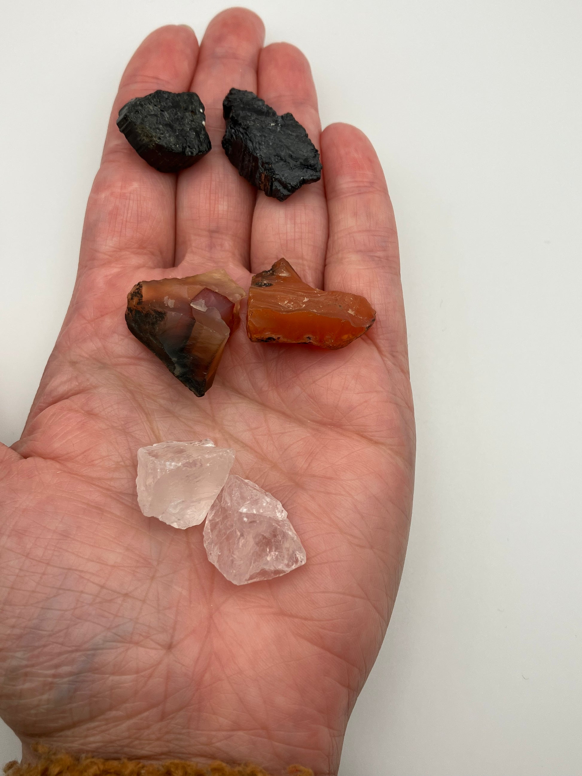 Carnelian is all about passion, positivity, drive and every thing sacral. Moonstone brings new beginnings and helps you to open your intuition as, as well as bringing the energy of our sister moon - the divine feminine. As I write this I am being called to add two ROUGH BLACK TOURMALINE and two ROUGH ROSE QUARTZ. The tourmaline will represent the masculine, and rose Quartz the feminine.
