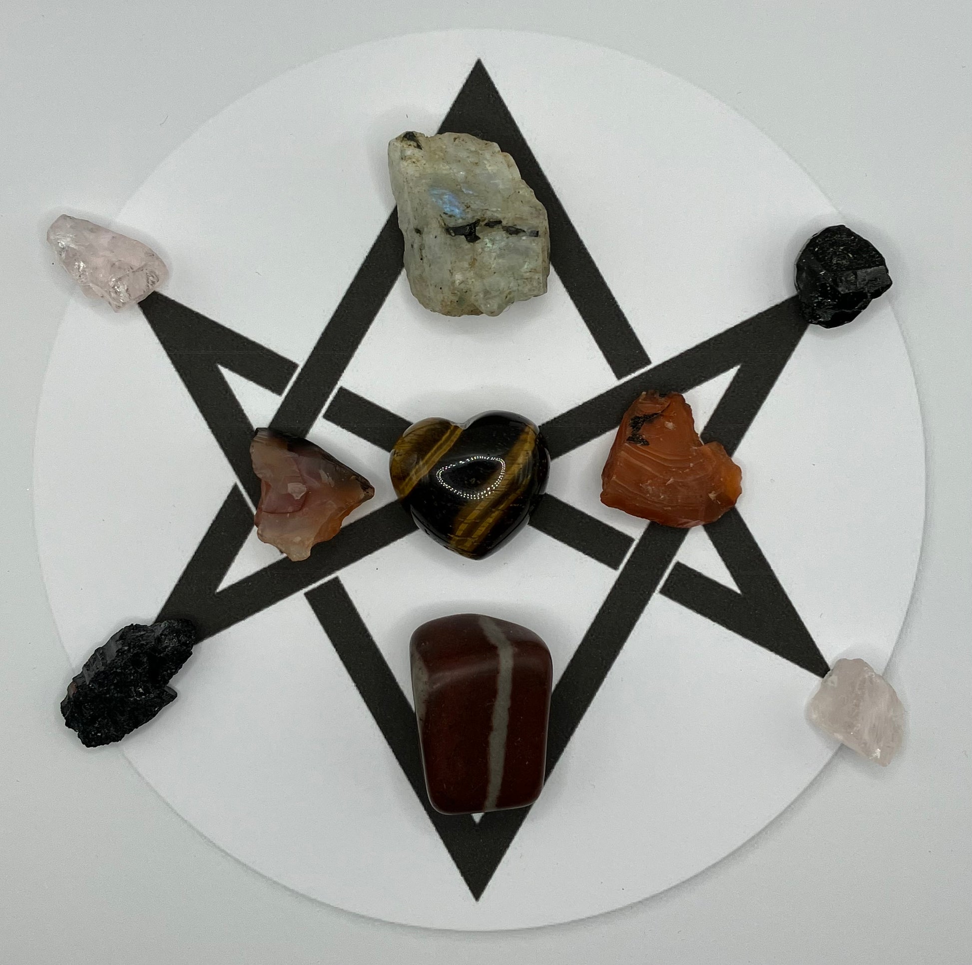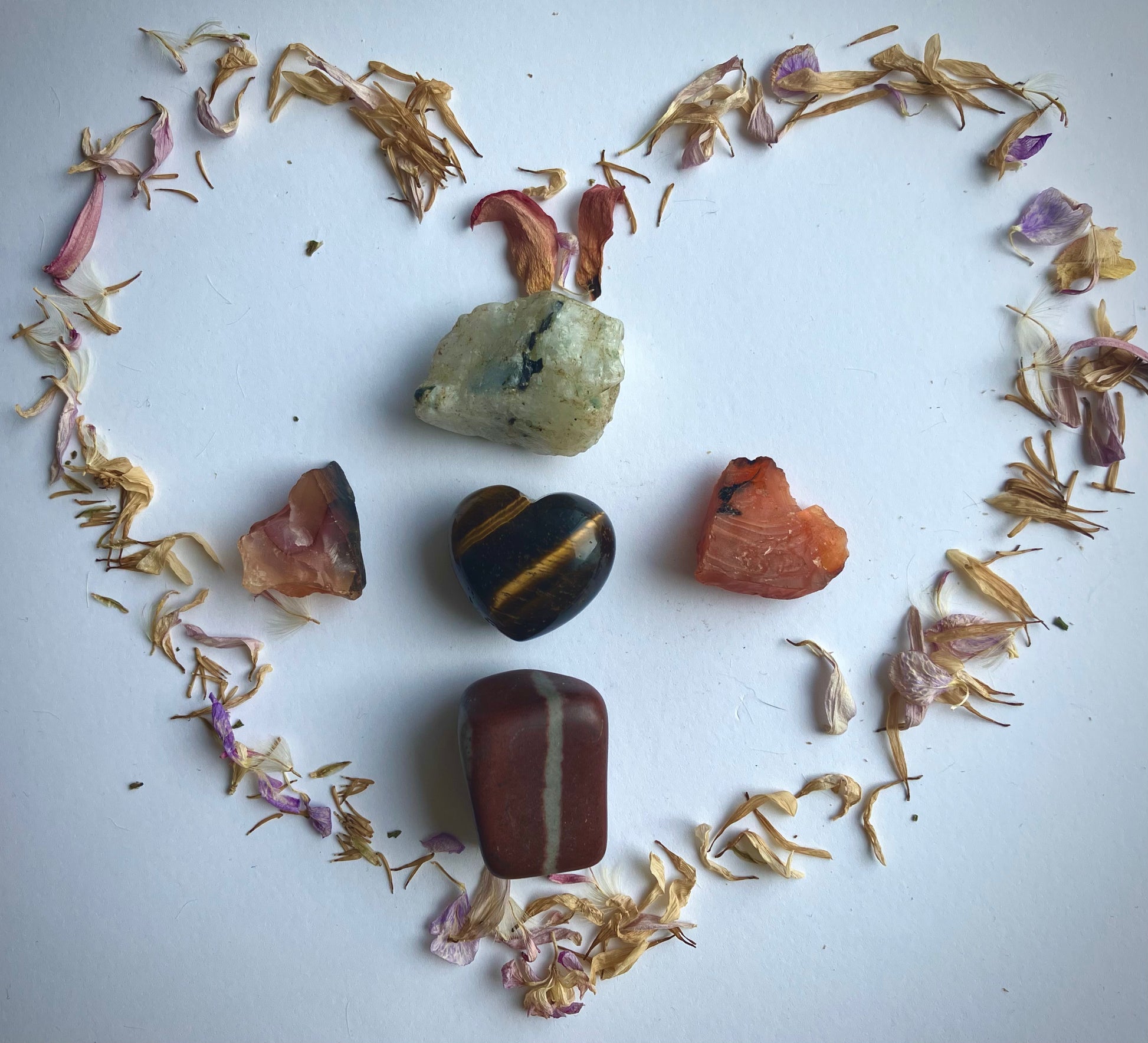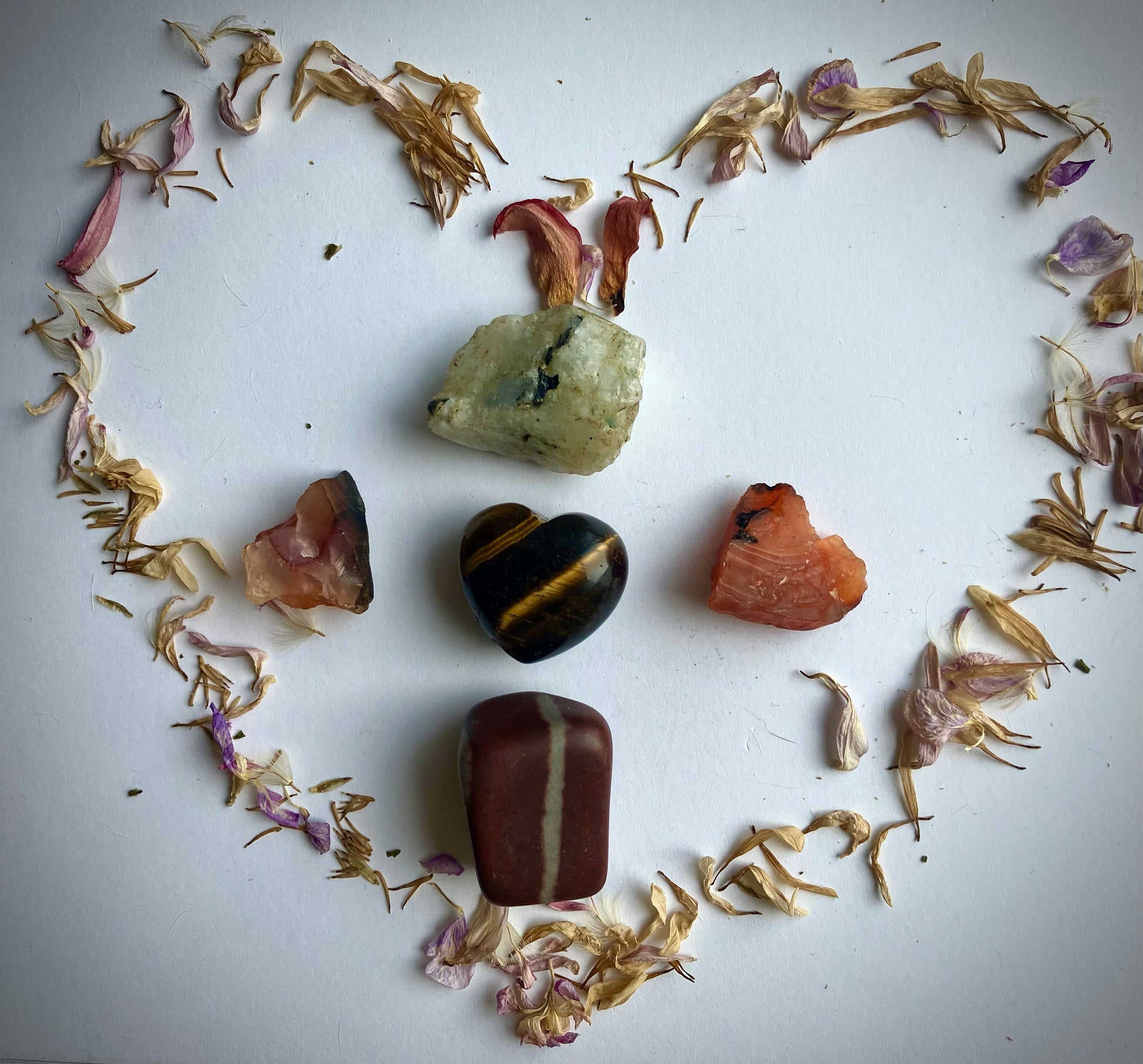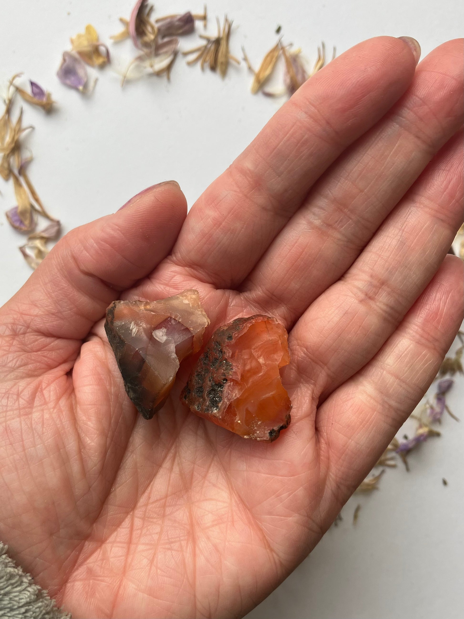 Carnelian is all about passion, positivity, drive and every thing sacral. Moonstone brings new beginnings and helps you to open your intuition as, as well as bringing the energy of our sister moon - the divine feminine. As I write this I am being called to add two ROUGH BLACK TOURMALINE and two ROUGH ROSE QUARTZ. The tourmaline will represent the masculine, and rose Quartz the feminine.