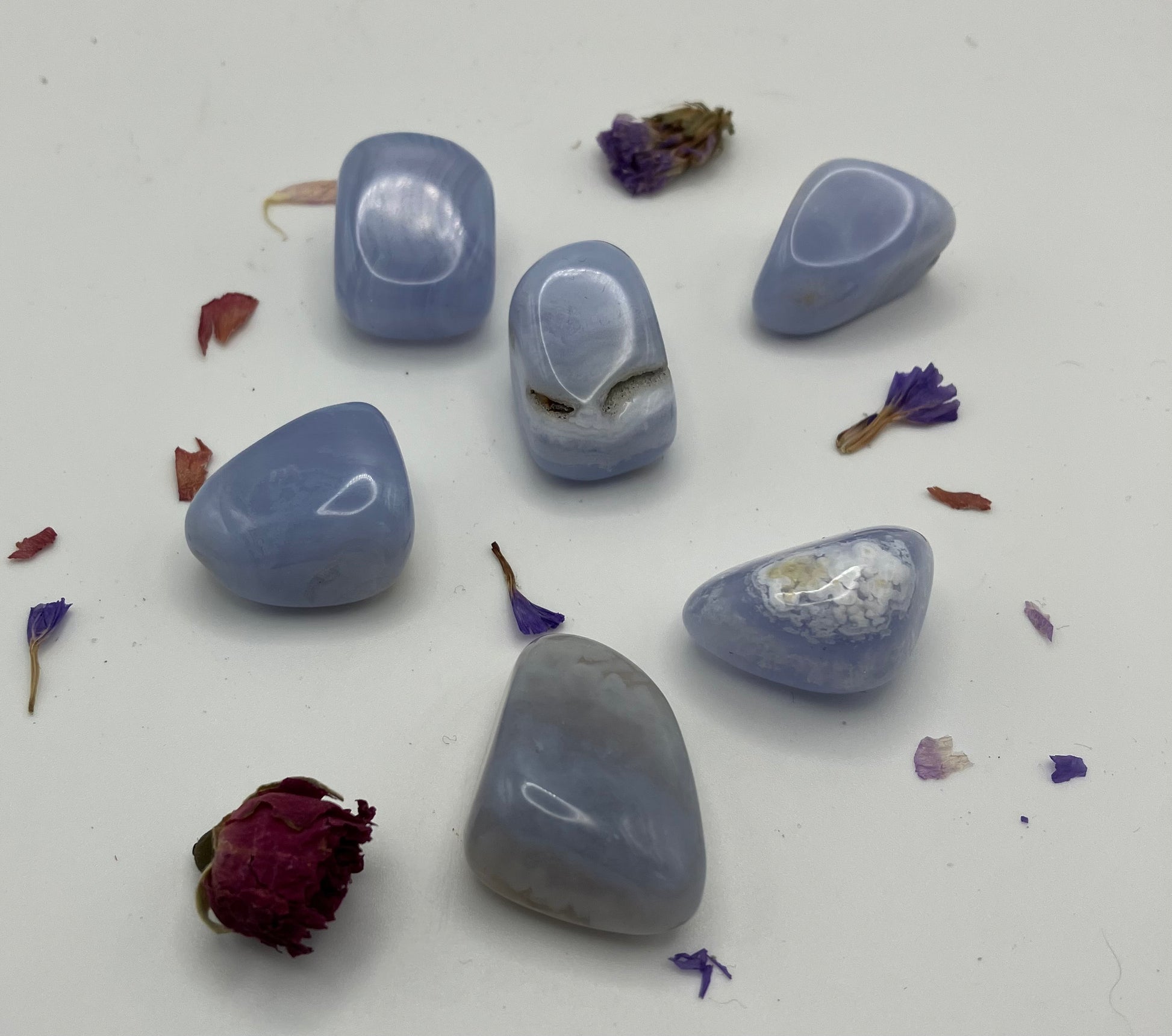 Beautiful, grade A blue lace agate tumbles. These are such nice quality with beautiful markings and have the most calming energy!! Blue lace agate is super calming in times of stress. It’s a stone used for speaking your truth in a calm manor and is great for bringing confidence to public speaking or those who feel shy talking to new people. It is a stone of peace and tranquility and is an excellent tool for reaching higher states of calm during meditation.