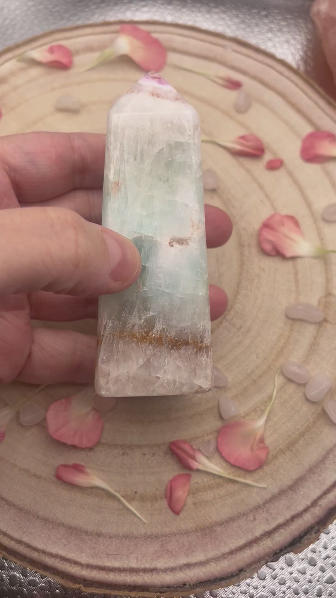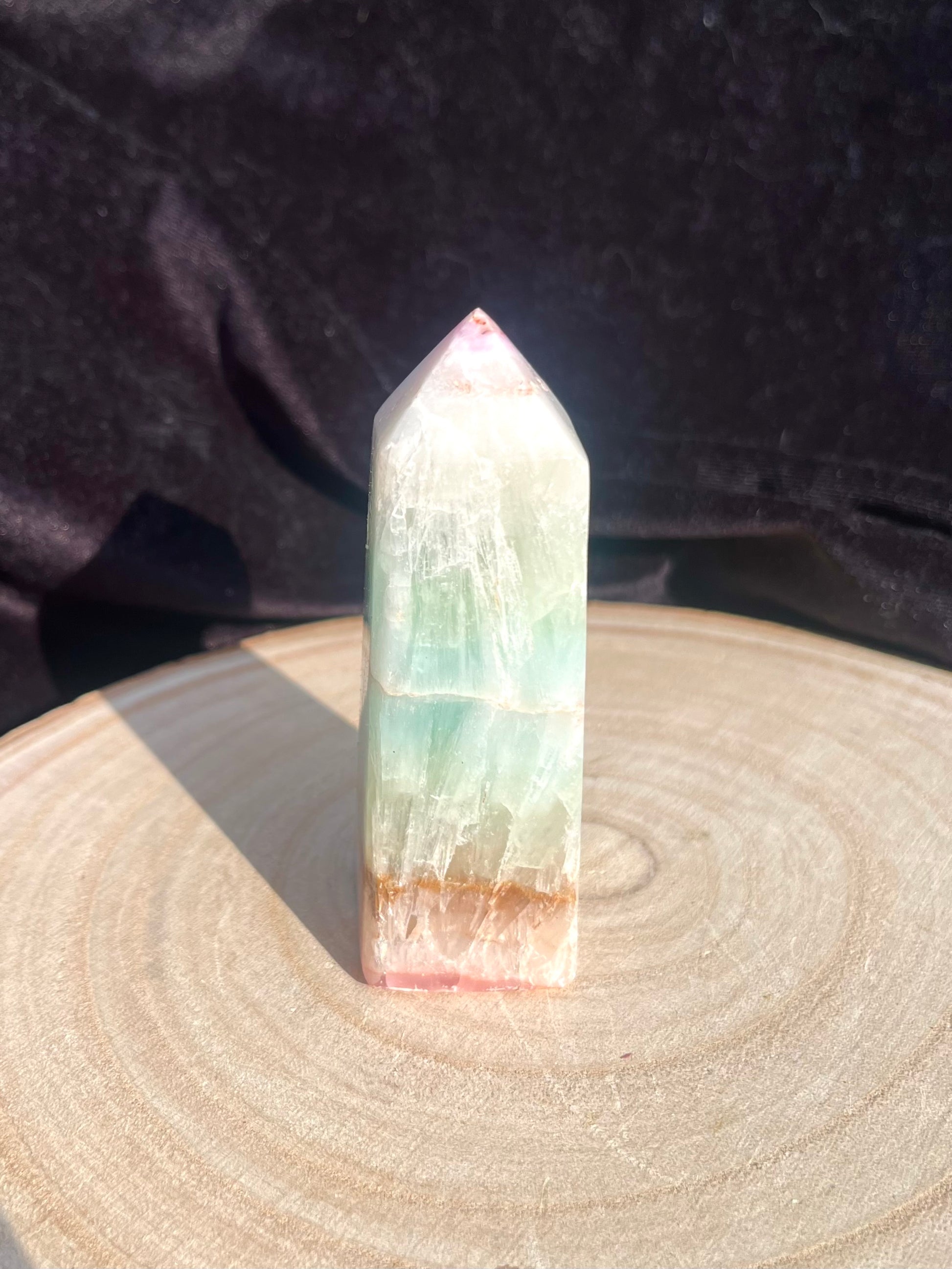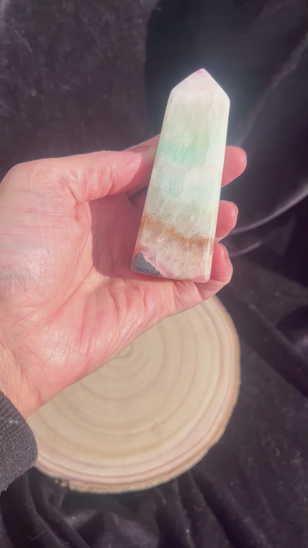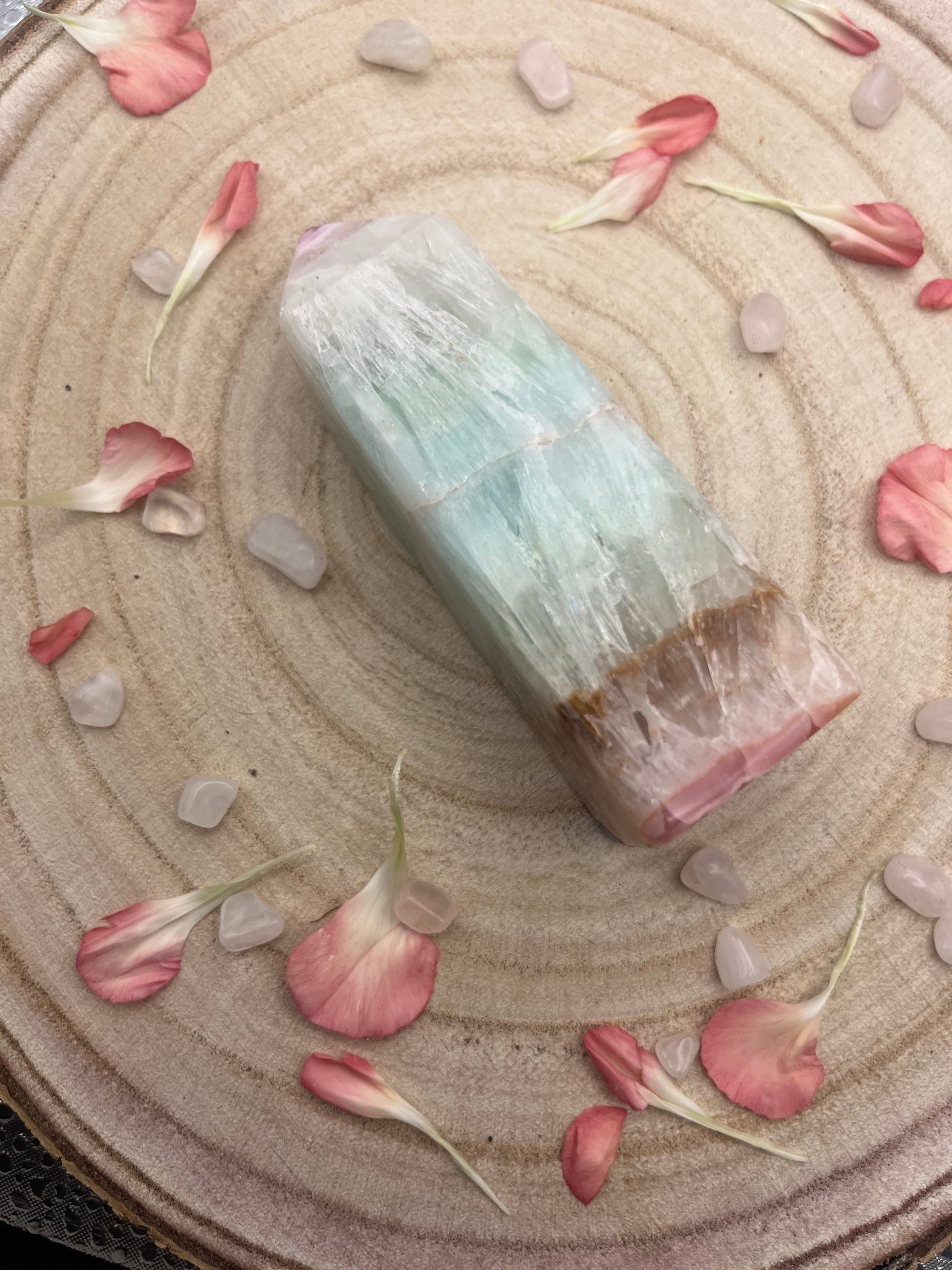 Beautiful tower of pistachio calcite, pink aragonite and white calcite. This is a rare mix of crystals which beautifully harmonises and balances the heart and higher heart. This will help to balance your self love, boundaries and self confidence so that you have a stable base for relationships.