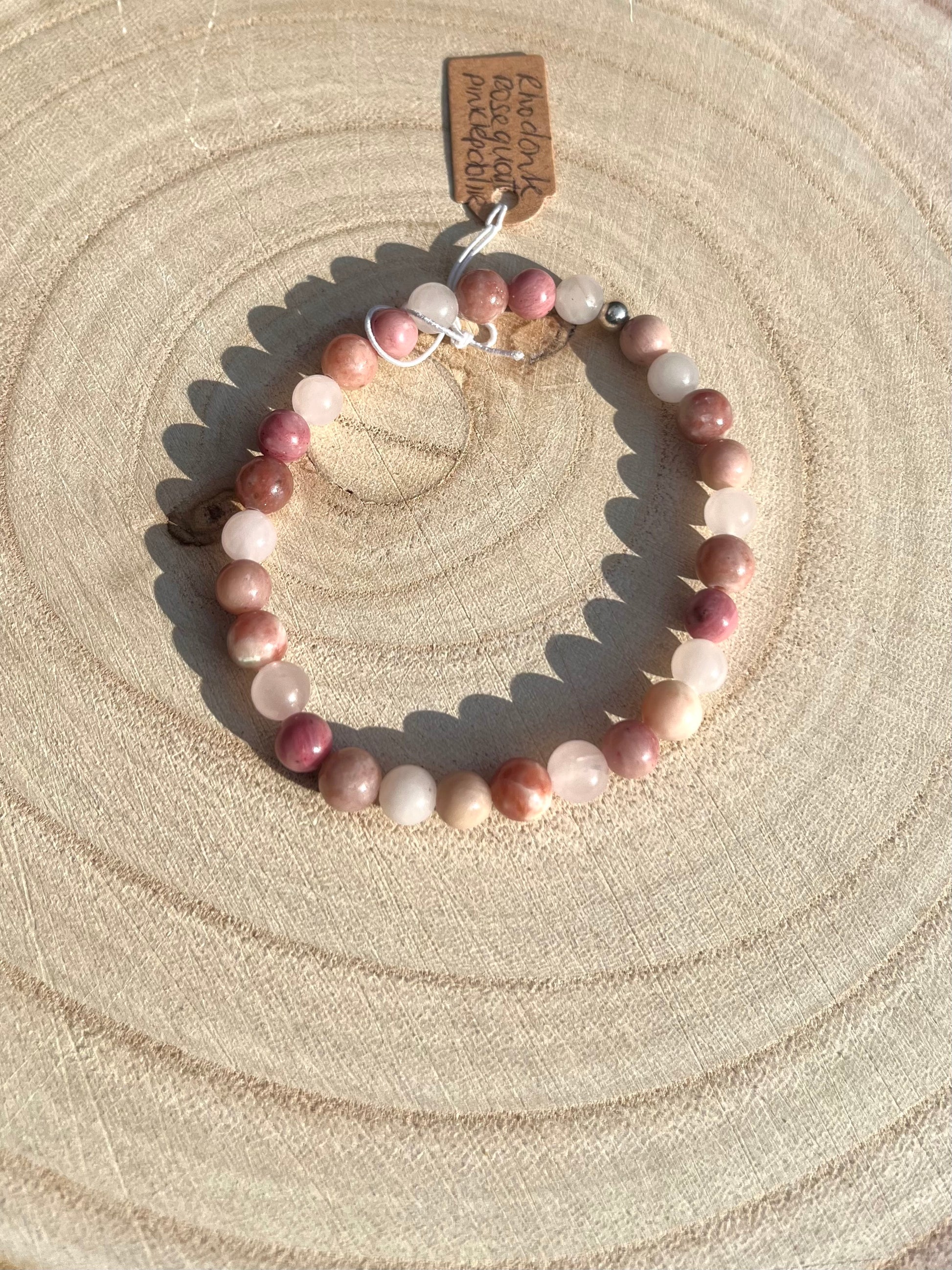 Rose Quartz, Pink Lepidolite and Rhodonite. This bracelet is all about healing the higher heart and bringing in self love.