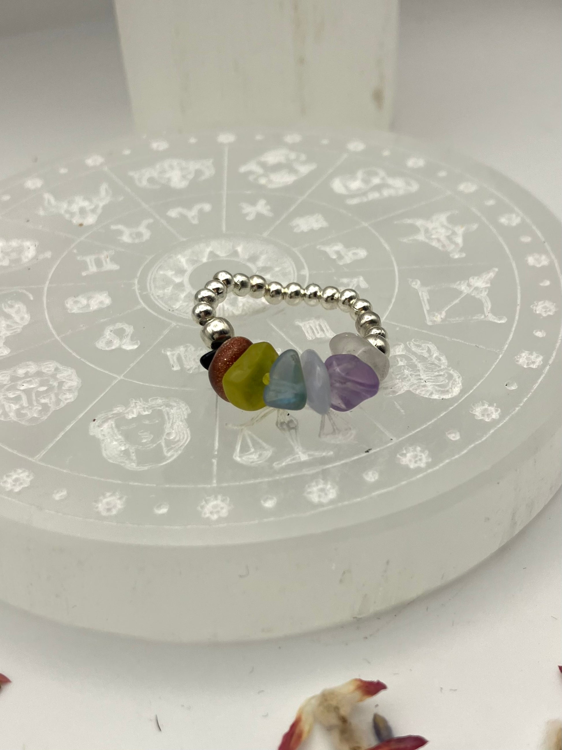 Chakra ring - black onyx, goldstone, serpentine, fluorite, blue lace agate, amethyst and clear Quartz with silver coloured iron beads.