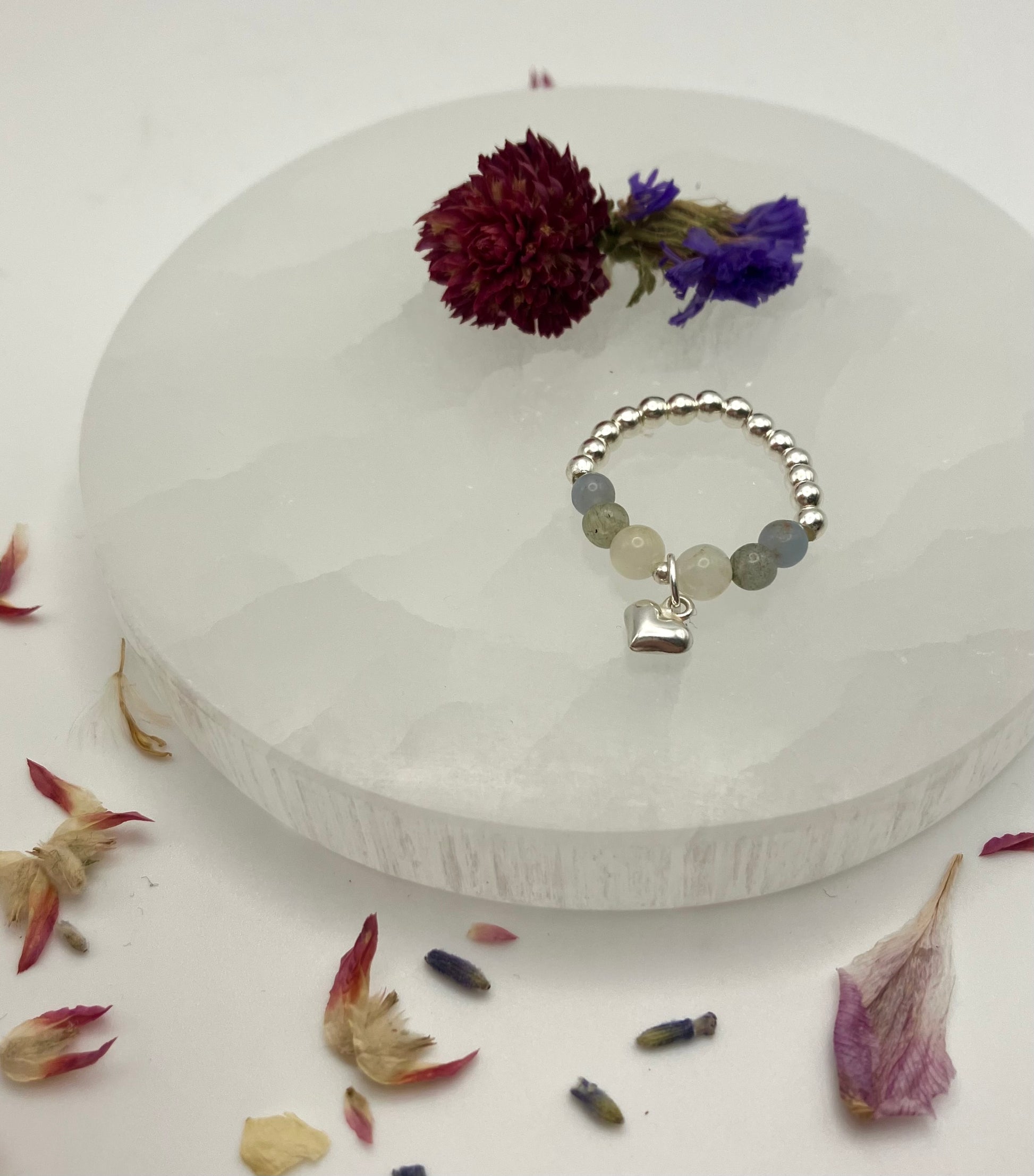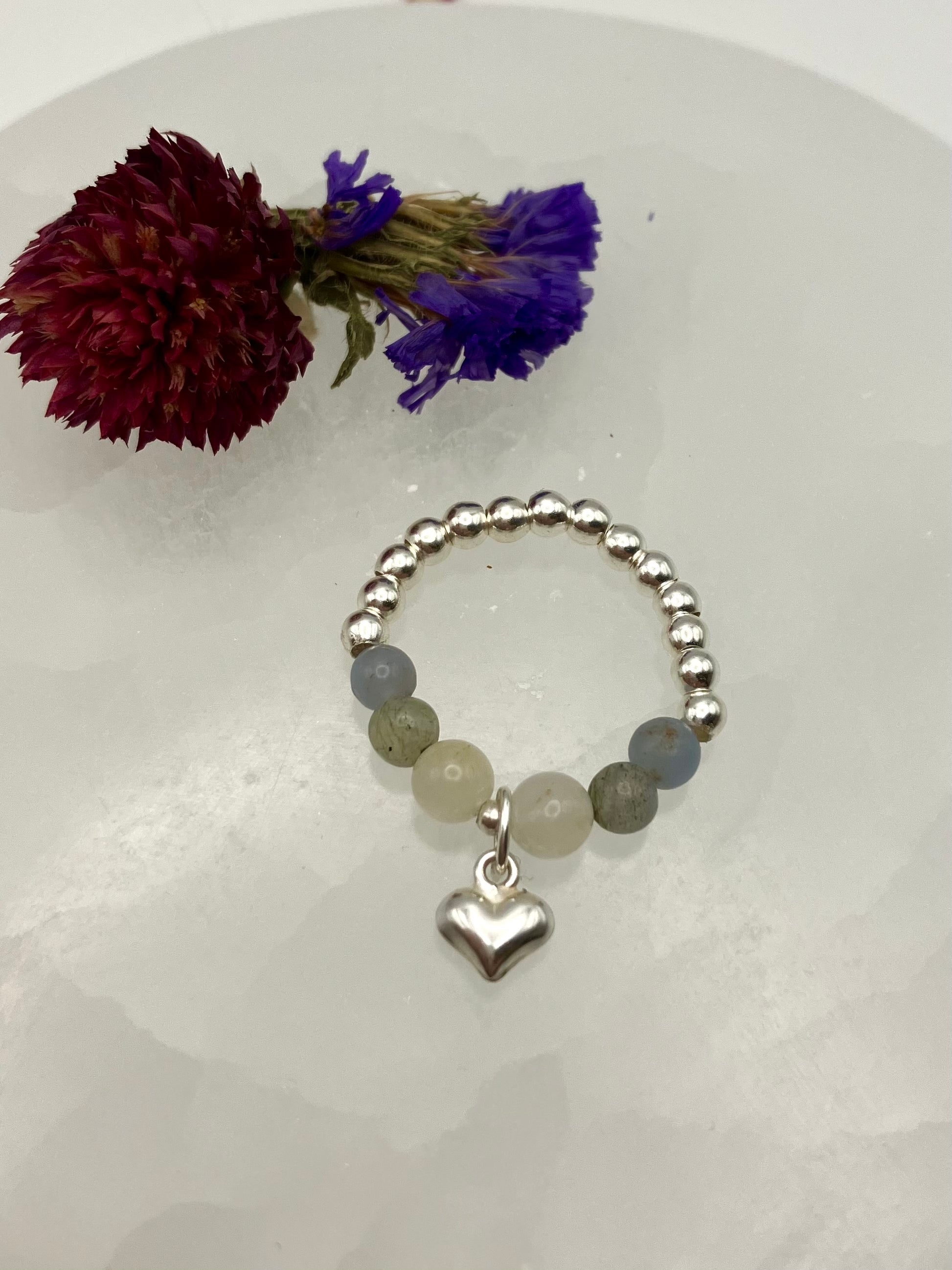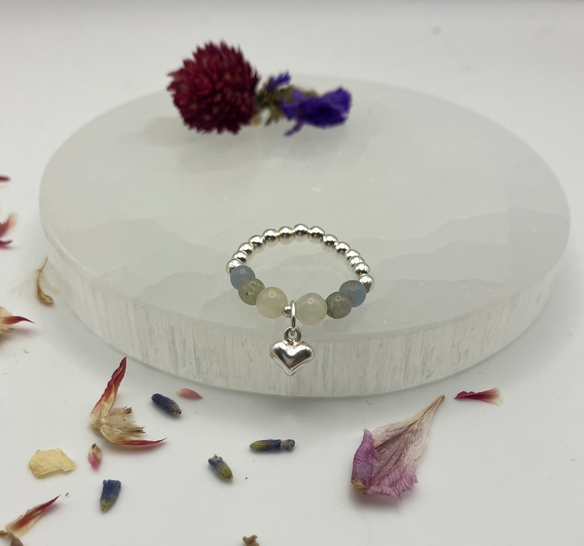 ‘Crystal hearts - Celestial alignment’ Sterling silver stretch ring. Angelite, moonstone, labradorite