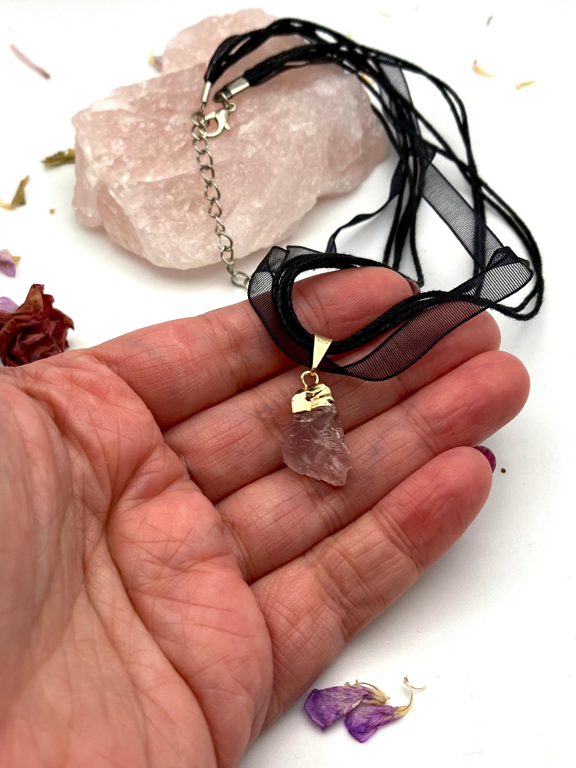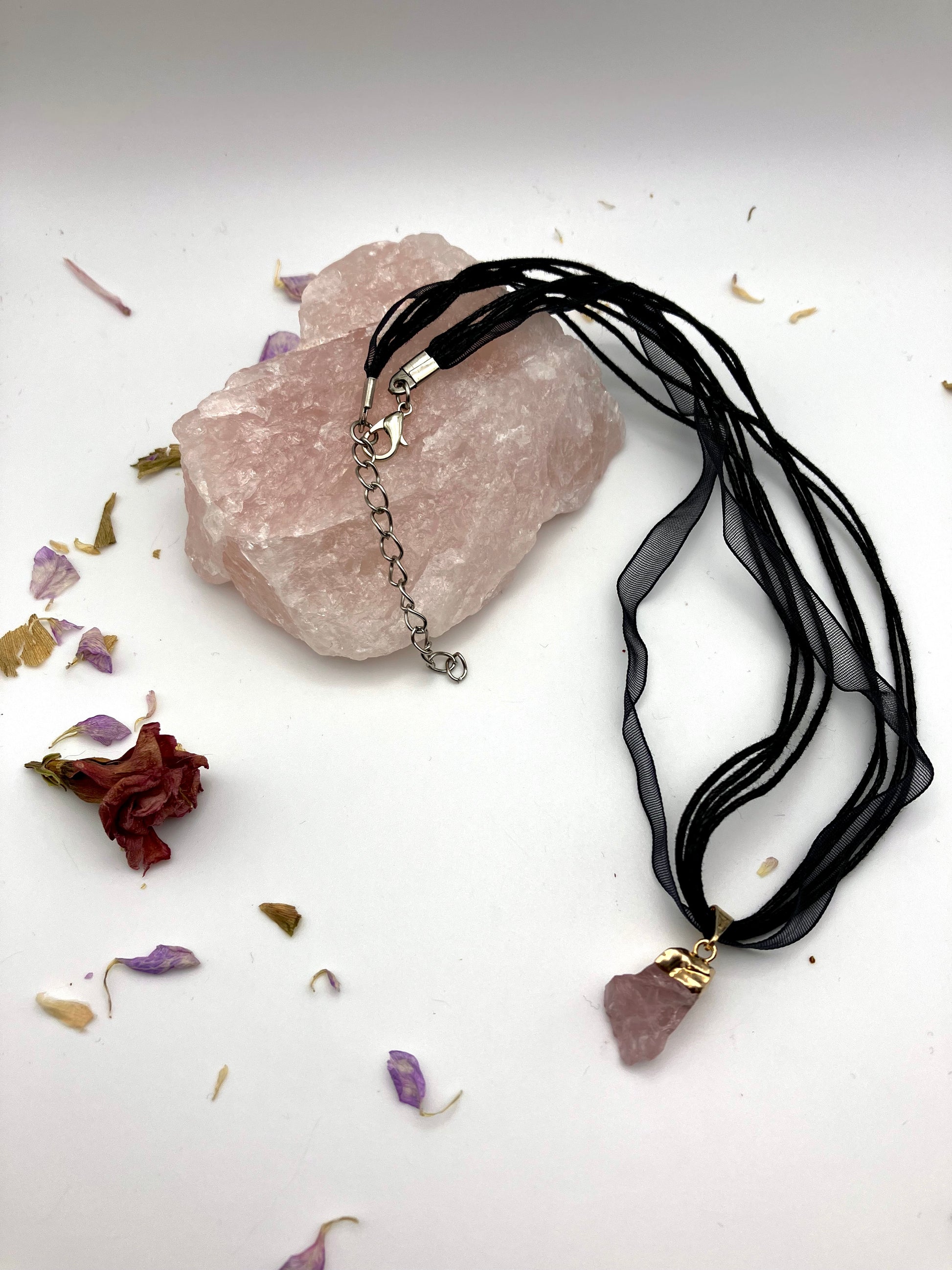 Beautiful natural chunk of high grade rose Quartz (around 1.5-2 cm) on organza and wax cord with silver coloured chain and lobster clasp.