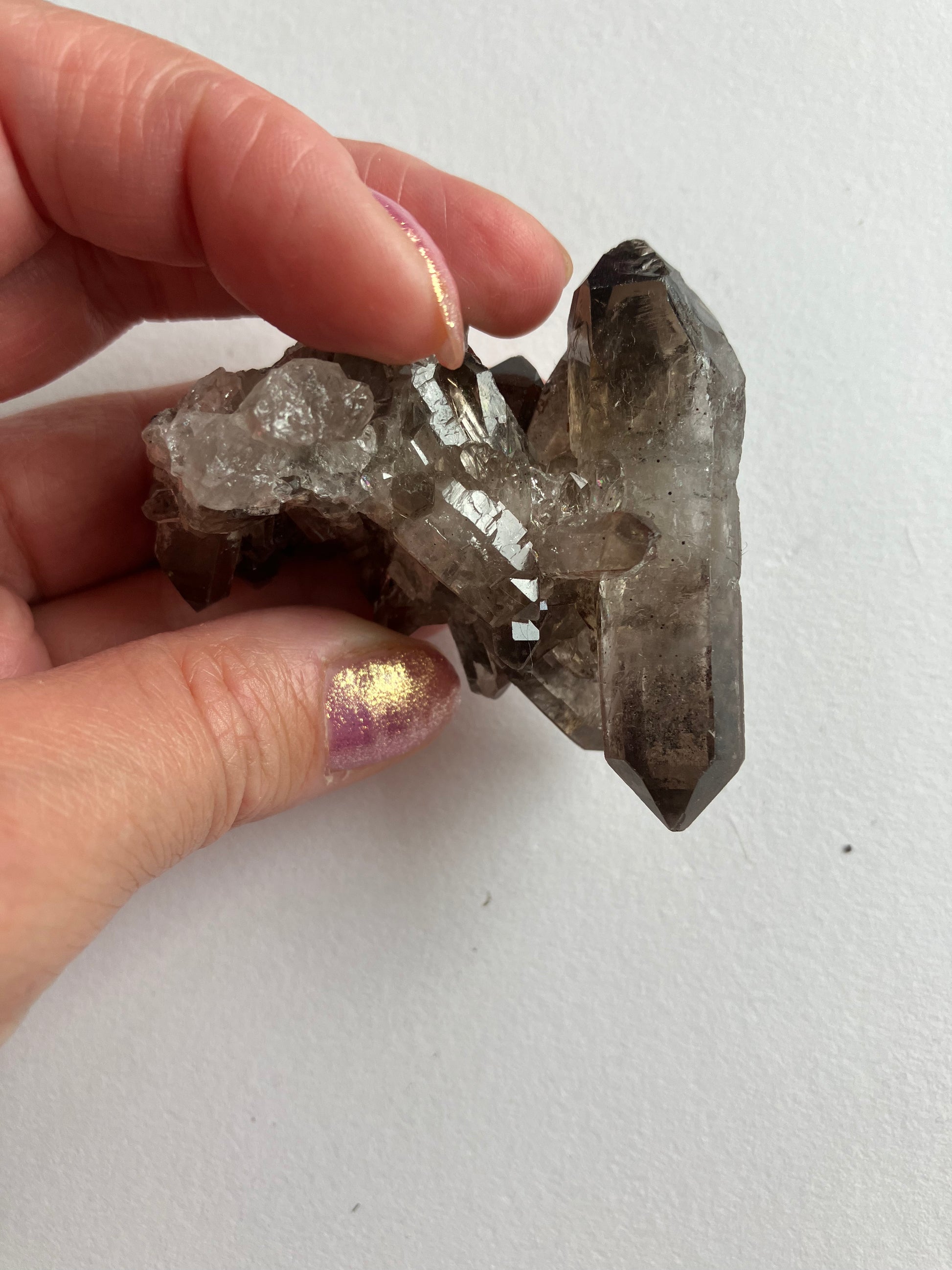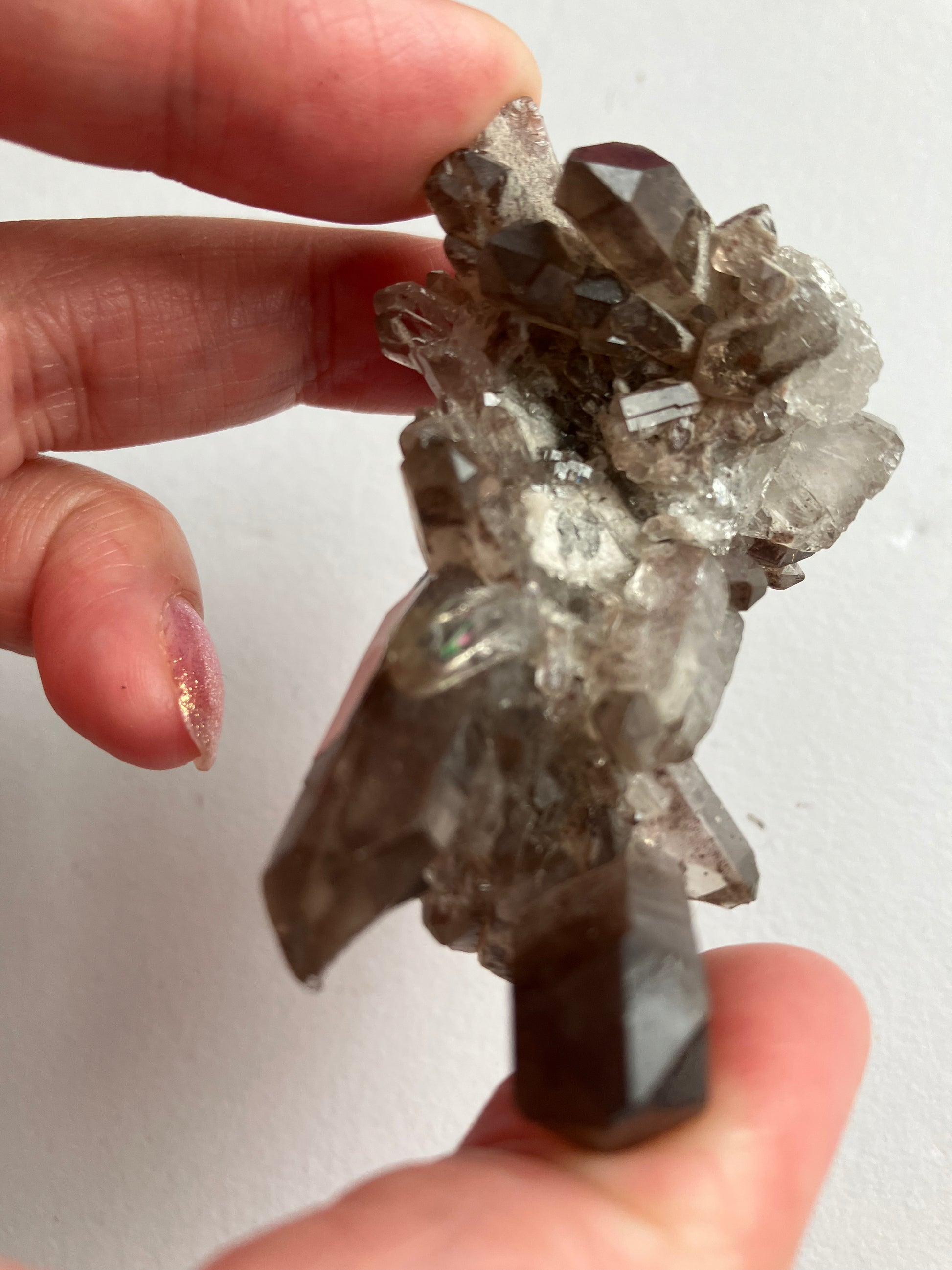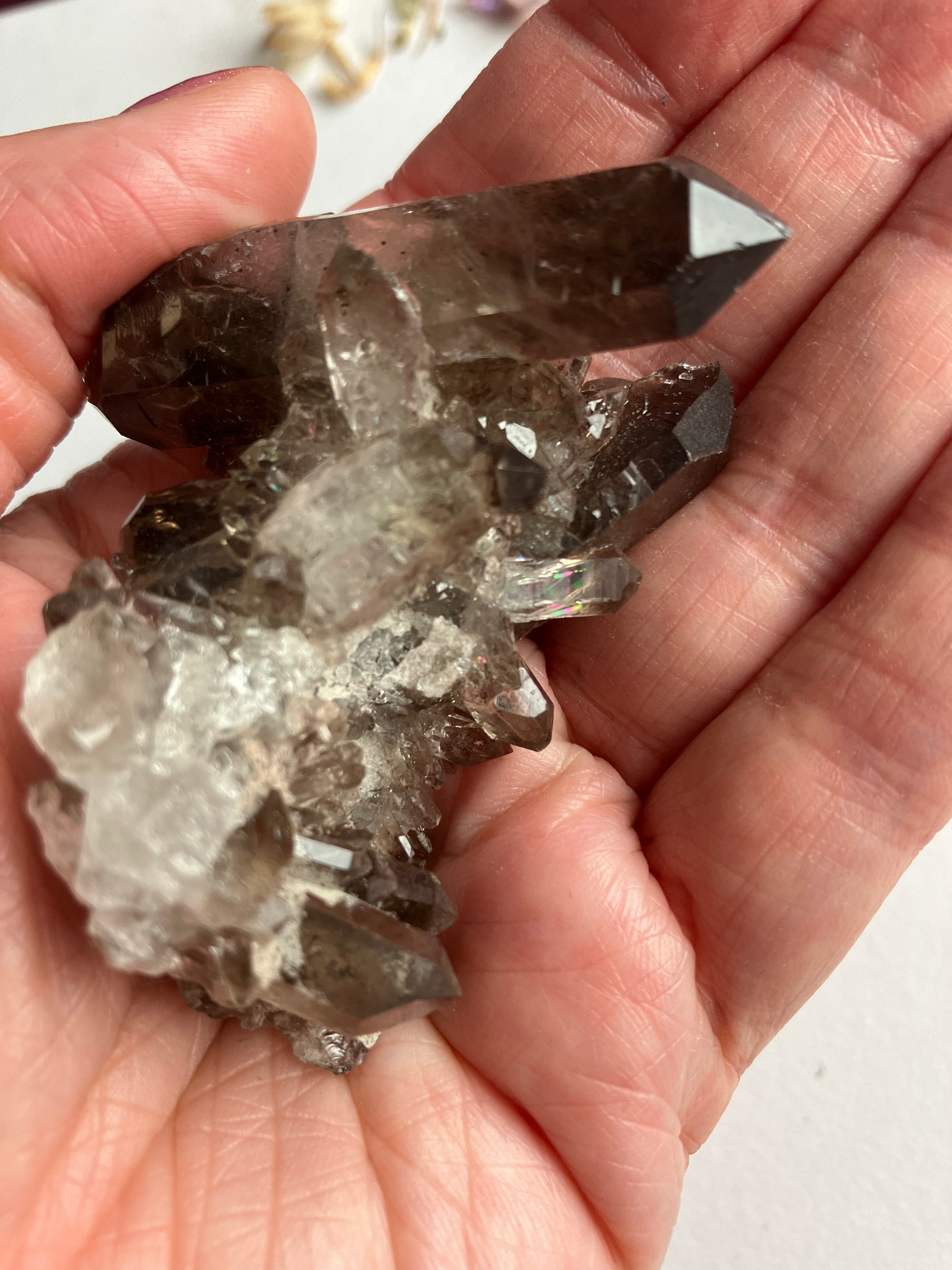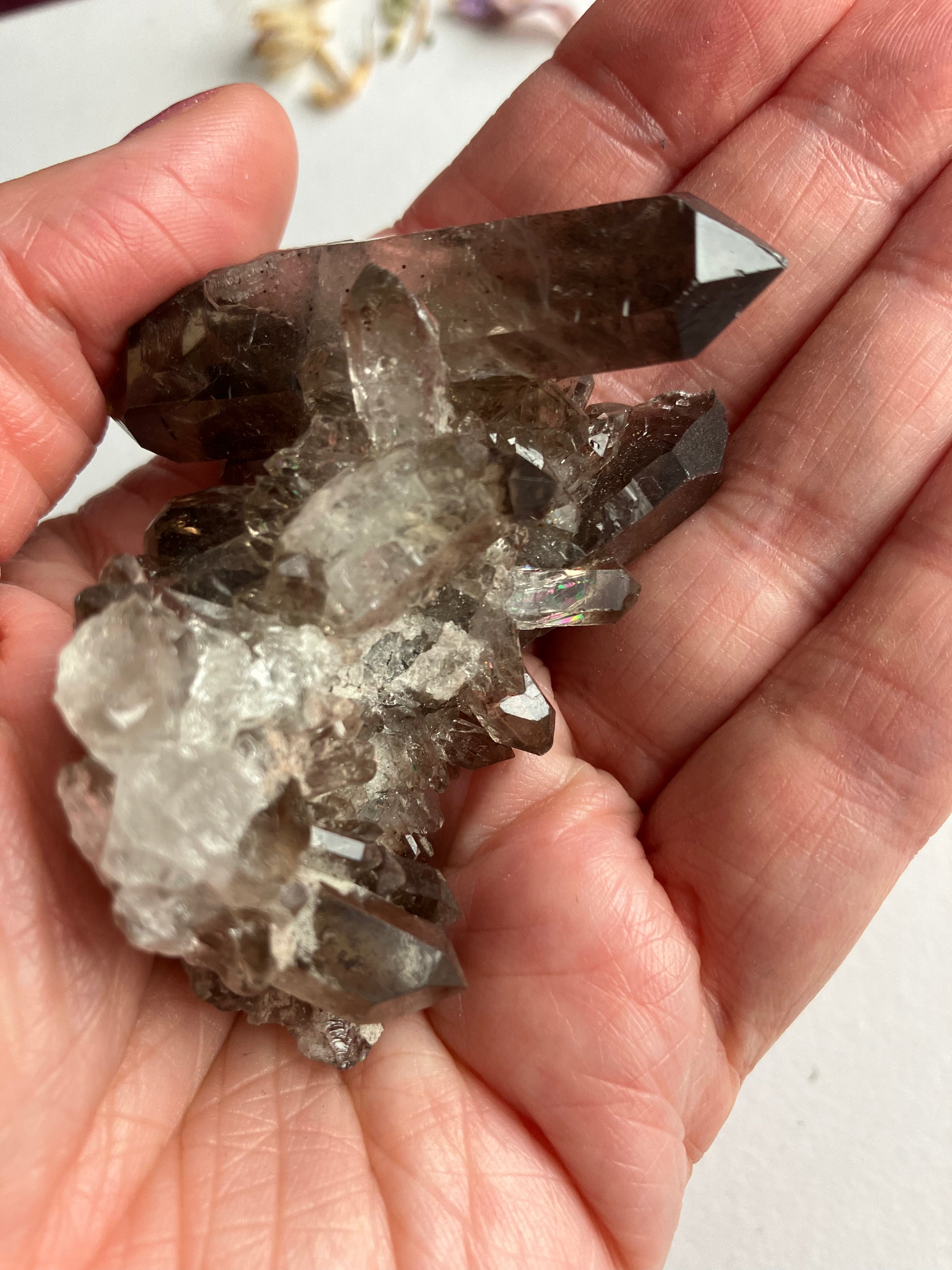 Smoky Quartz cluster with rare, lithium inclusions. Looking at this in different lights you can see rainbows and inclusions in the smaller points. Some of the inclusions are lithium, which has very strong anti anxiety properties. When put together the anti anxiety and depression energies of both smoky quartz and Lithium are strong, meaning this is a great Crystal for times of stress.. Smoky Quartz is one of my favourite crystals and the energy of these are just wonderful.