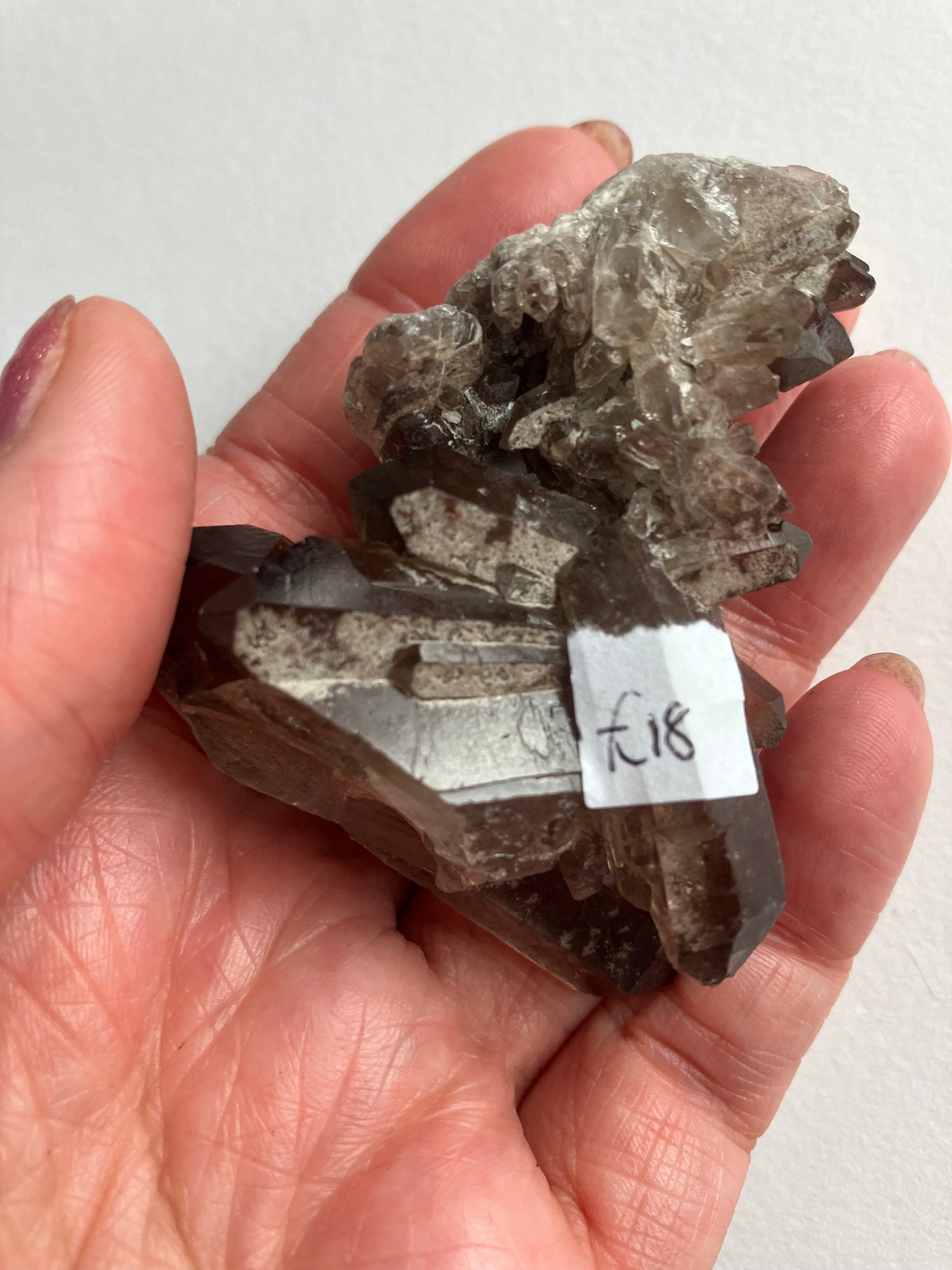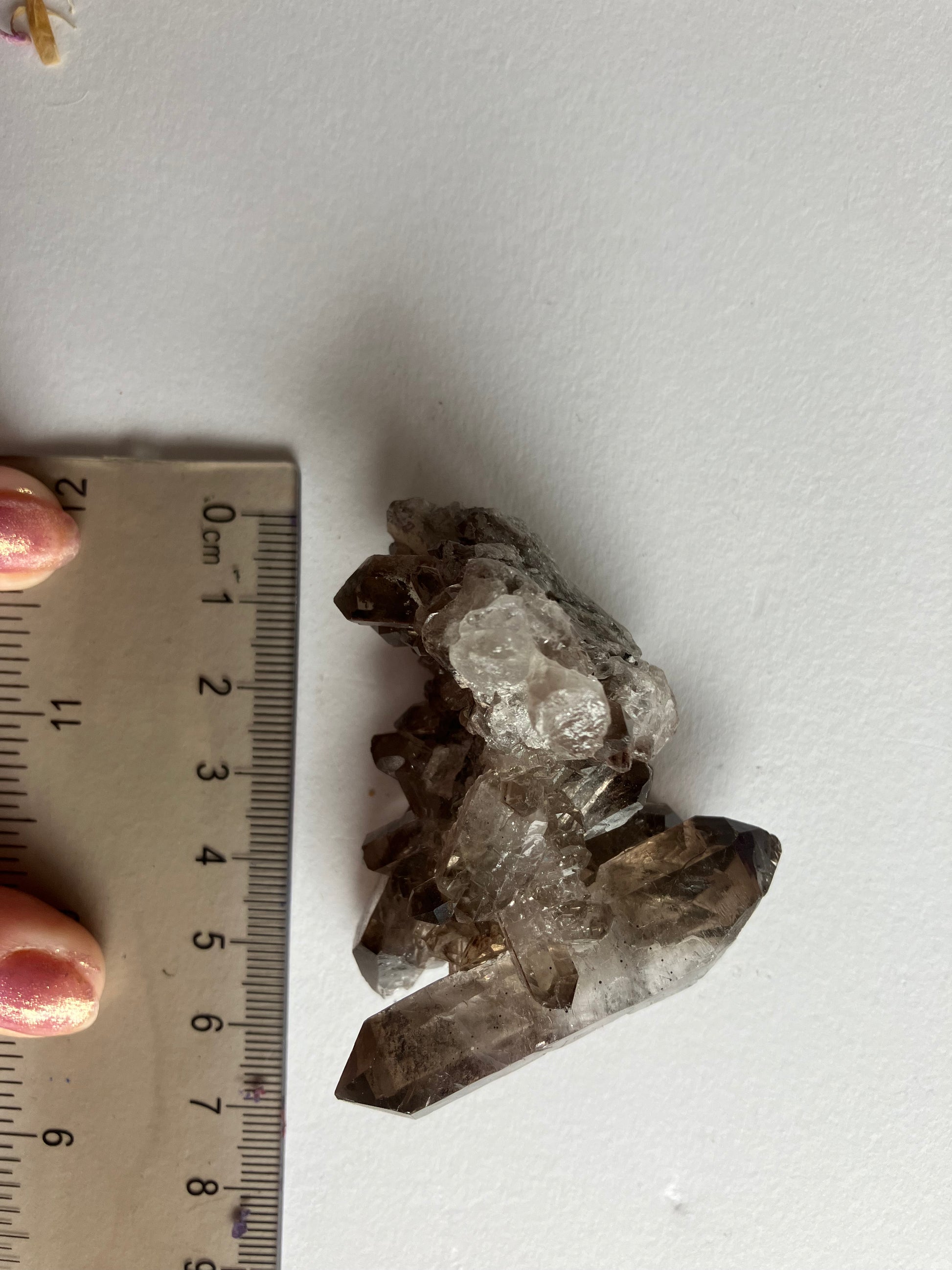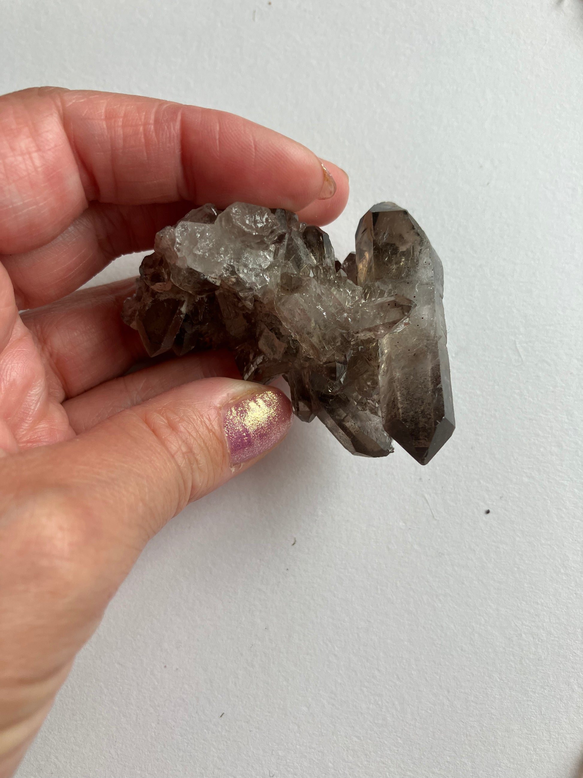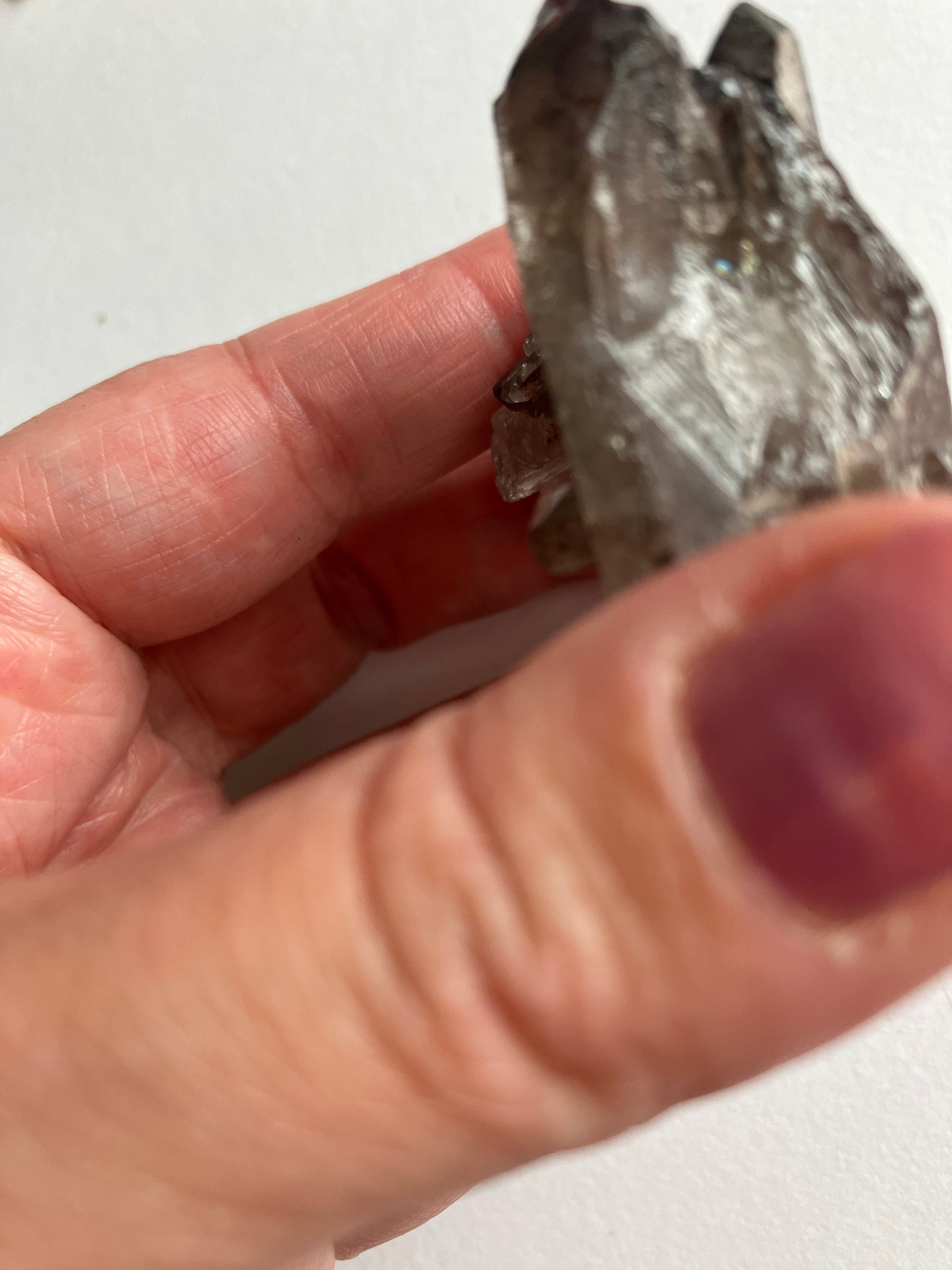 Smoky Quartz cluster with rare, lithium inclusions. Looking at this in different lights you can see rainbows and inclusions in the smaller points. Some of the inclusions are lithium, which has very strong anti anxiety properties. When put together the anti anxiety and depression energies of both smoky quartz and Lithium are strong, meaning this is a great Crystal for times of stress.. Smoky Quartz is one of my favourite crystals and the energy of these are just wonderful.