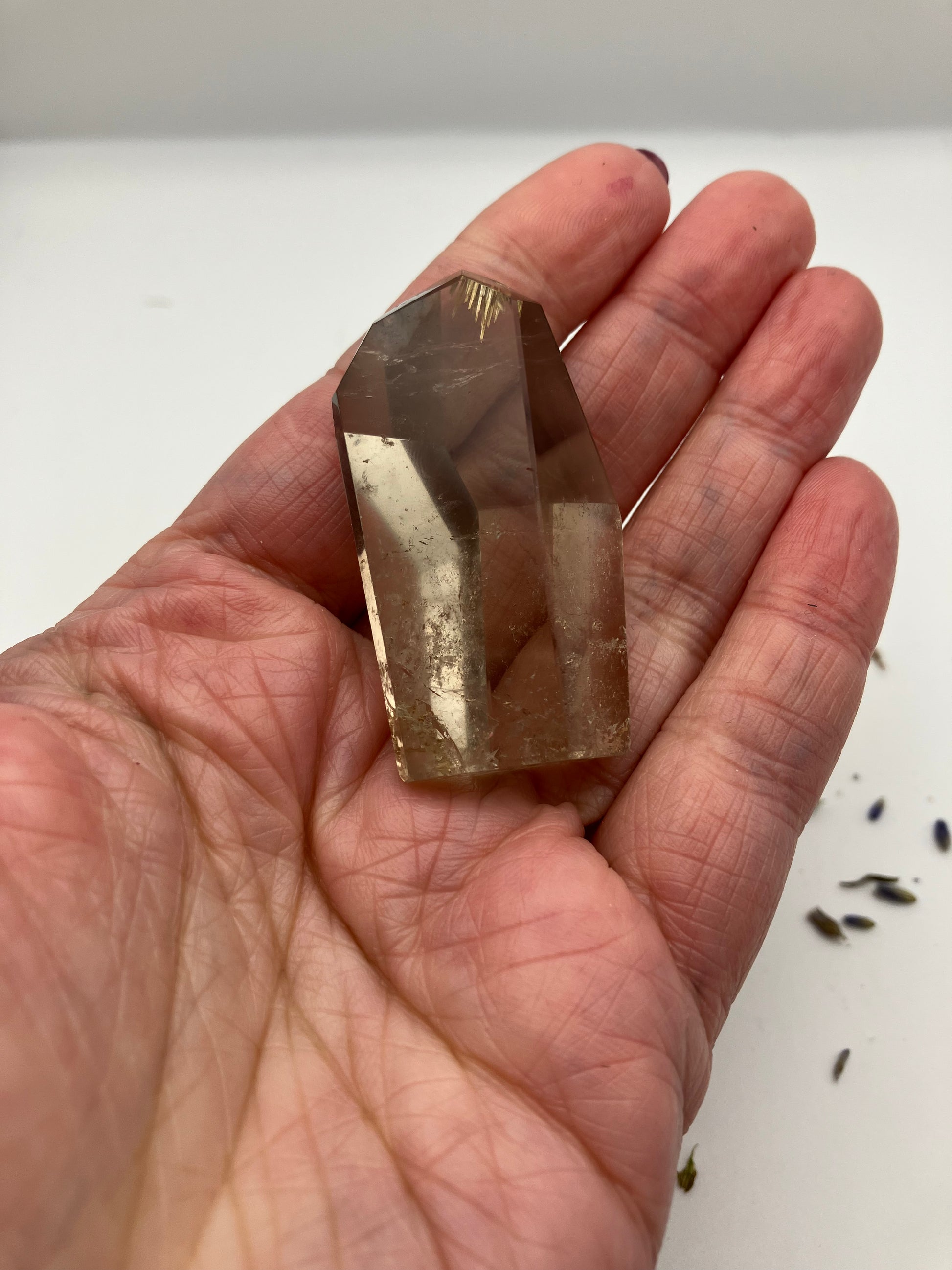 AAA Grade Smoky Quartz polished freeform. I am in LOVE with these! The energy is light yet grounding and the clarity is beautiful and they have wonderful inclusions to be looked at in the sunlight for days! The inclusions remind me of soft desert plains when the breeze blows the sand. This one has interesting golden needle like inclusions at the top. The energy is strong yet gentle and has serious anti-anxiety feelings! Smoky Quartz is one of my favourite crystals and the energy of these are just wonderful.