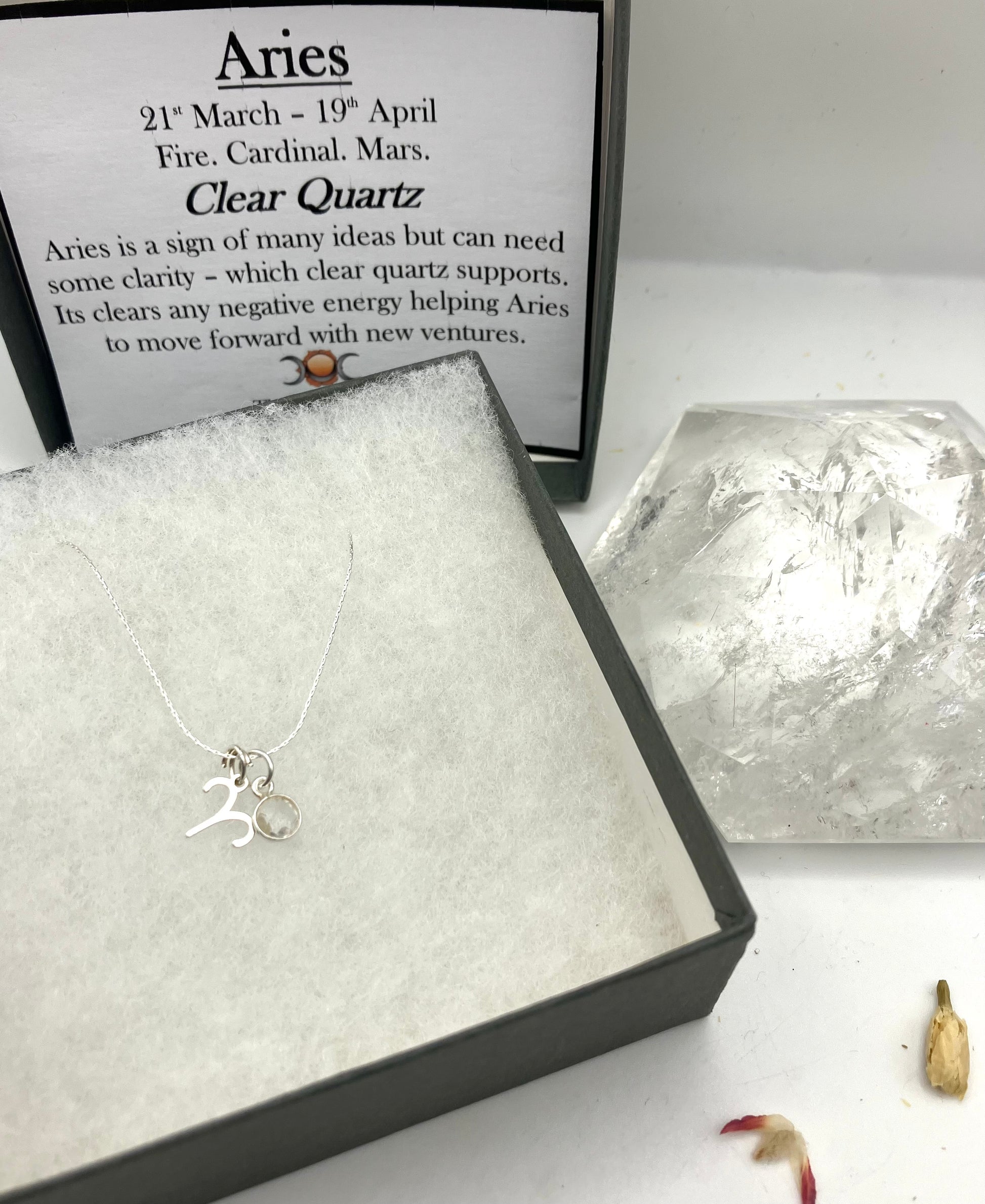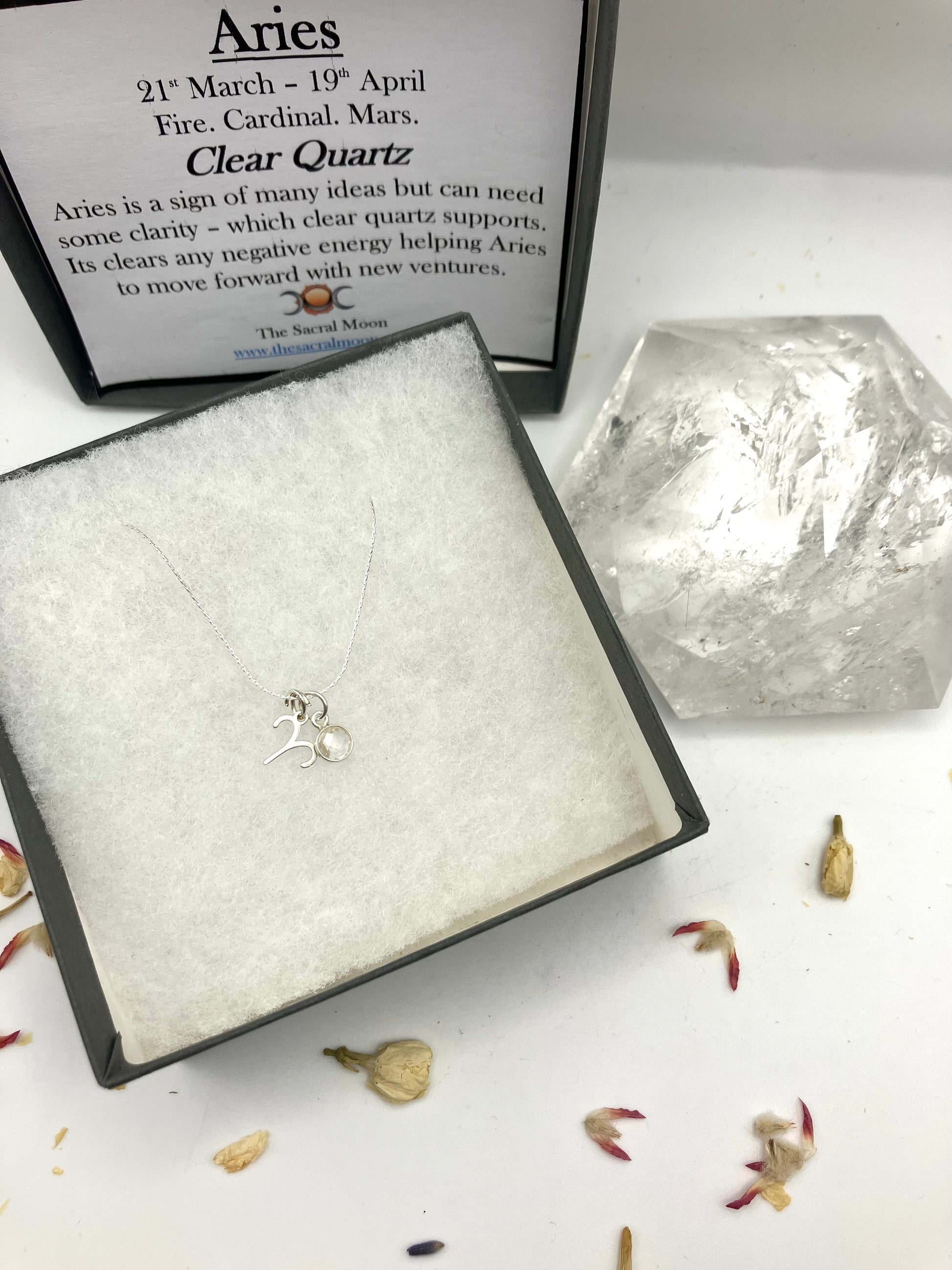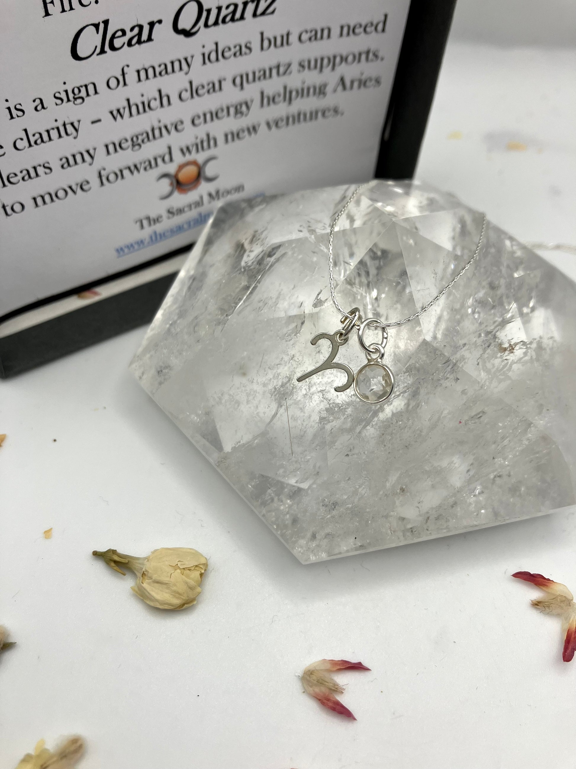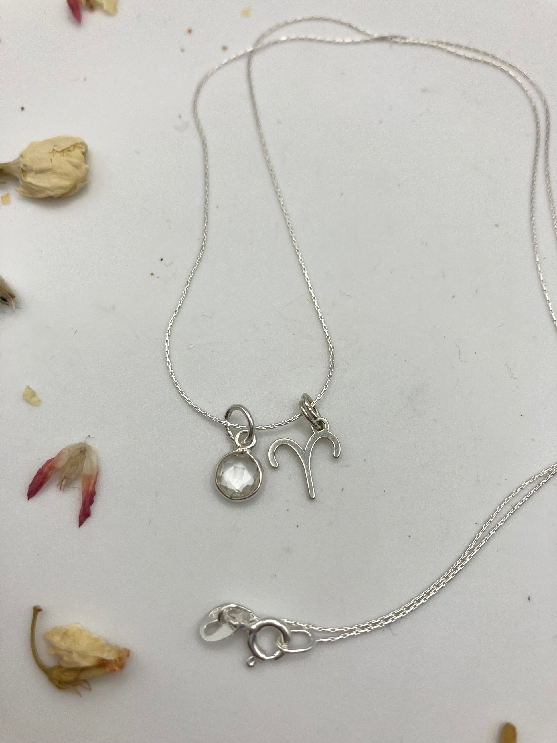 Sterling Silver Aries Necklace with Clear Quartz gem charm.
