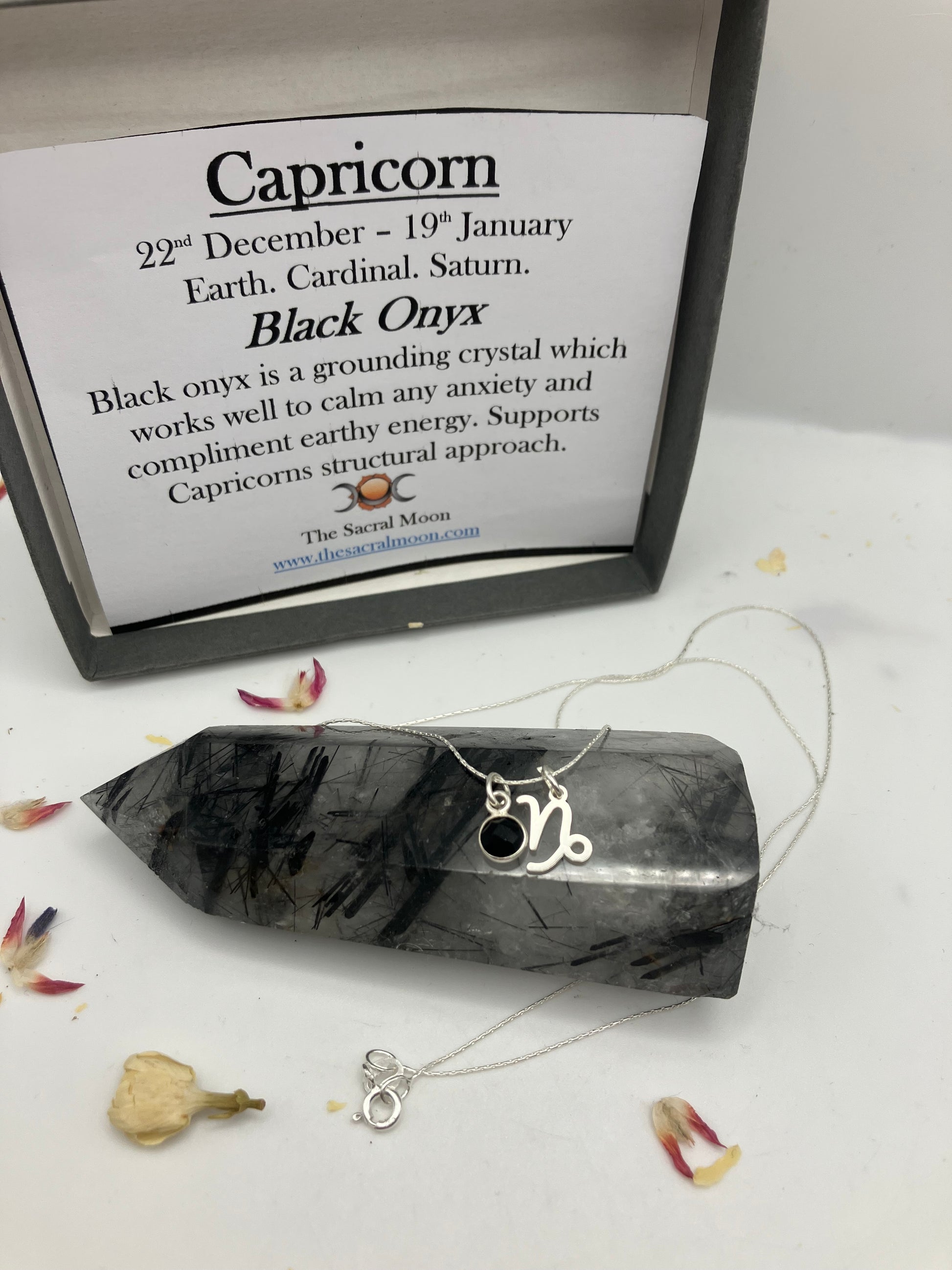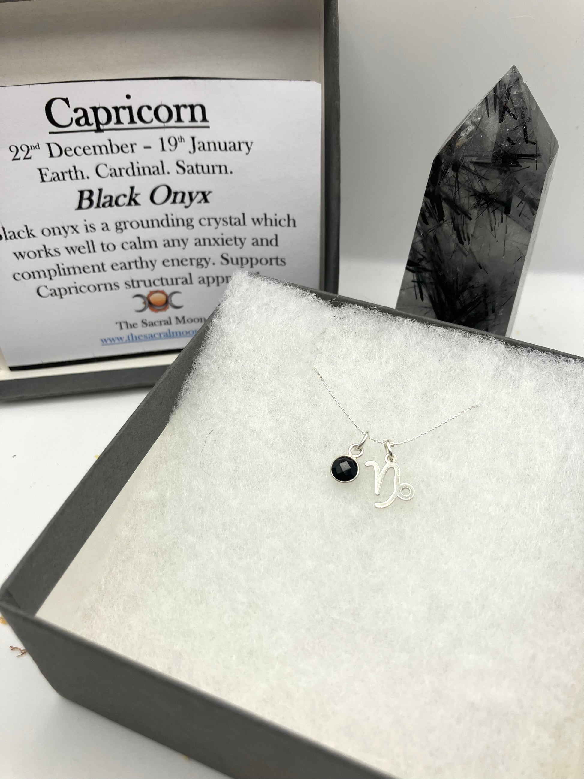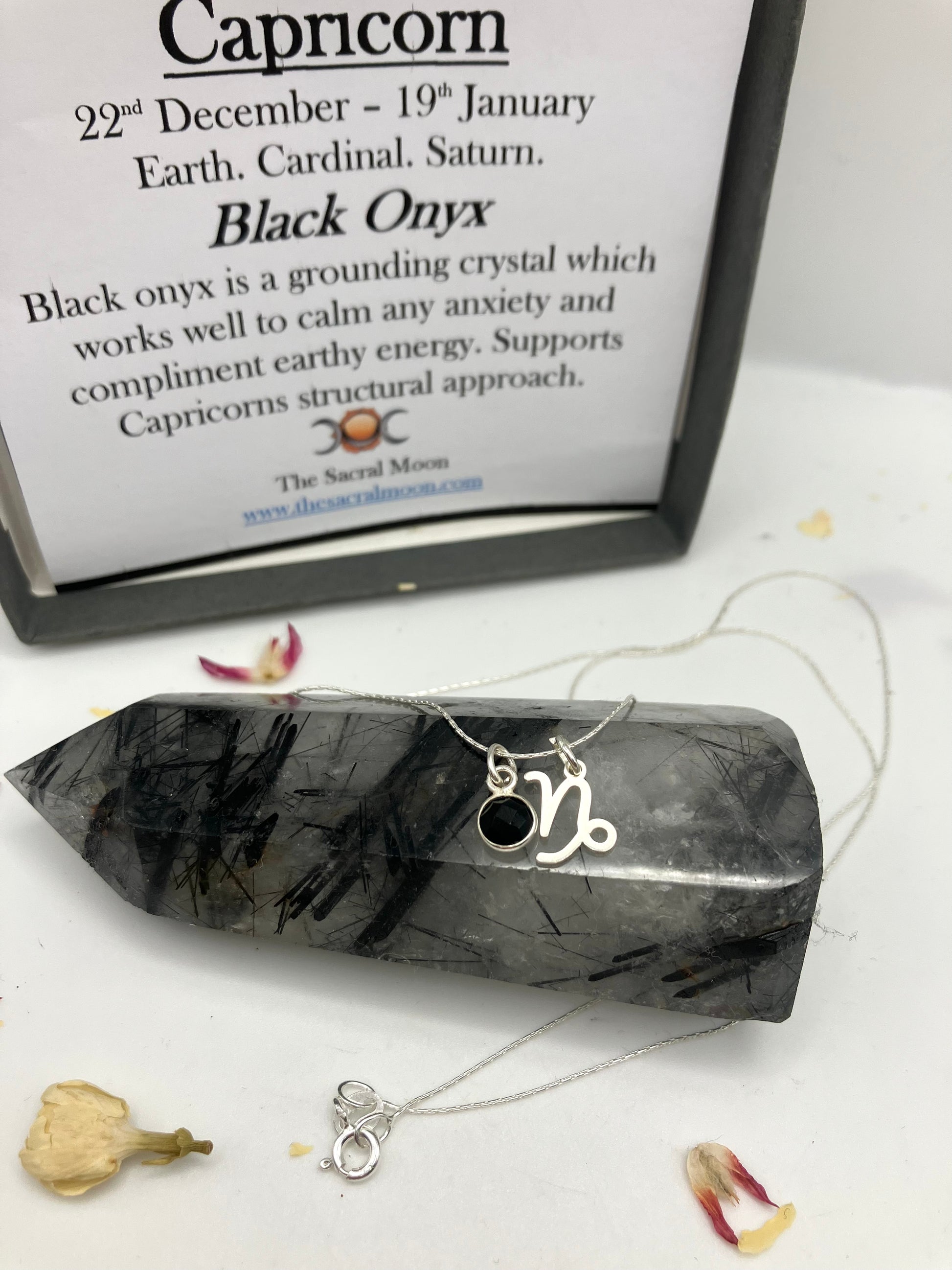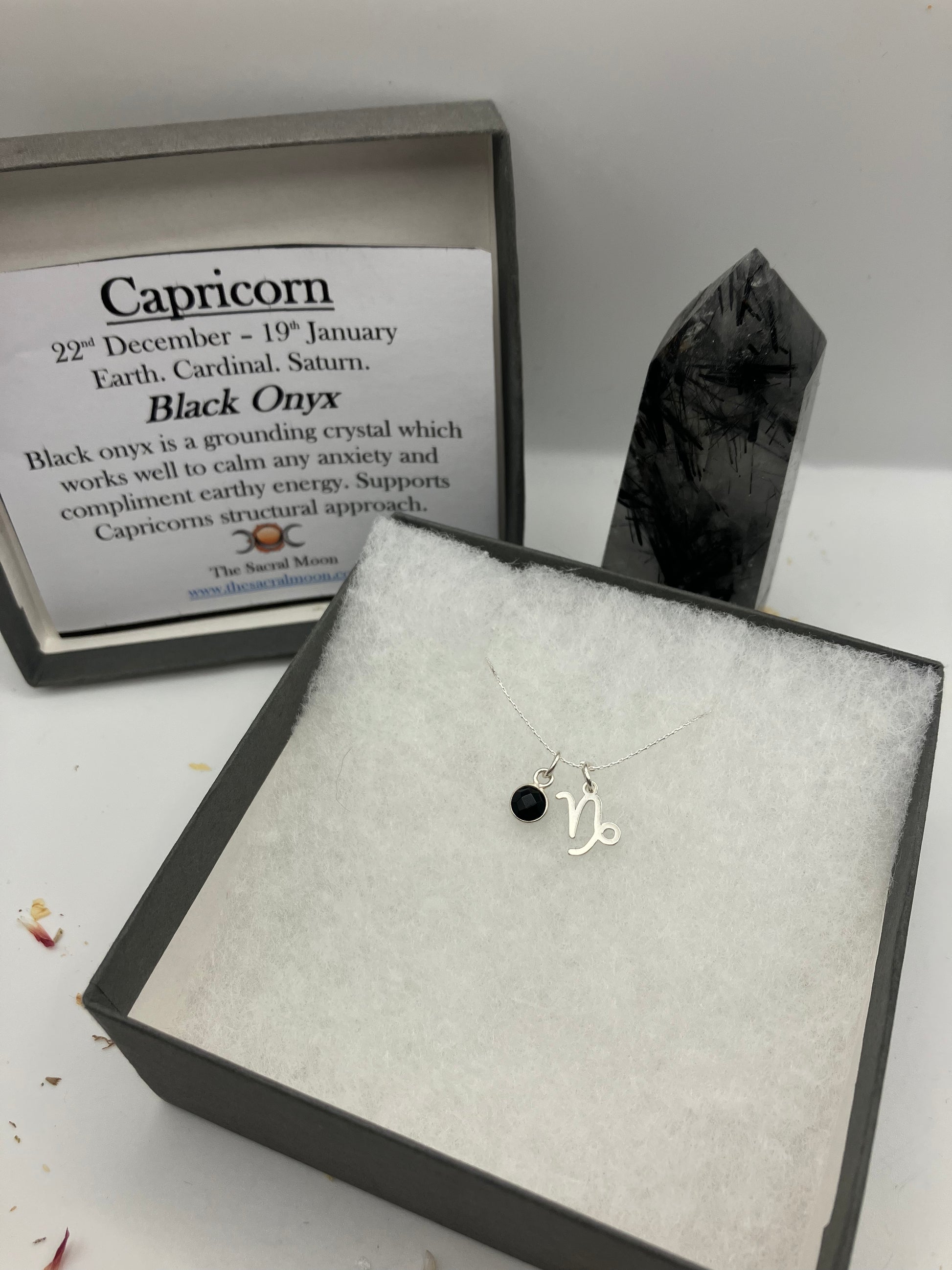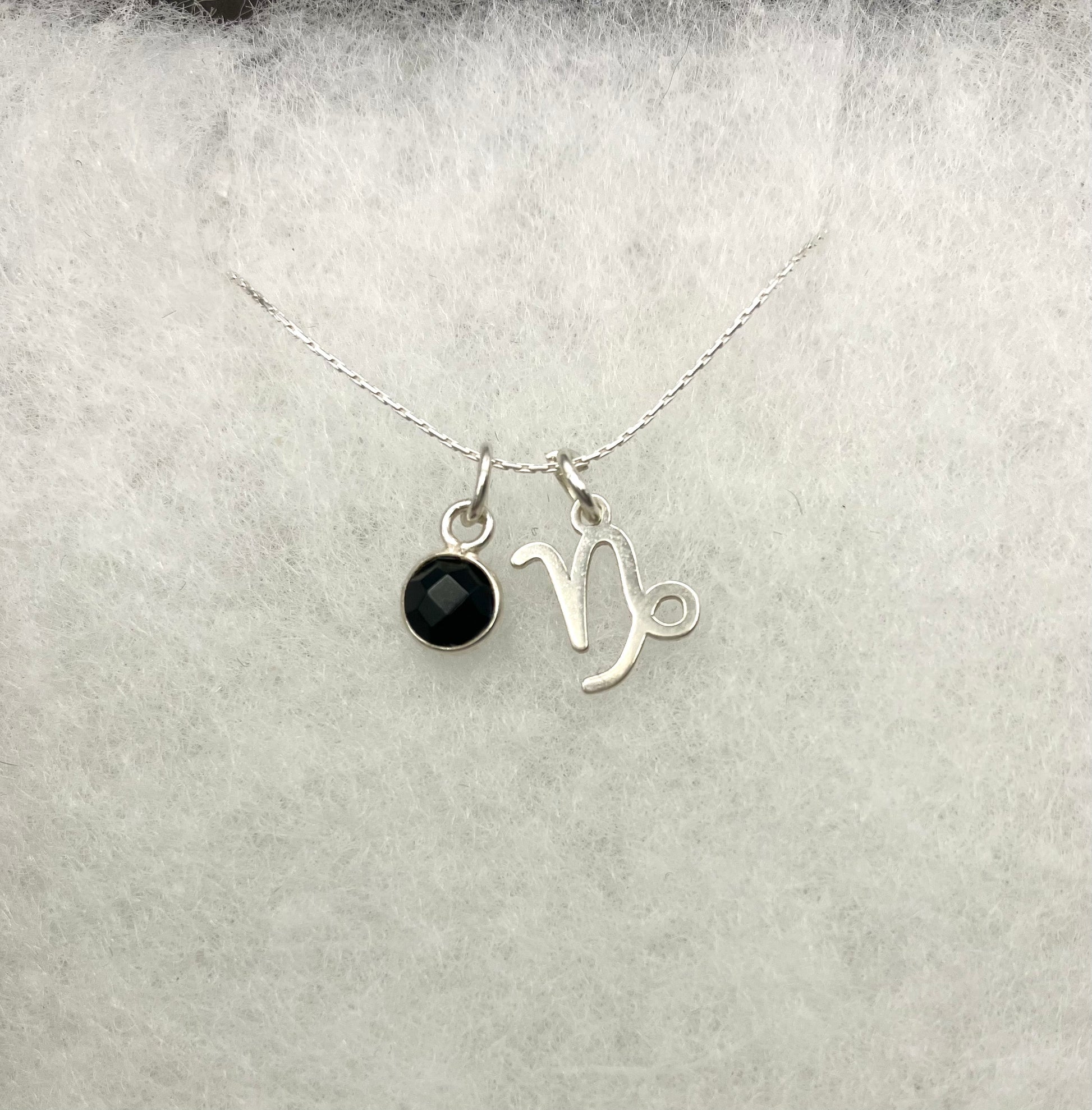 Sterling Silver Capricorn Necklace with black onyx gem charm.