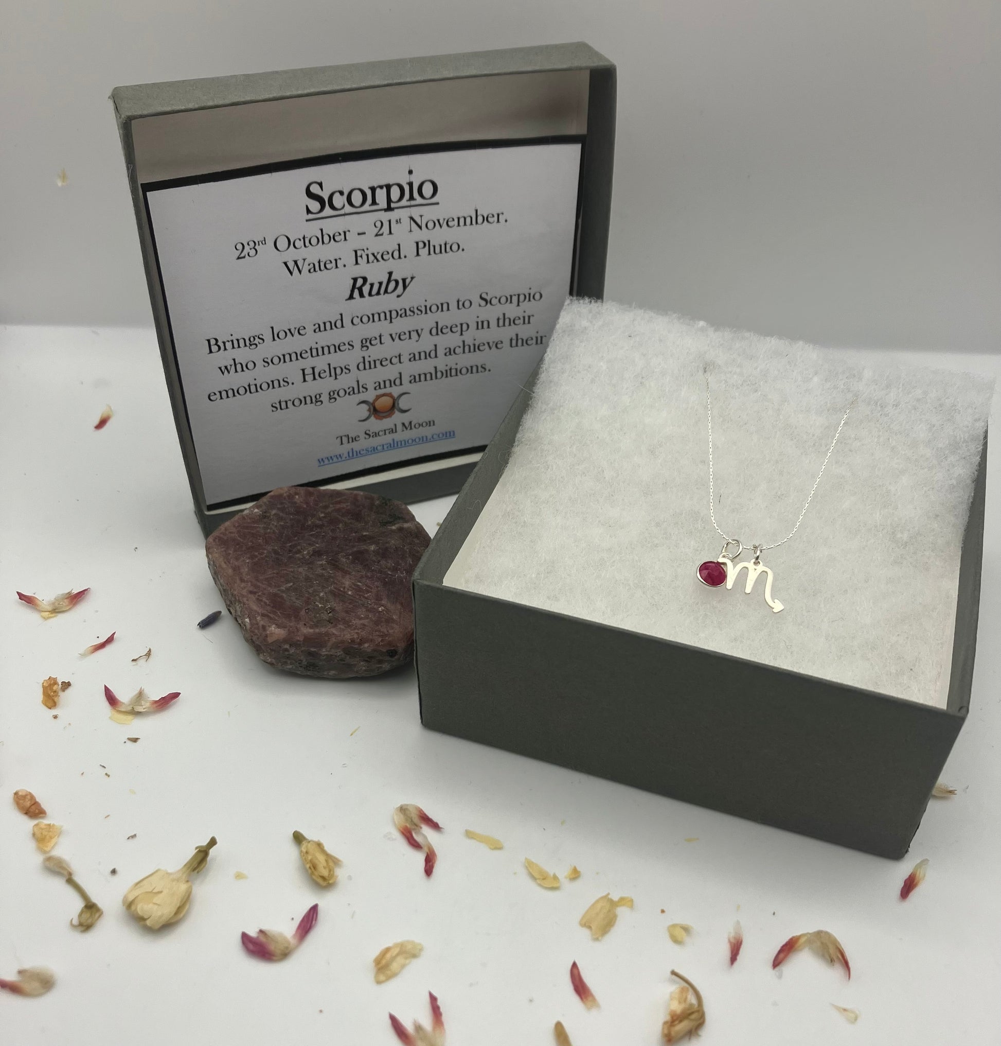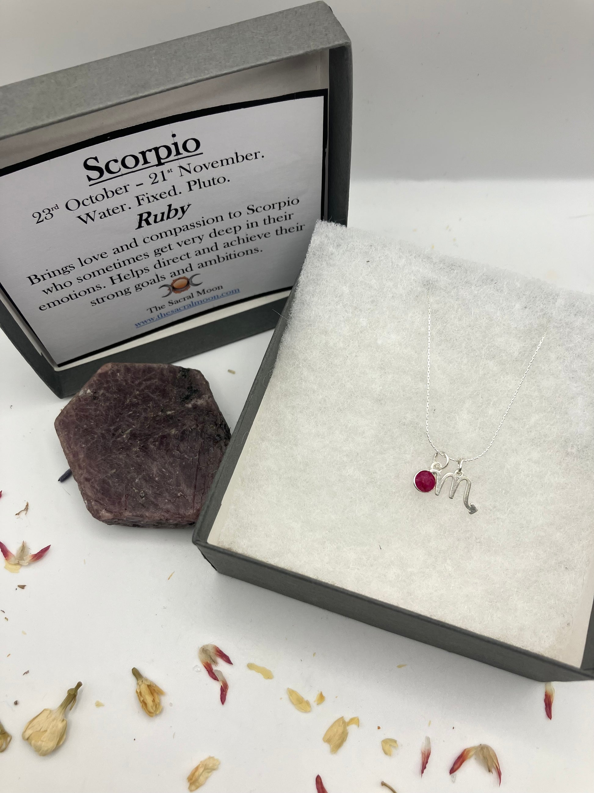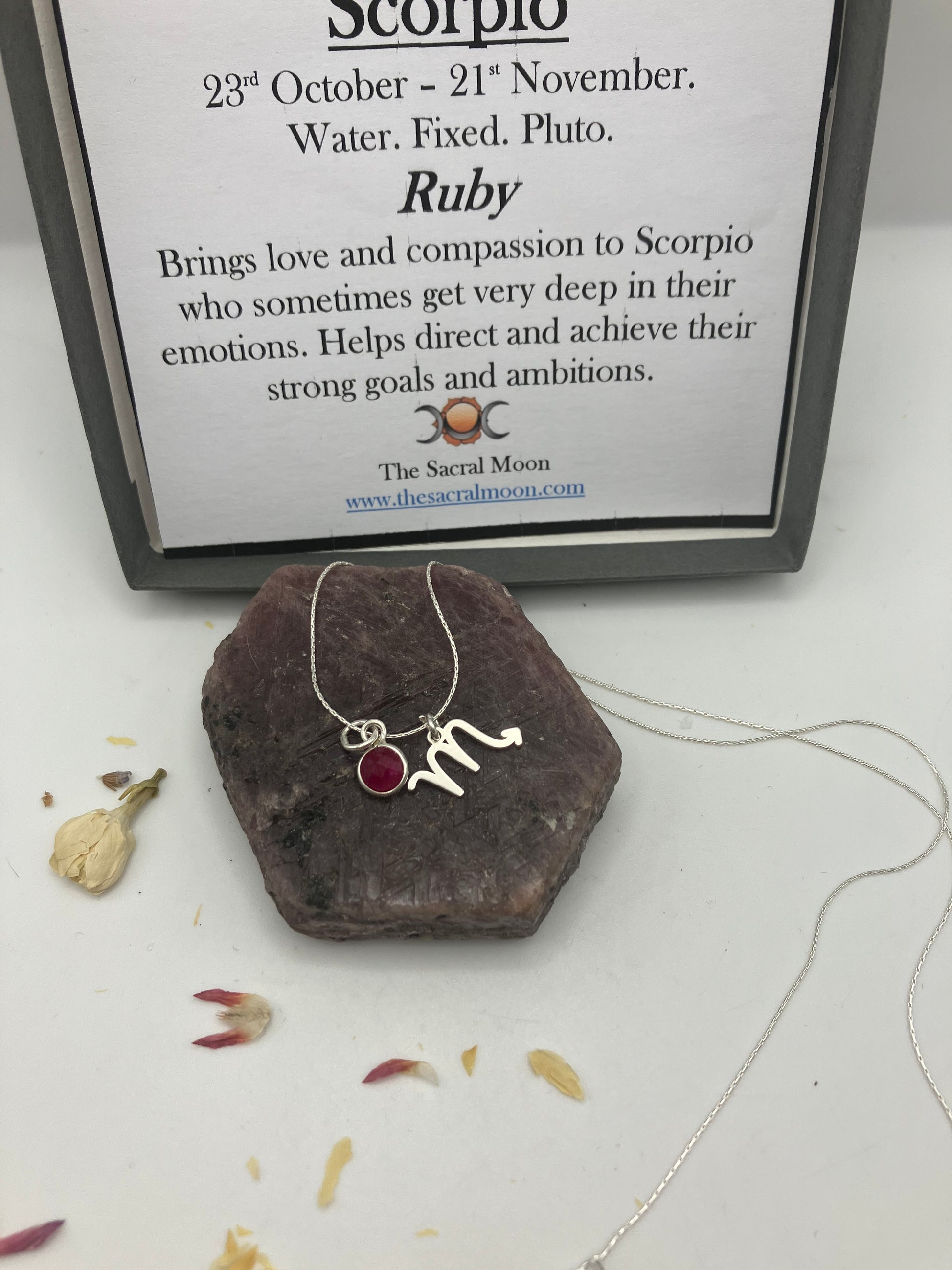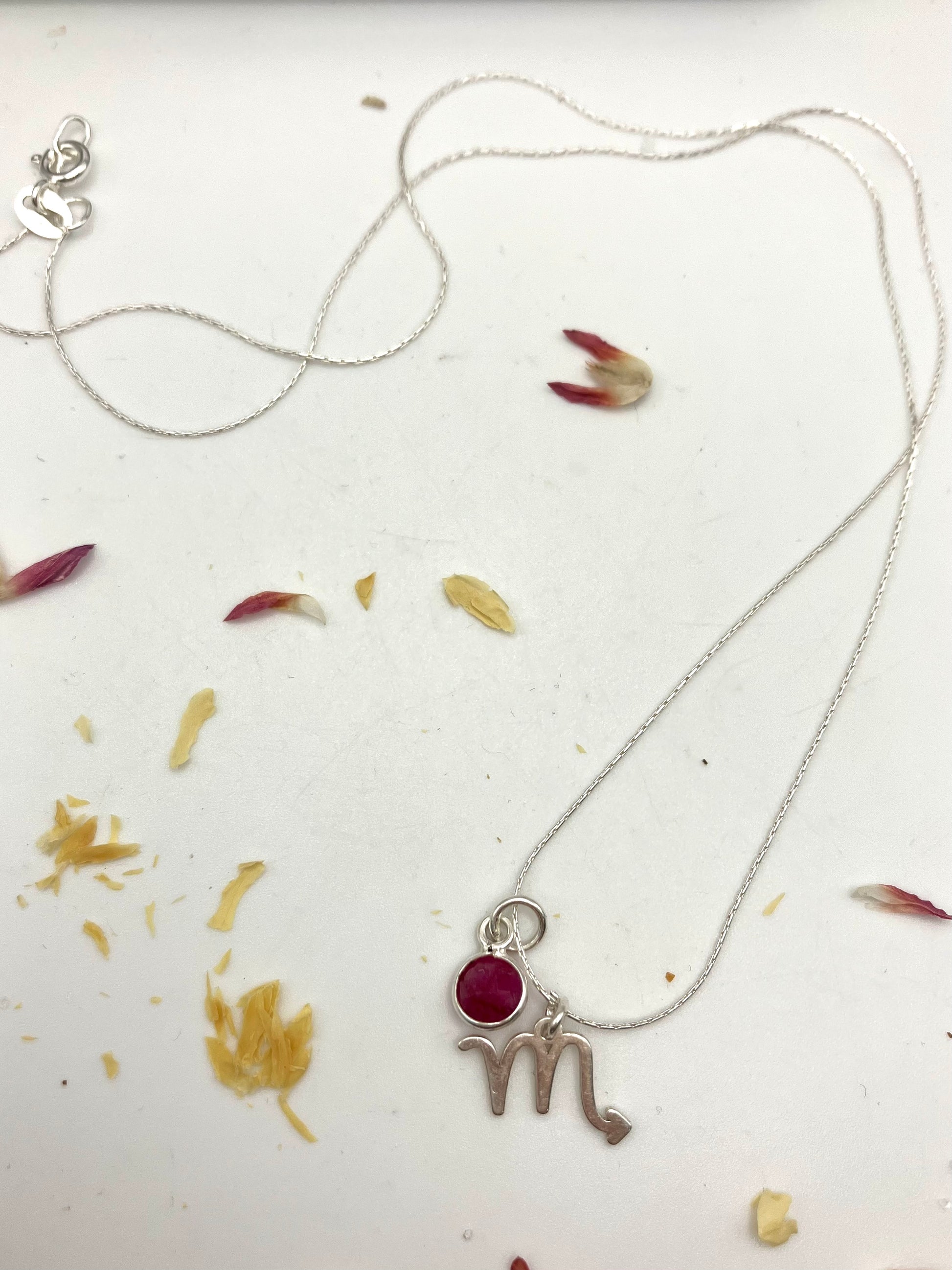 Sterling Silver Scorpio Necklace with Ruby gem charm
