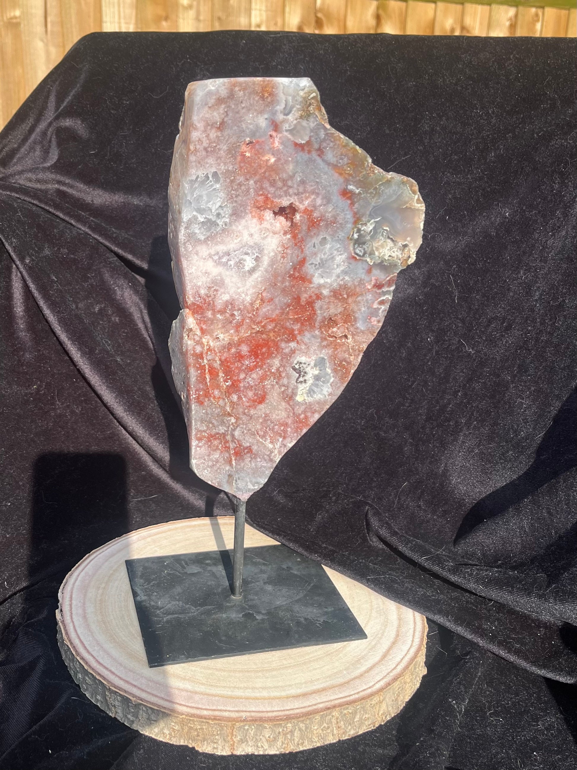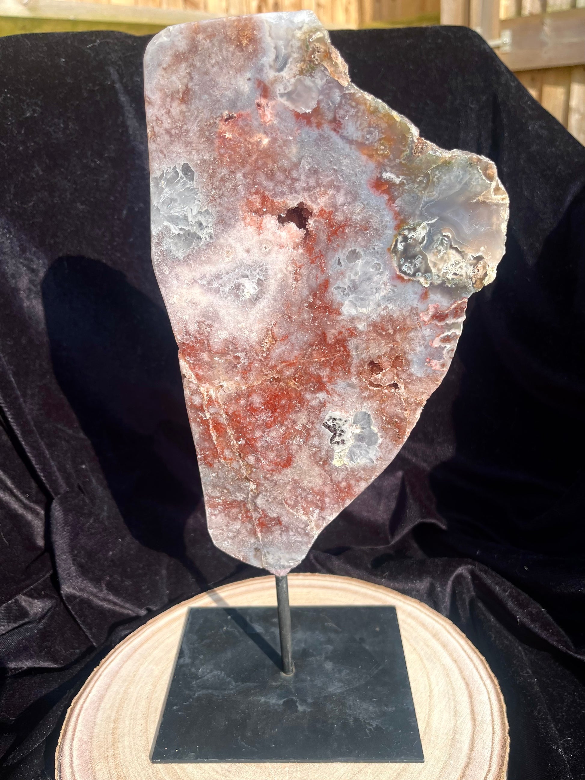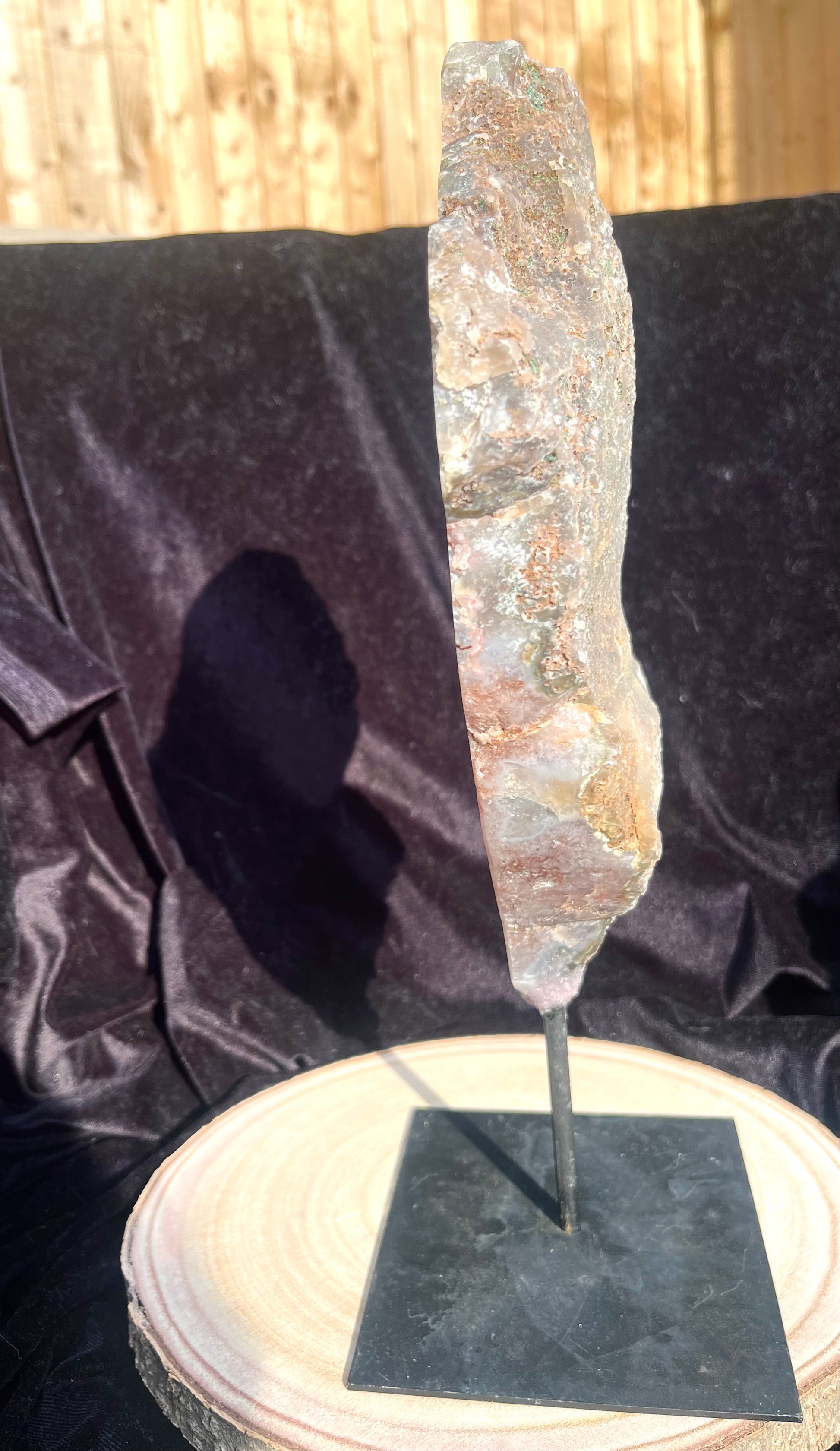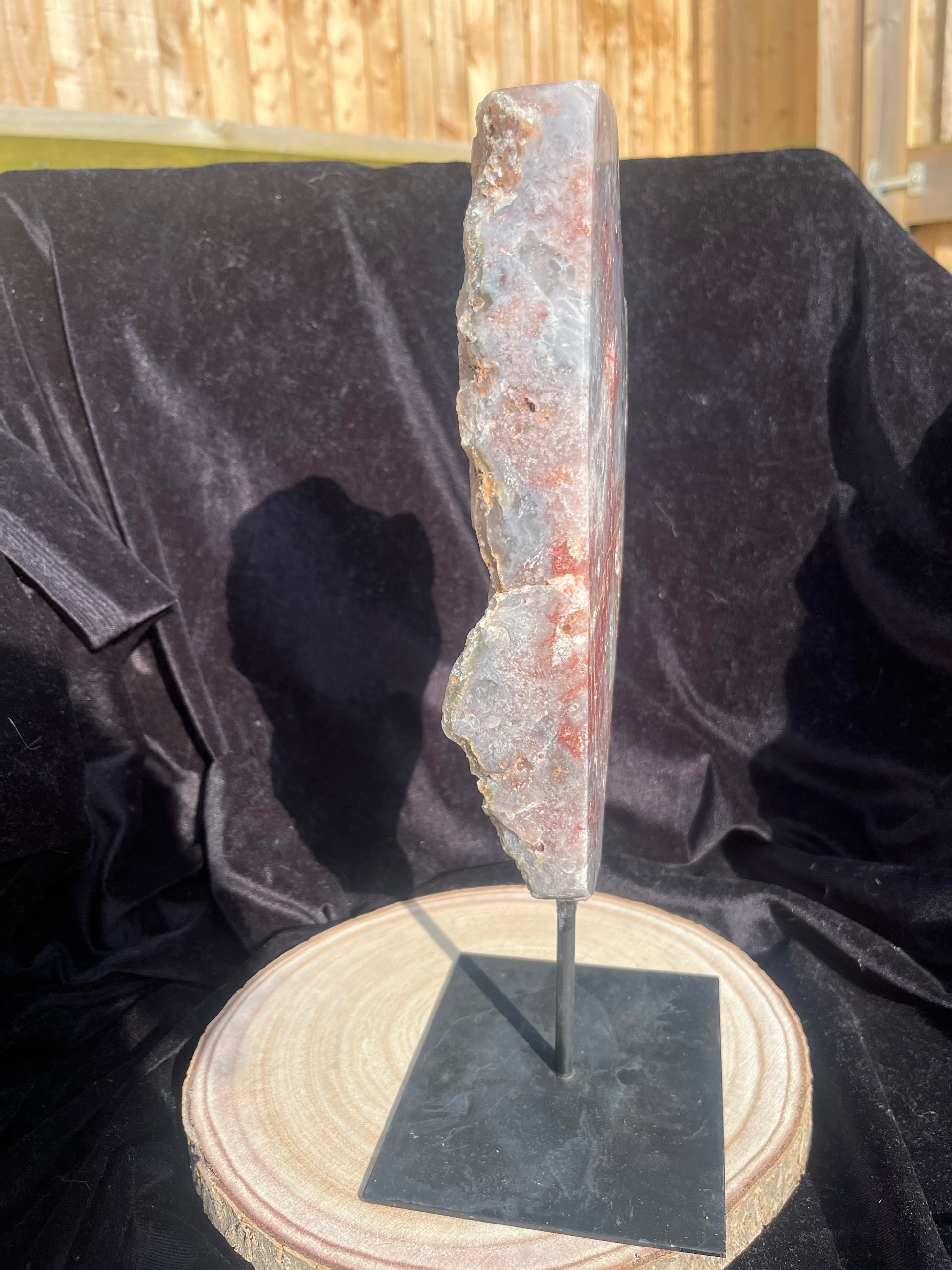 Stunning polished slice with pink amethyst, clear quartz and agate on stand.