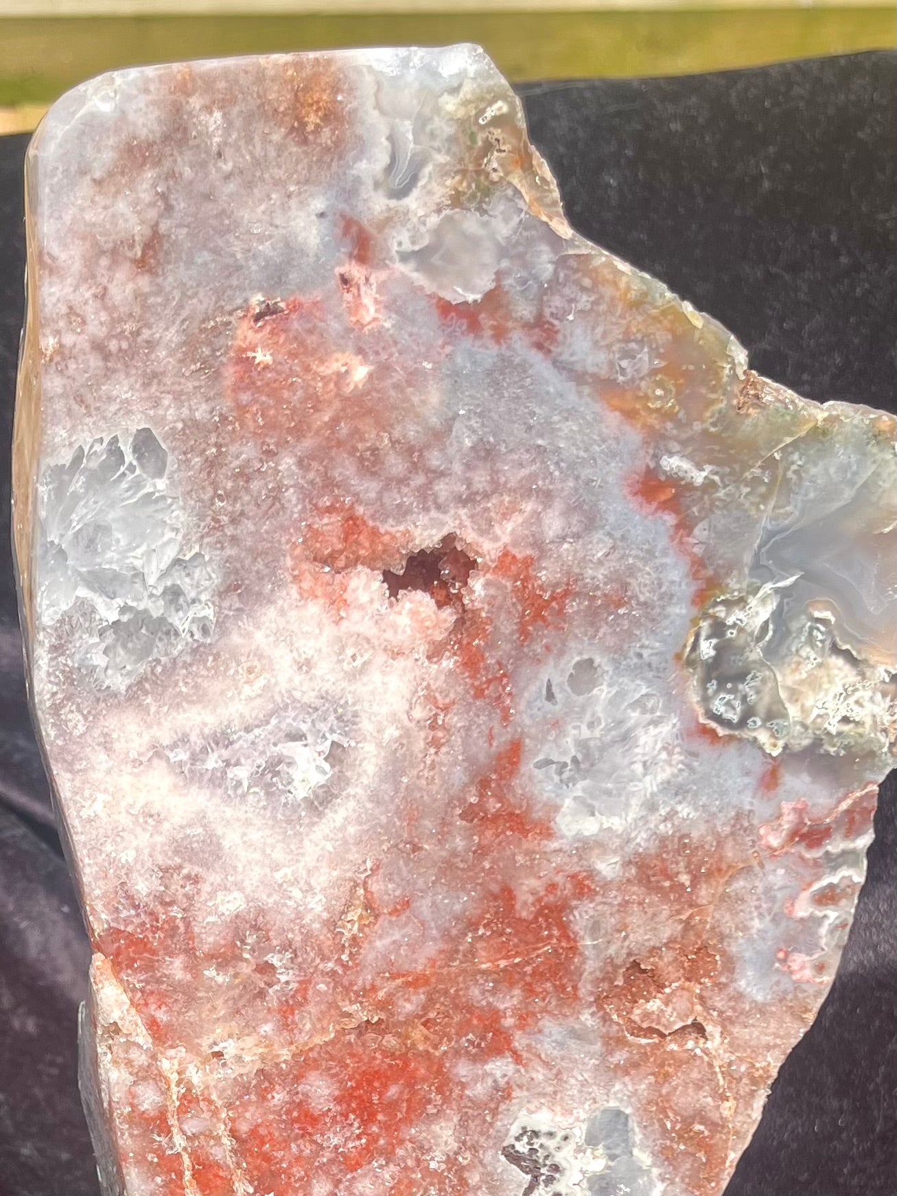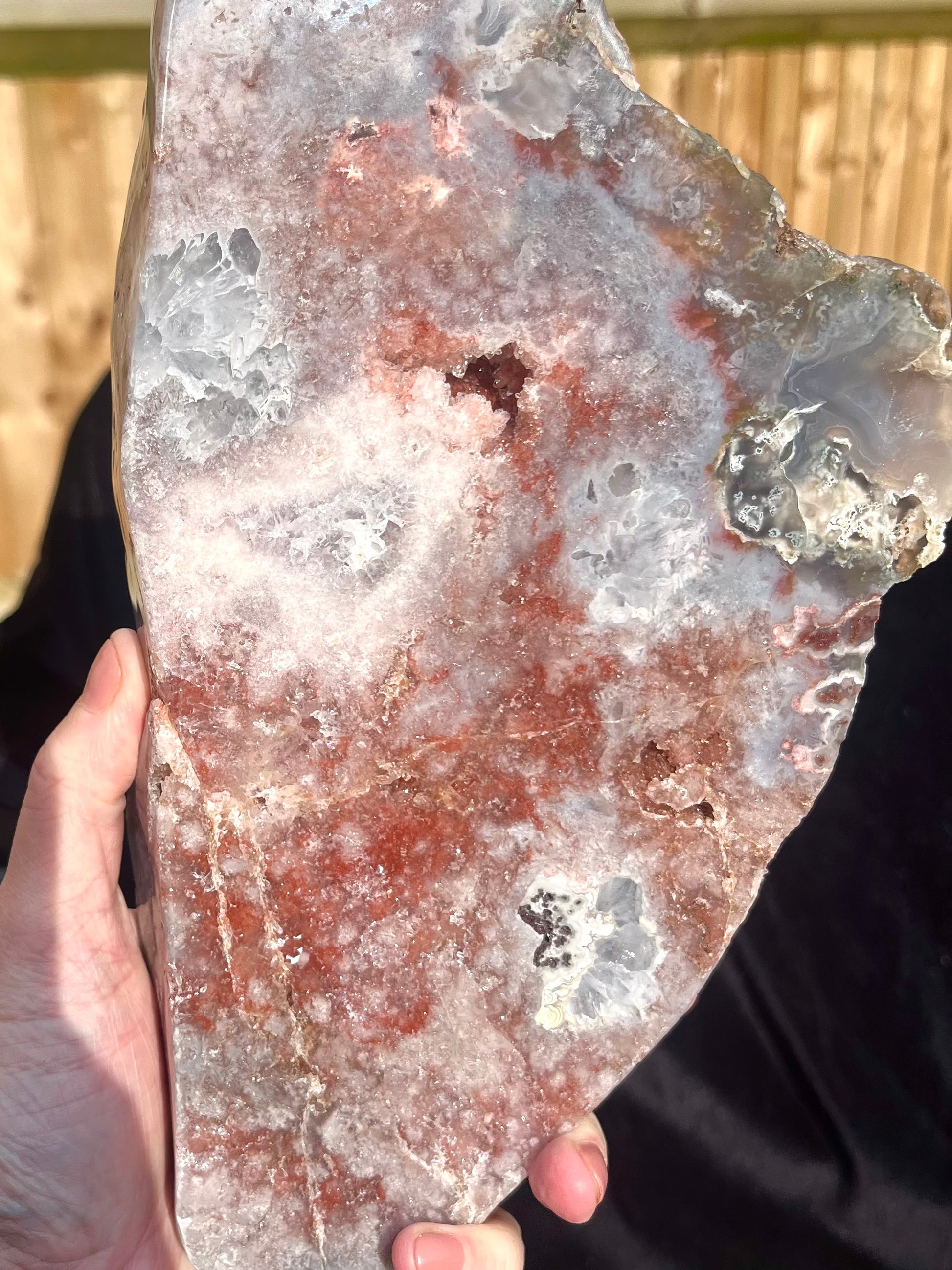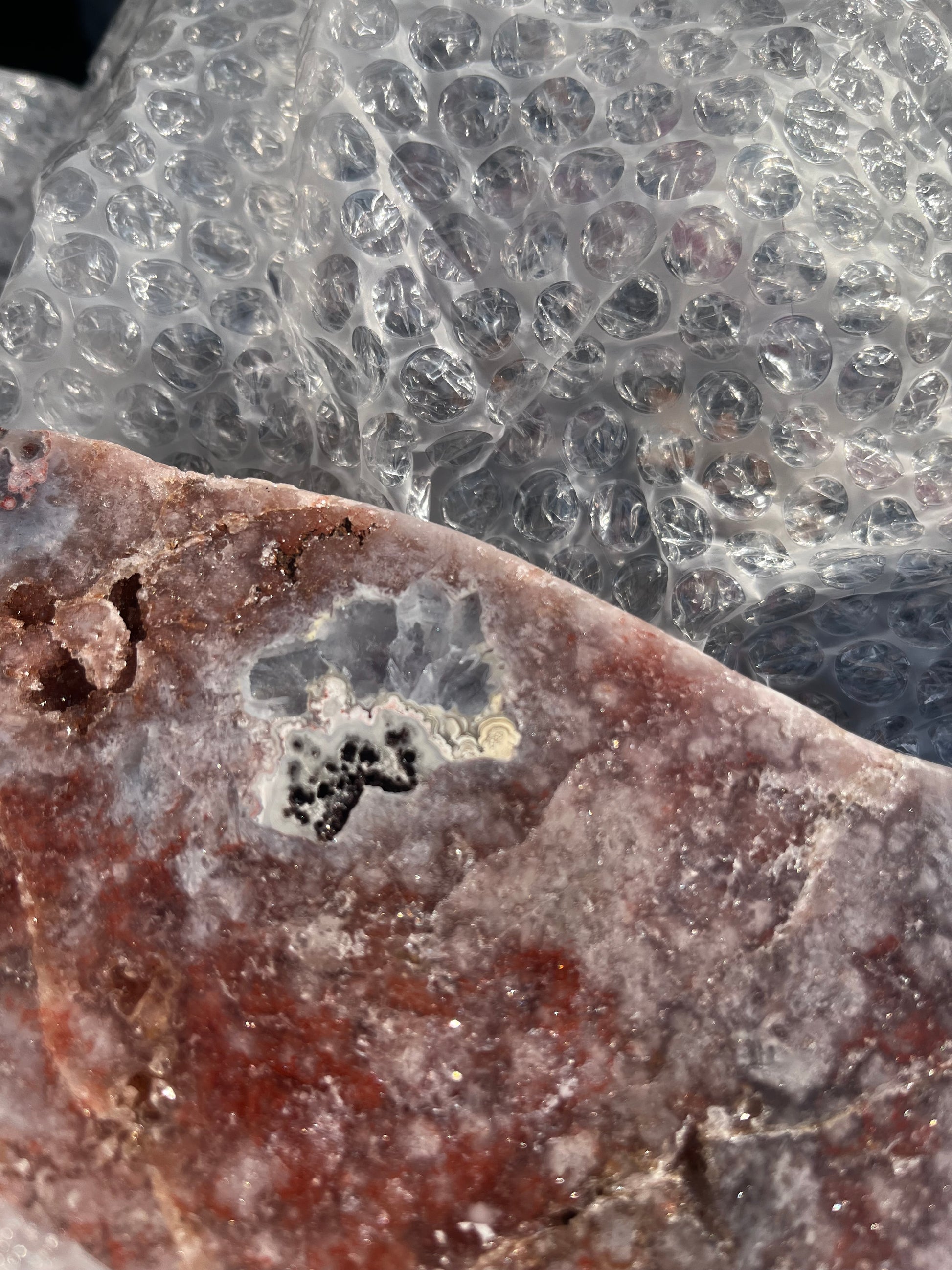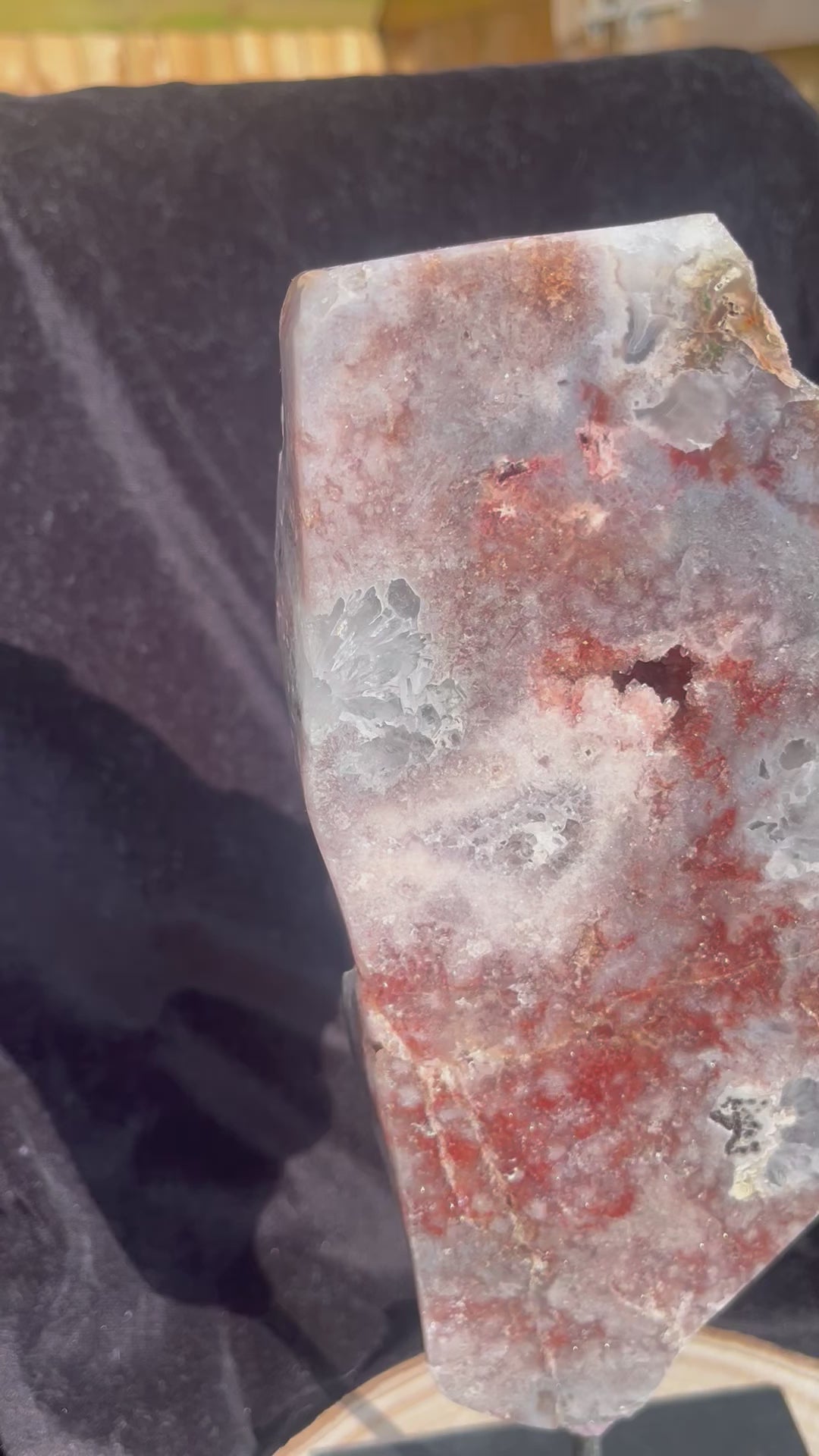 Stunning polished slice with pink amethyst, clear quartz and agate on stand.